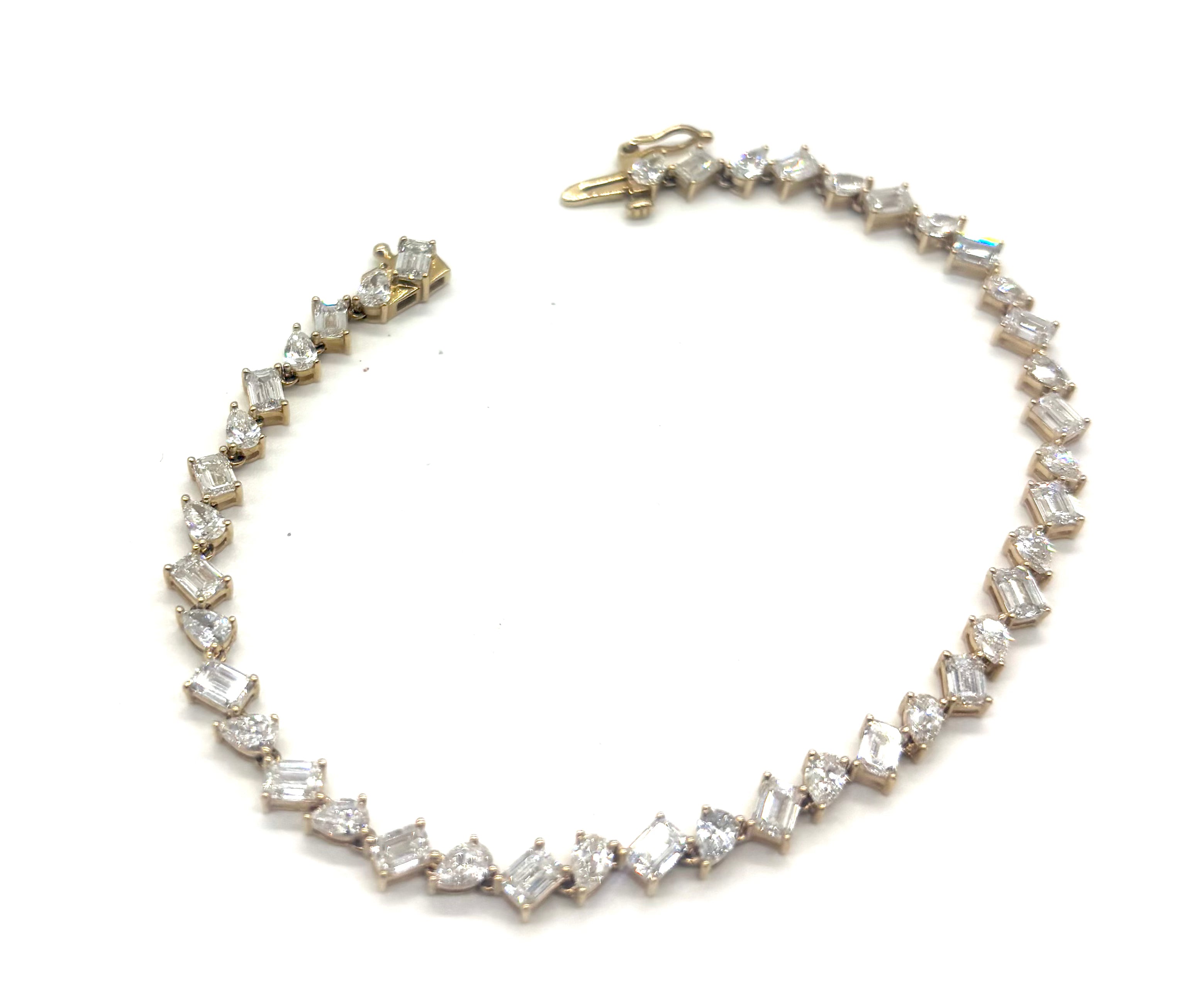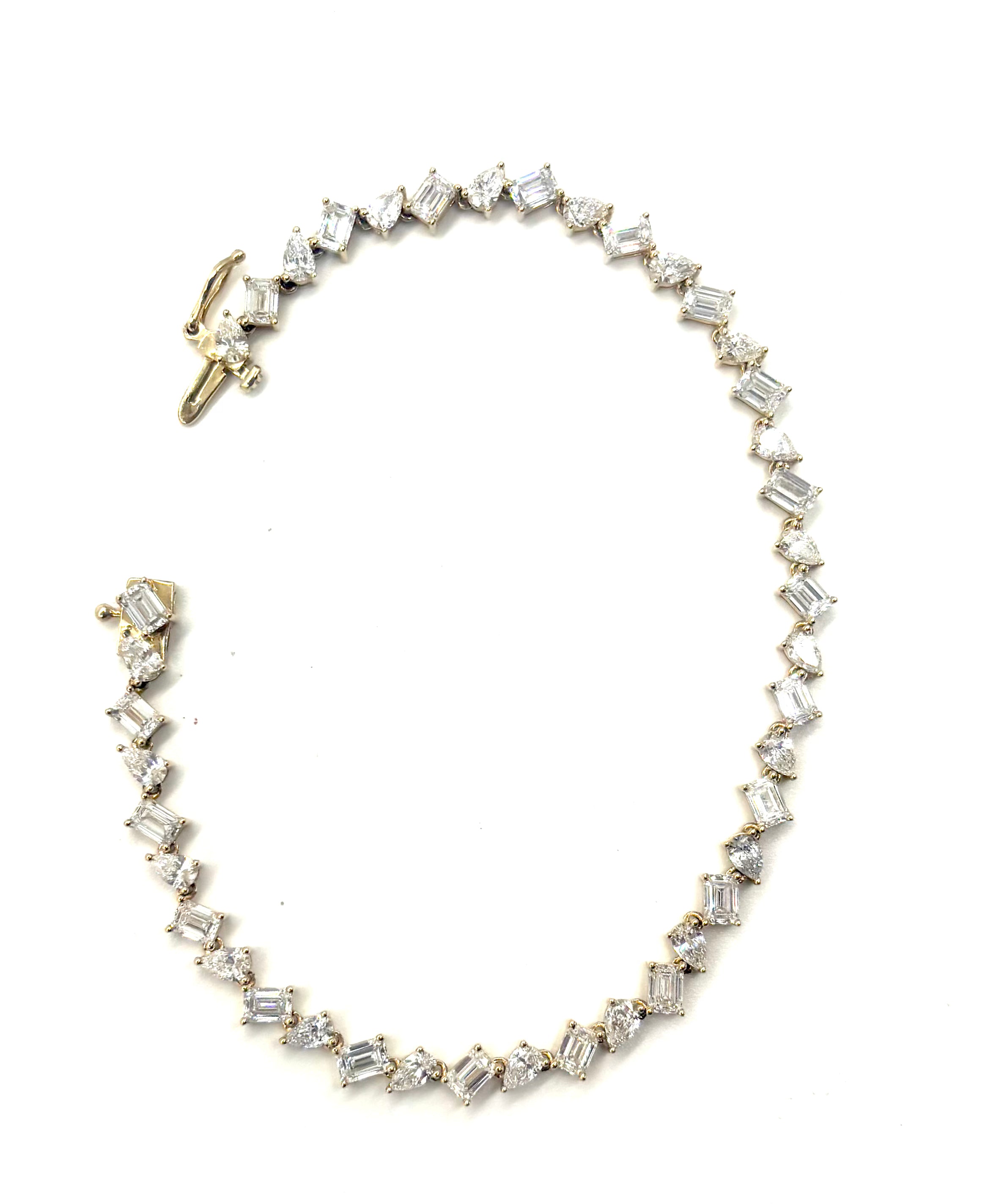 Elevate your jewelry collection with this stunning 14K yellow gold diamond bracelet, designed to make a statement with timeless elegance. Featuring an eye-catching combination of emerald and pear cut lab grown diamonds, this bracelet sparkles with a total of 6.50 carats of brilliance. The alternating shapes create a sophisticated, modern look while maintaining classic appeal.