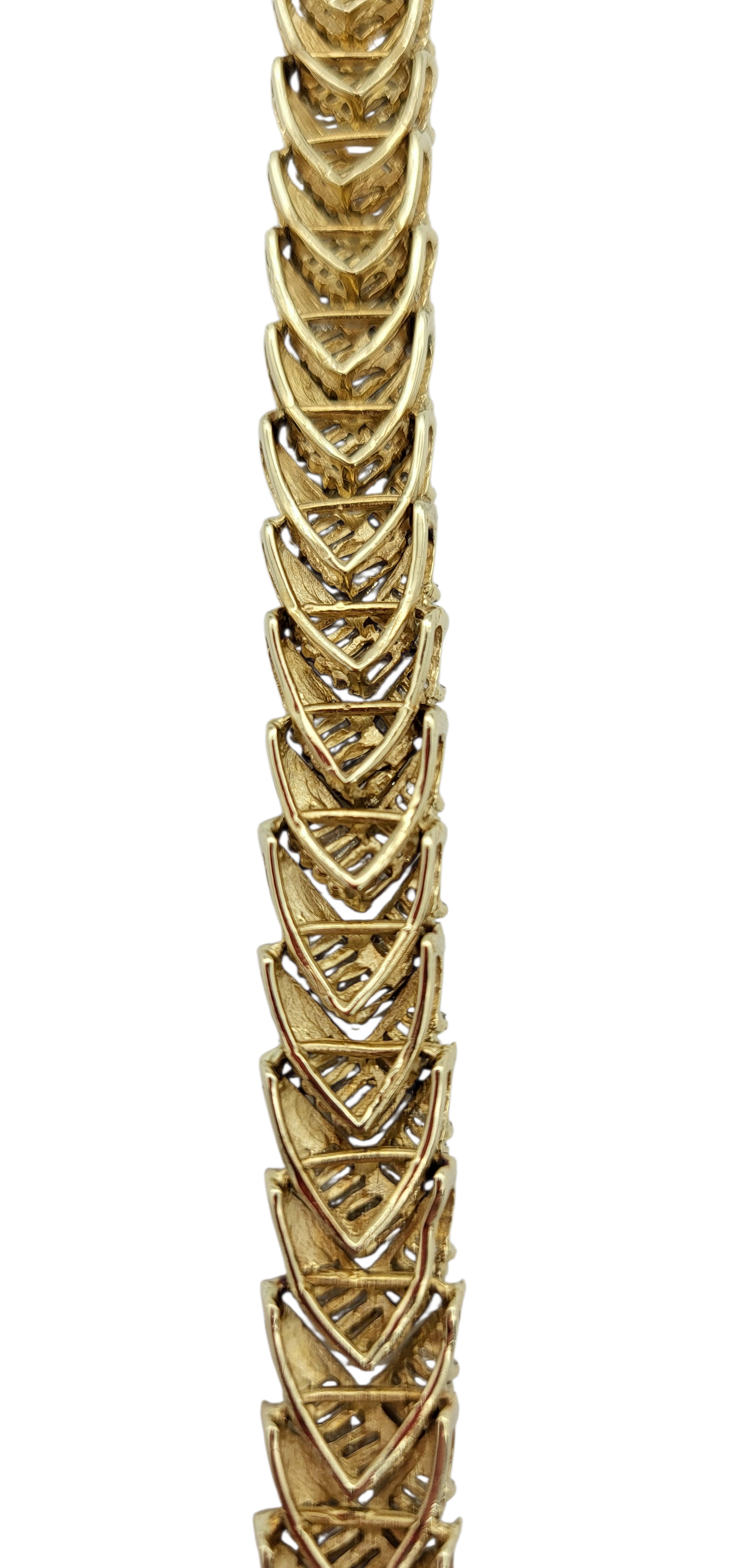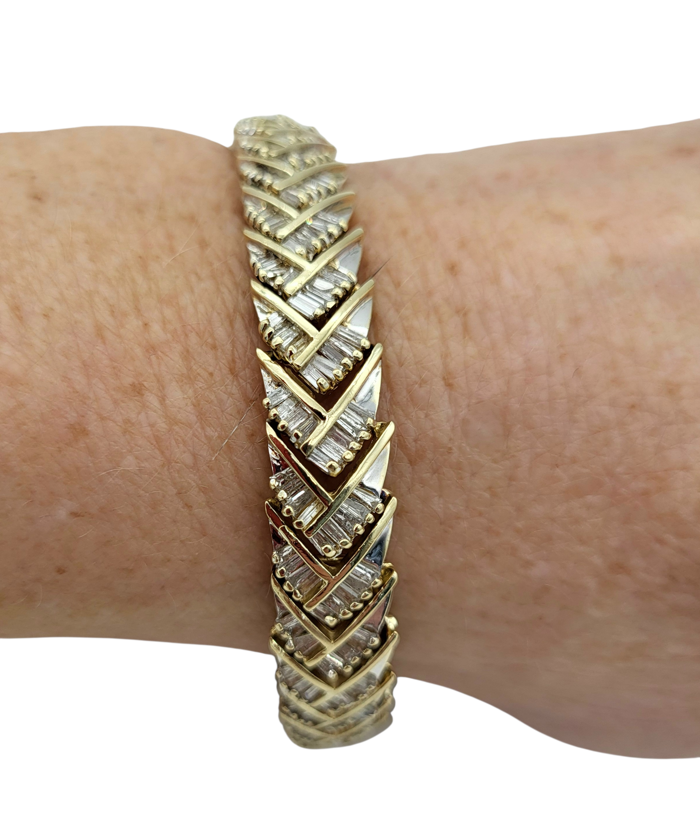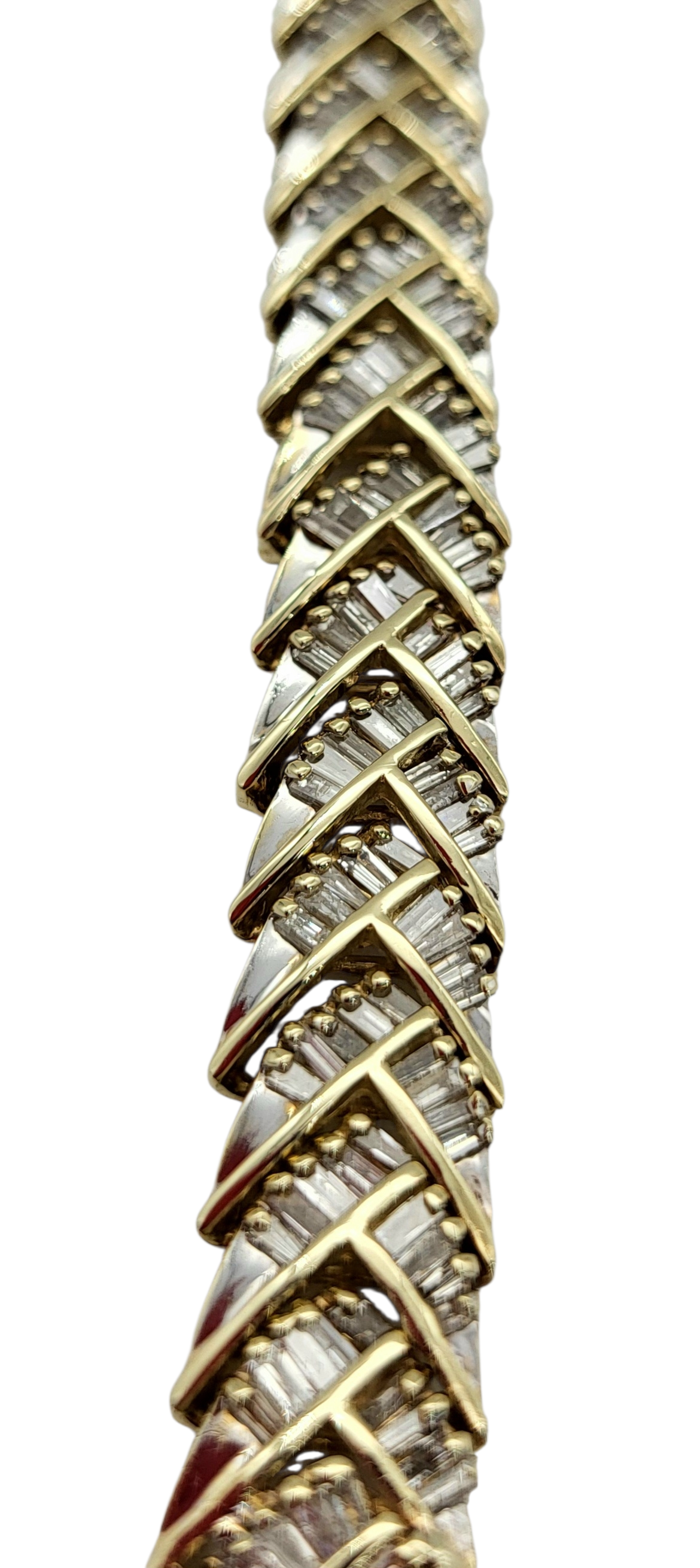 This 7 Carat Total Weight Natural Diamond Bracelet features 7 carats of baguette diamonds set between chevron rows of 14 karat yellow gold. Measuring 7 inches in length and 10 millimeters in width, it offers a versatile design suitable for both evening wear and casual attire, ensuring elegance without overpowering your look.