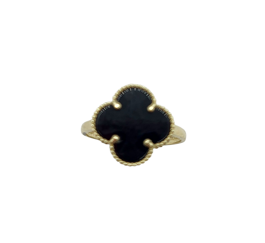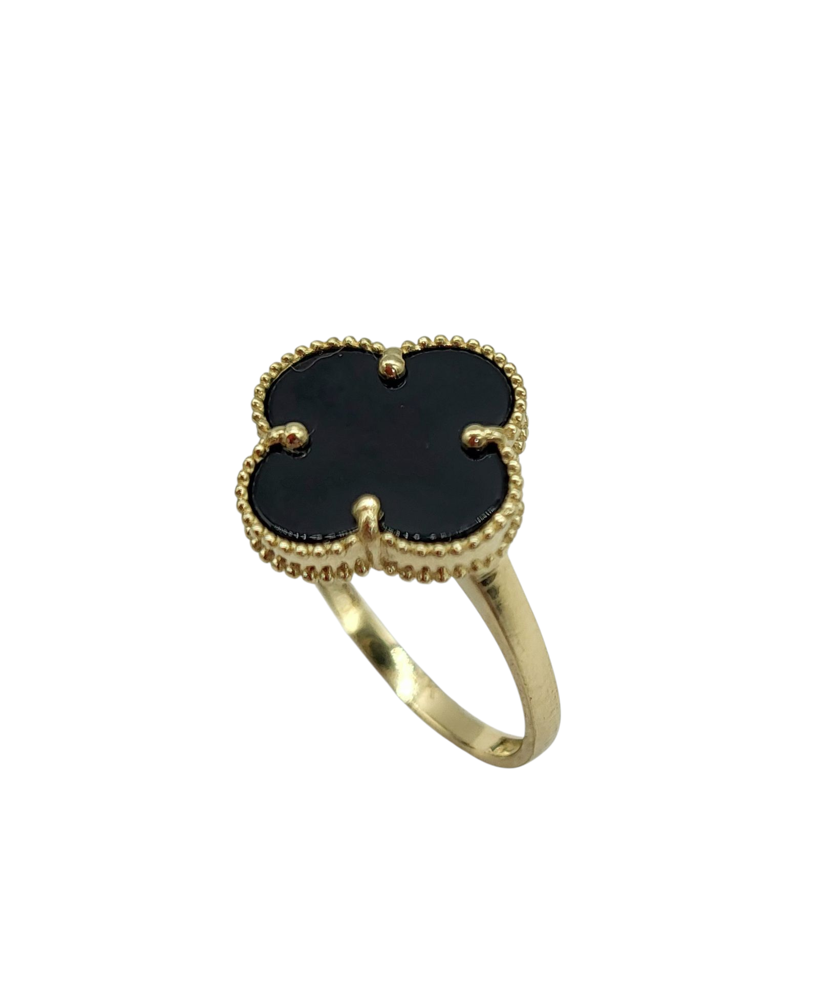 "Add a touch of modern elegance with our Black Onyx Clover Shaped Ring. The unique clover design, crafted with high quality black onyx and accented with a 14k yellow gold milligrain border, makes for a stunning and stylish accessory. Elevate your style with this one-of-a-kind piece."