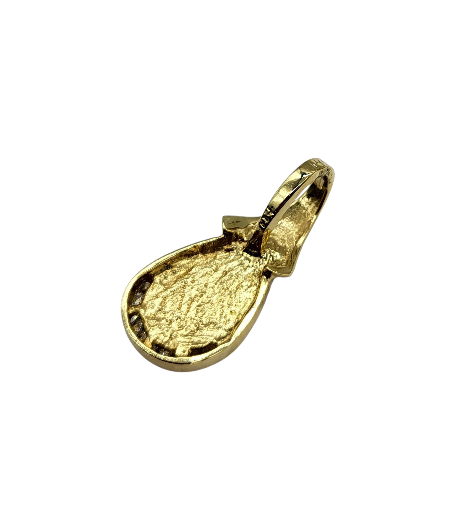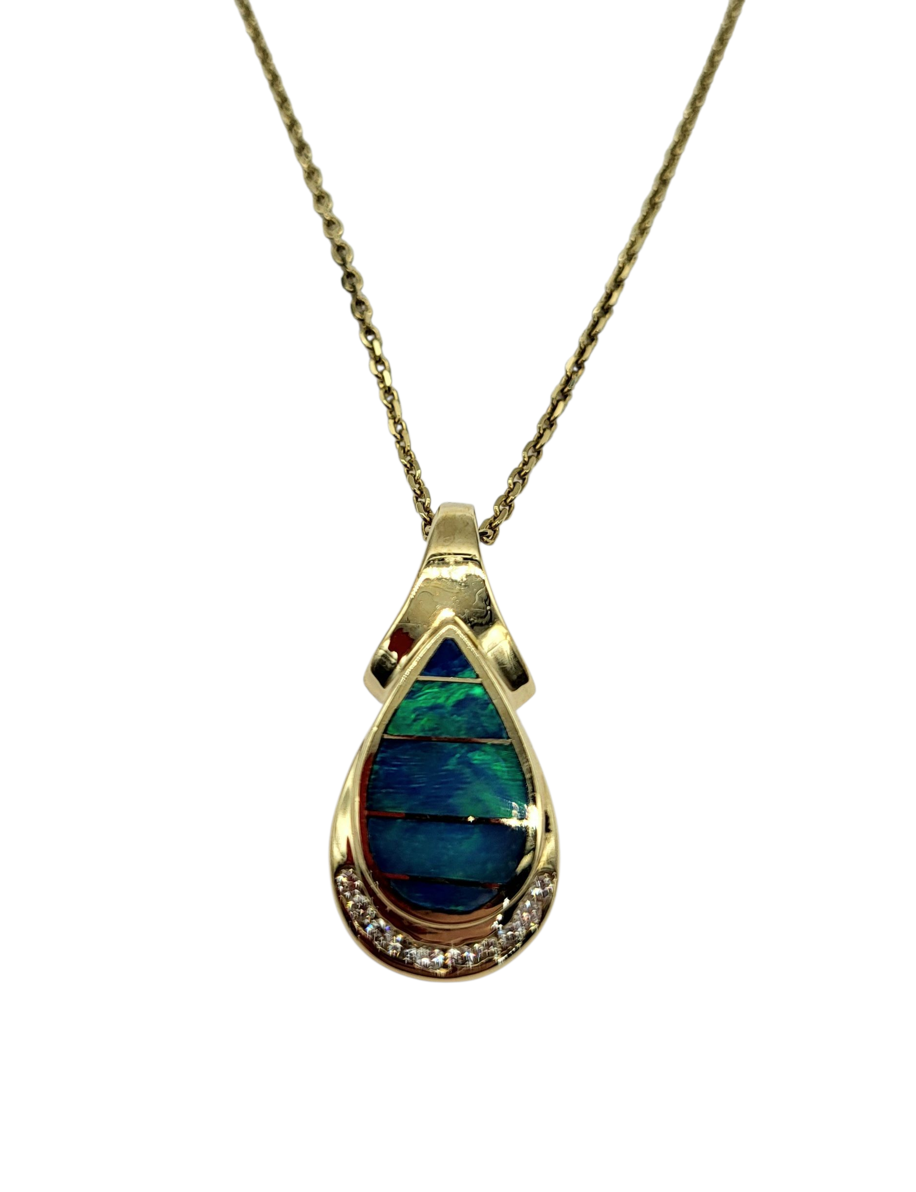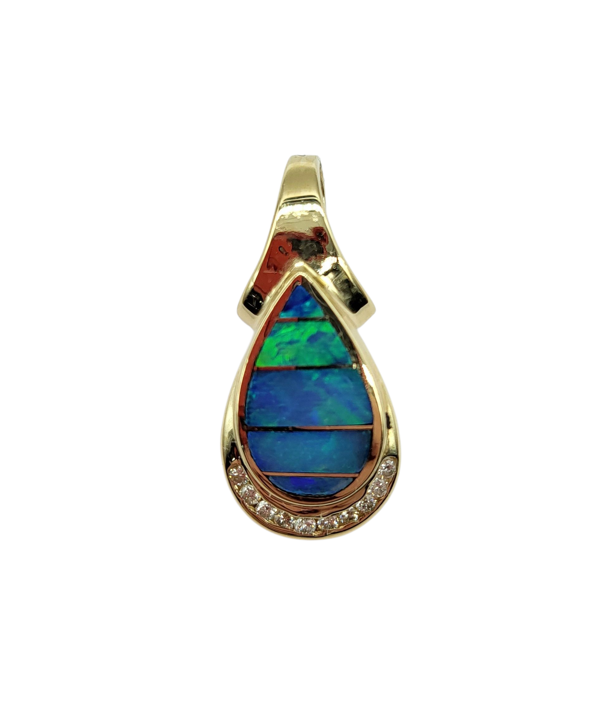 "As a product expert, I present to you our exquisite Blue Green Opal Pendant. This pendant boasts a stunning teardrop design with a beautiful inlay of blue green opal and diamond chip accents, all set in 14 karat yellow gold. Add it to your collection and elevate your style game. Chain sold separately."