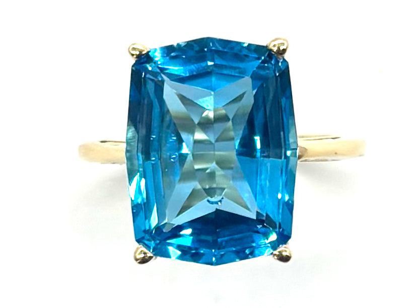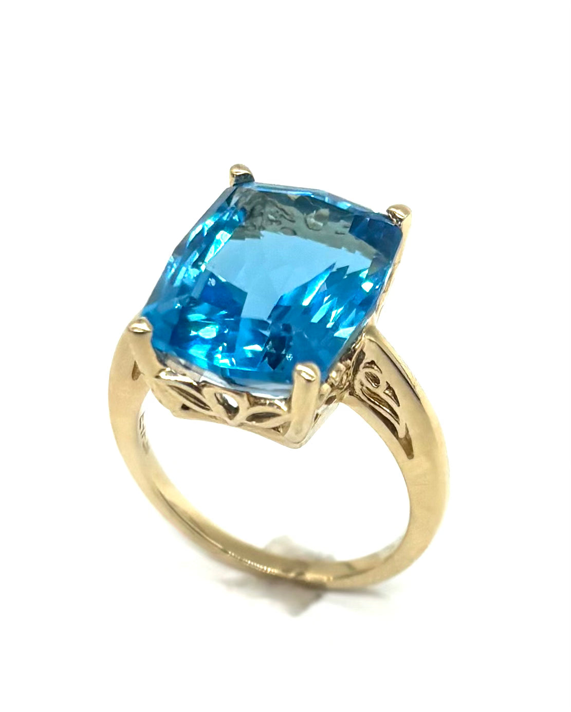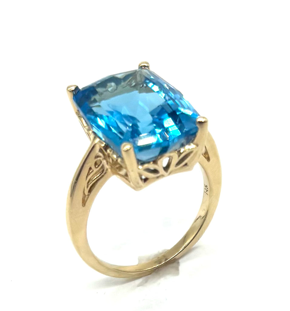 Crafted in solid 14k yellow gold, this eye-catching piece features a large rectangular blue topaz held securely in a classic 4-prong basket setting. The vibrant stone radiates a brilliant ocean-blue hue, making it the perfect statement accessory for both everyday wear and special occasions.