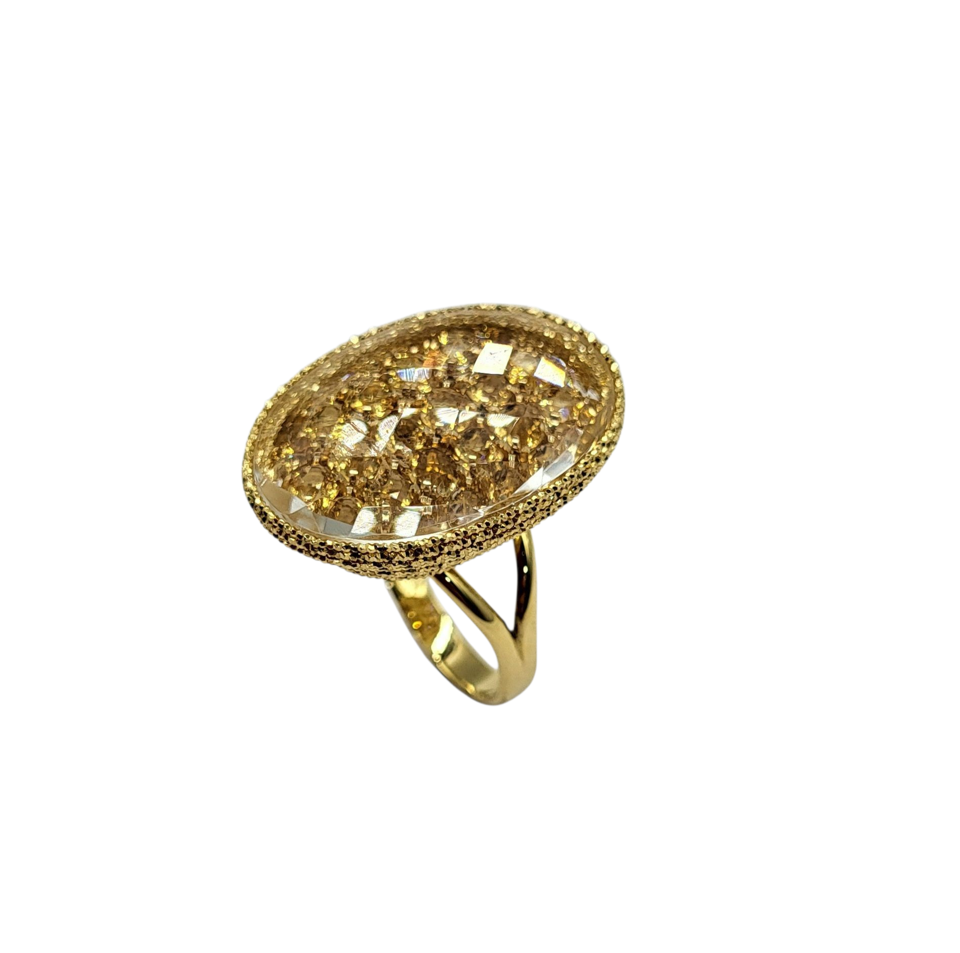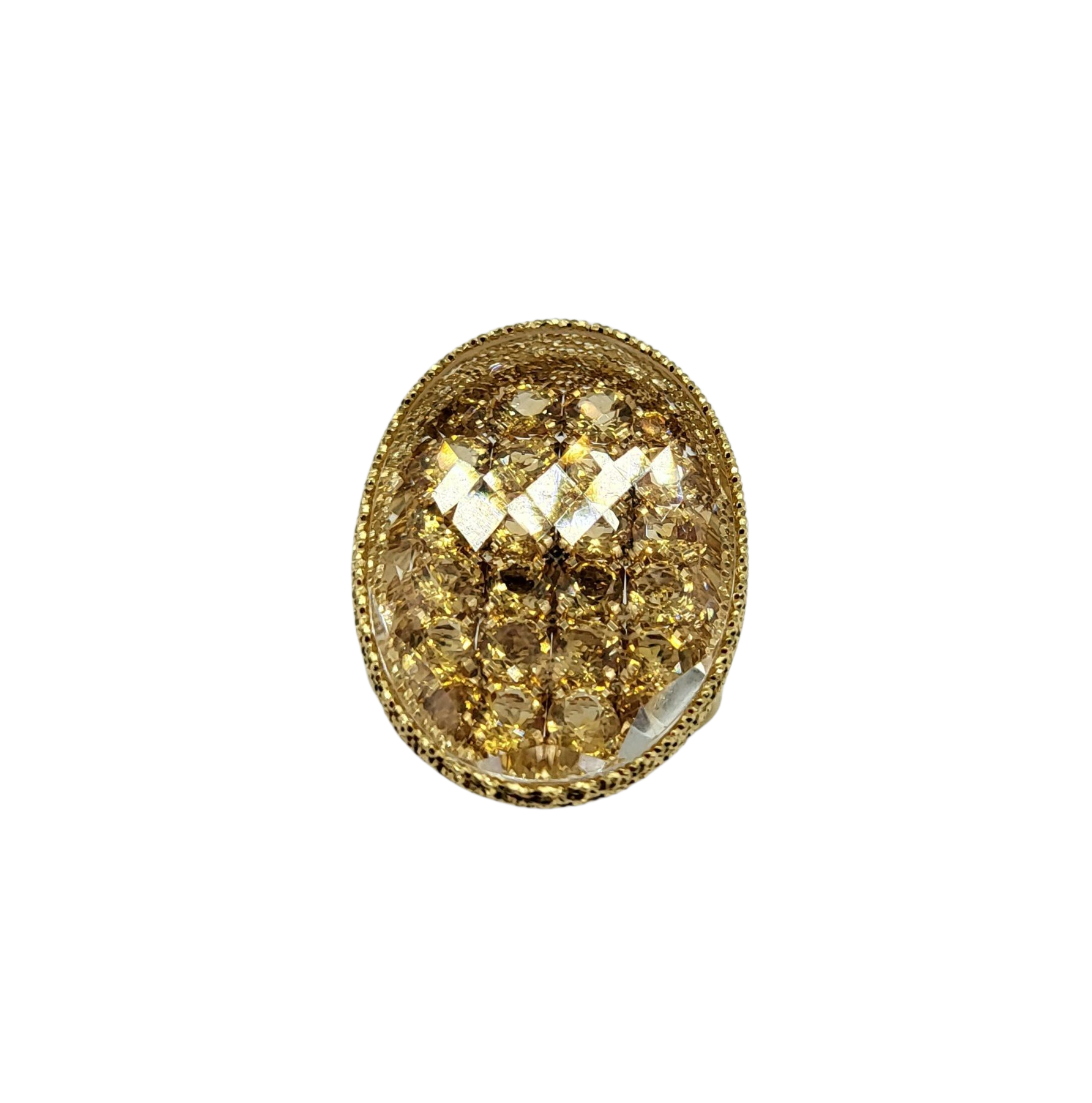 Make a bold statement with this Citrine Gemstone Fashion Ring. The spectacular oval cluster rectangular faceted citrine gemstone reflects light beautifully and is set in 18 karat yellow gold. Stand out from the crowd with this truly unique and amazing ring.