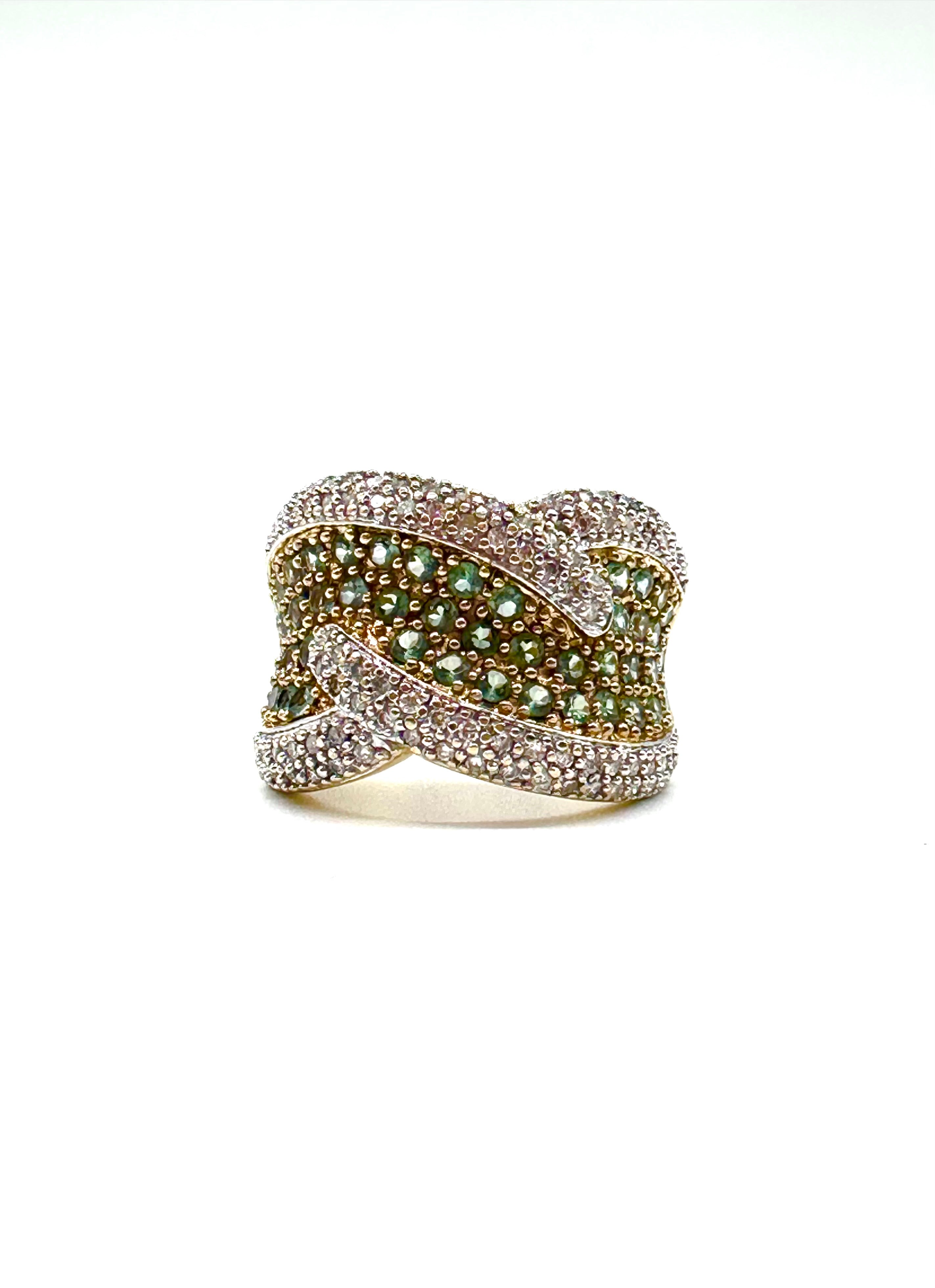 This impressively stunning diamond and emerald multi Road cluster band is set in 14 karat yellow and white gold with a total of one carat of diamonds.