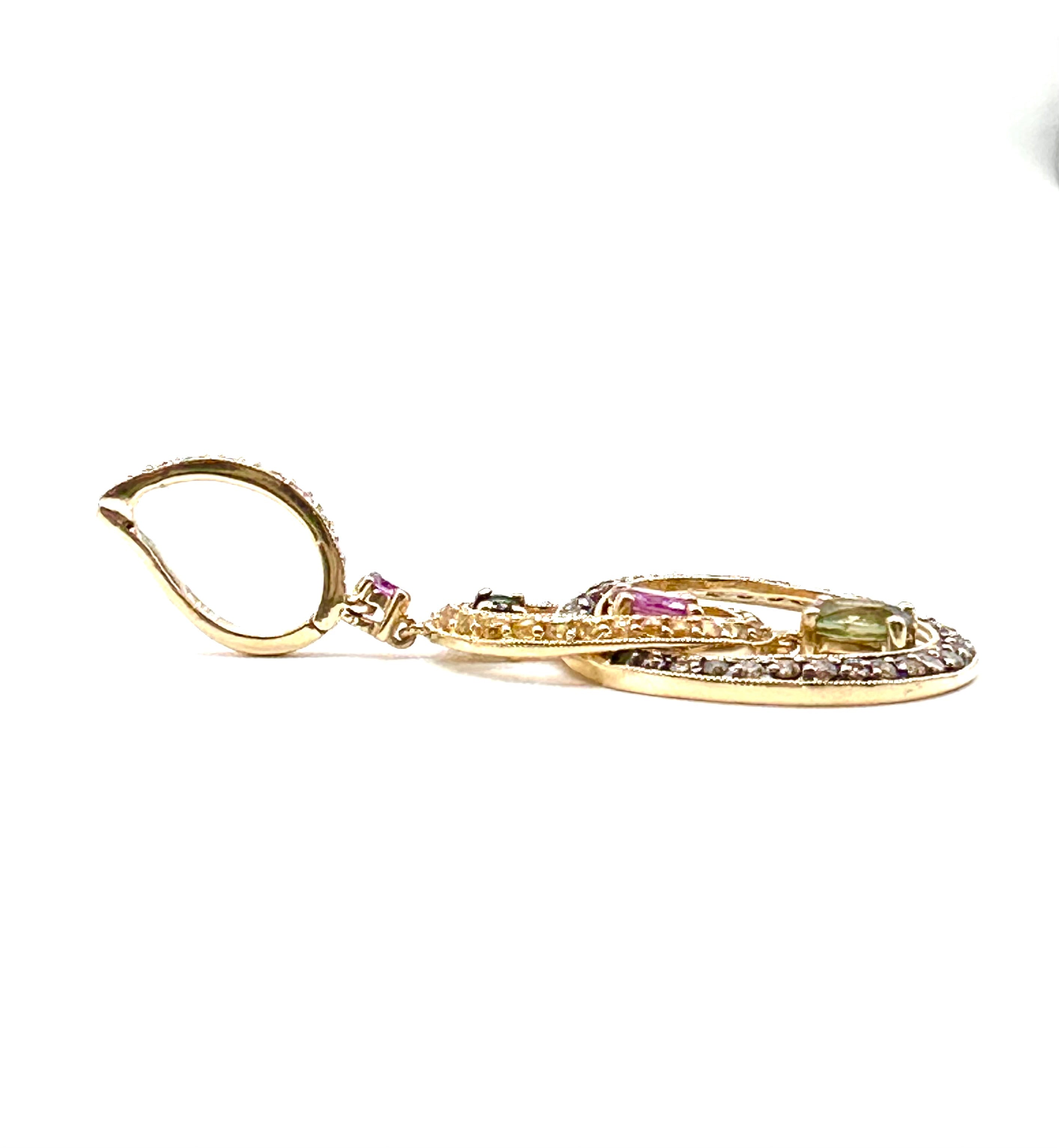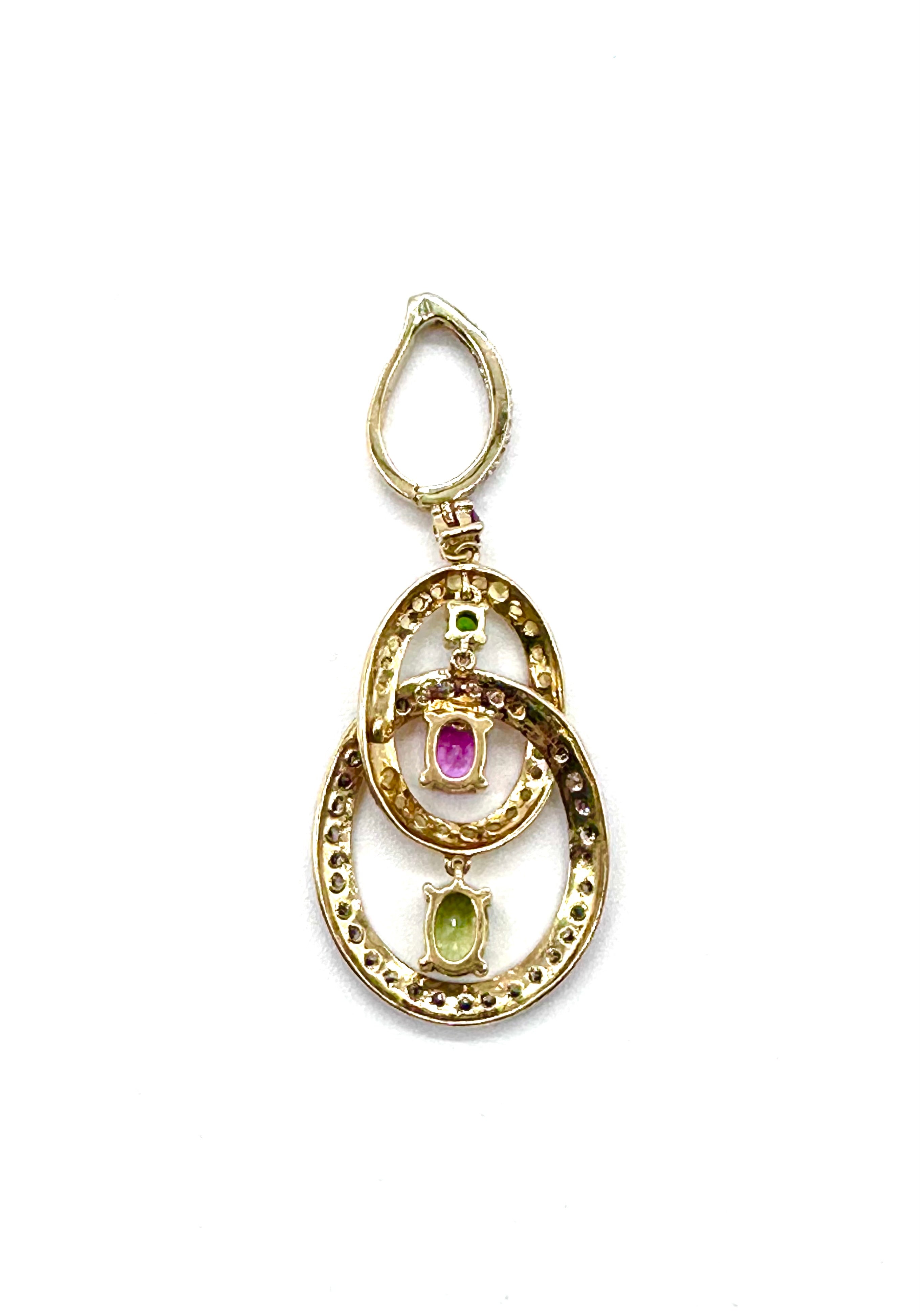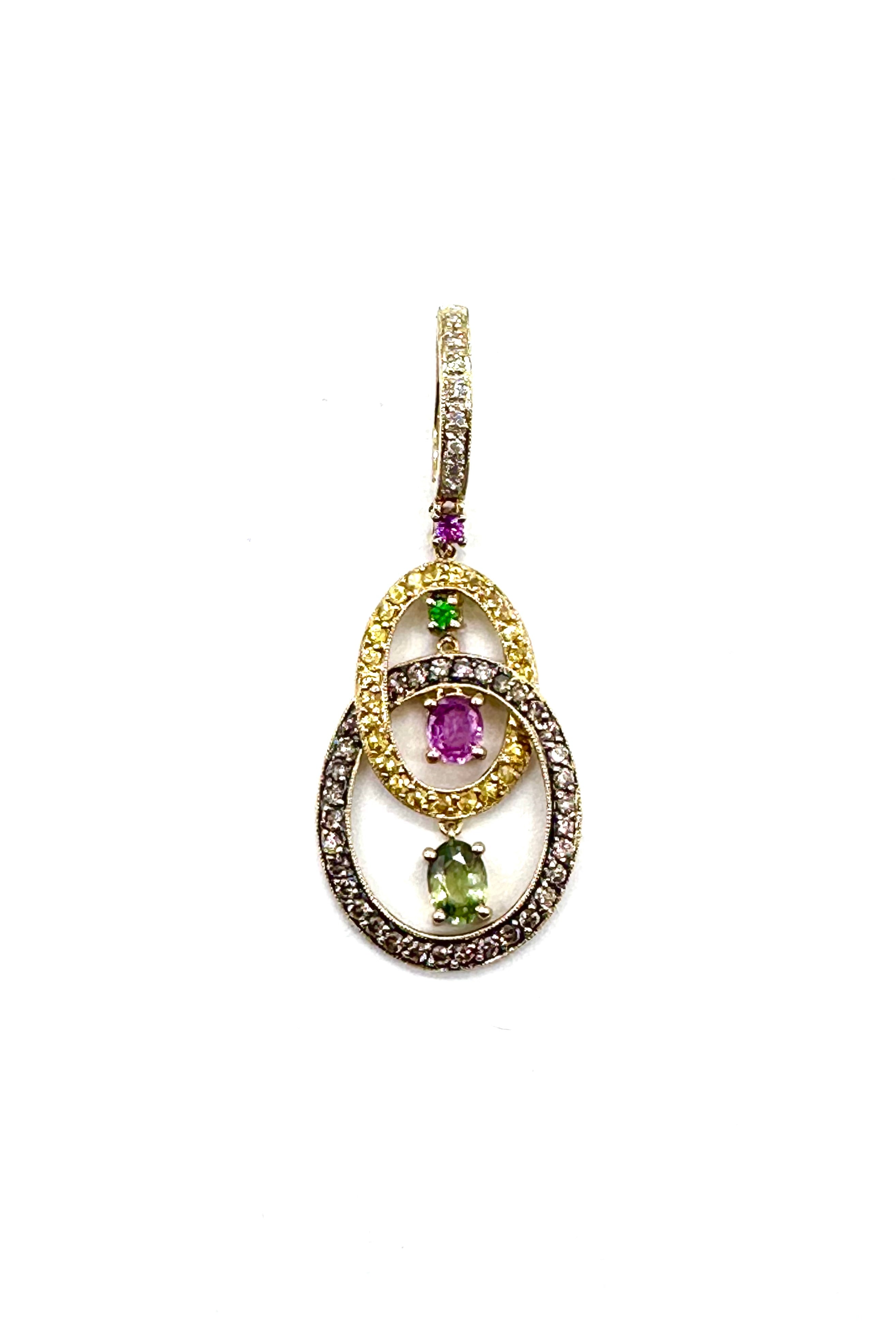 This is stunning white, yellow and champagne One carat total diamond pendant is accented with multicolored stones and set in 18 karat yellow gold.