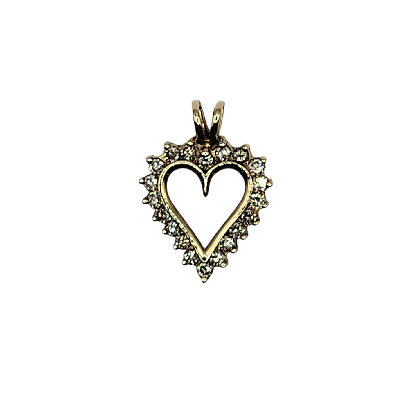 The 1 Carat Total Weight Diamond Accent Gold Heart Cutout Pendant features a total weight of 1 carat in bead set diamonds, elegantly arranged in a heart shape. Crafted from 10 karat yellow gold, this pendant offers a durable yet sophisticated accessory option. Please note that the chain is sold separately.