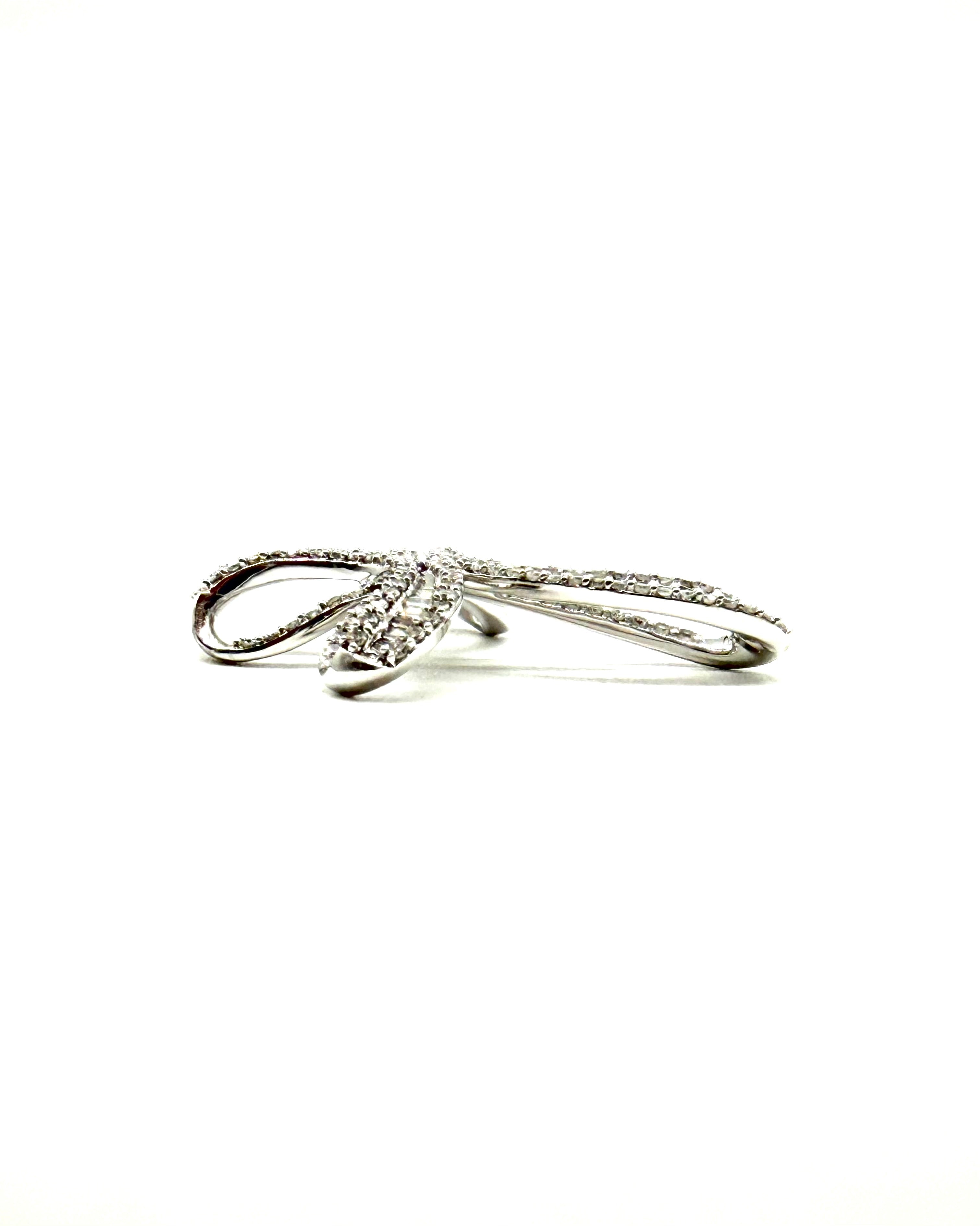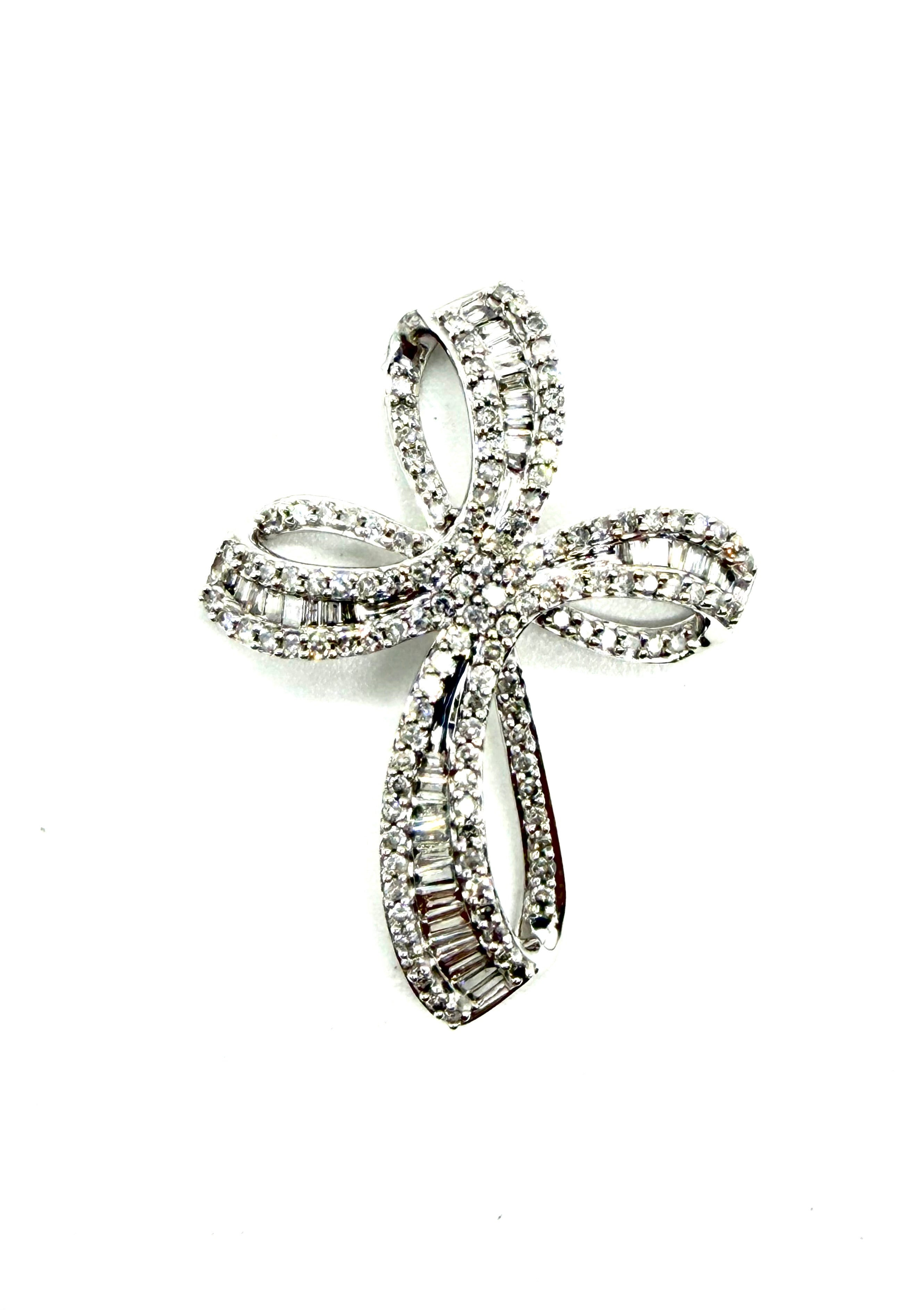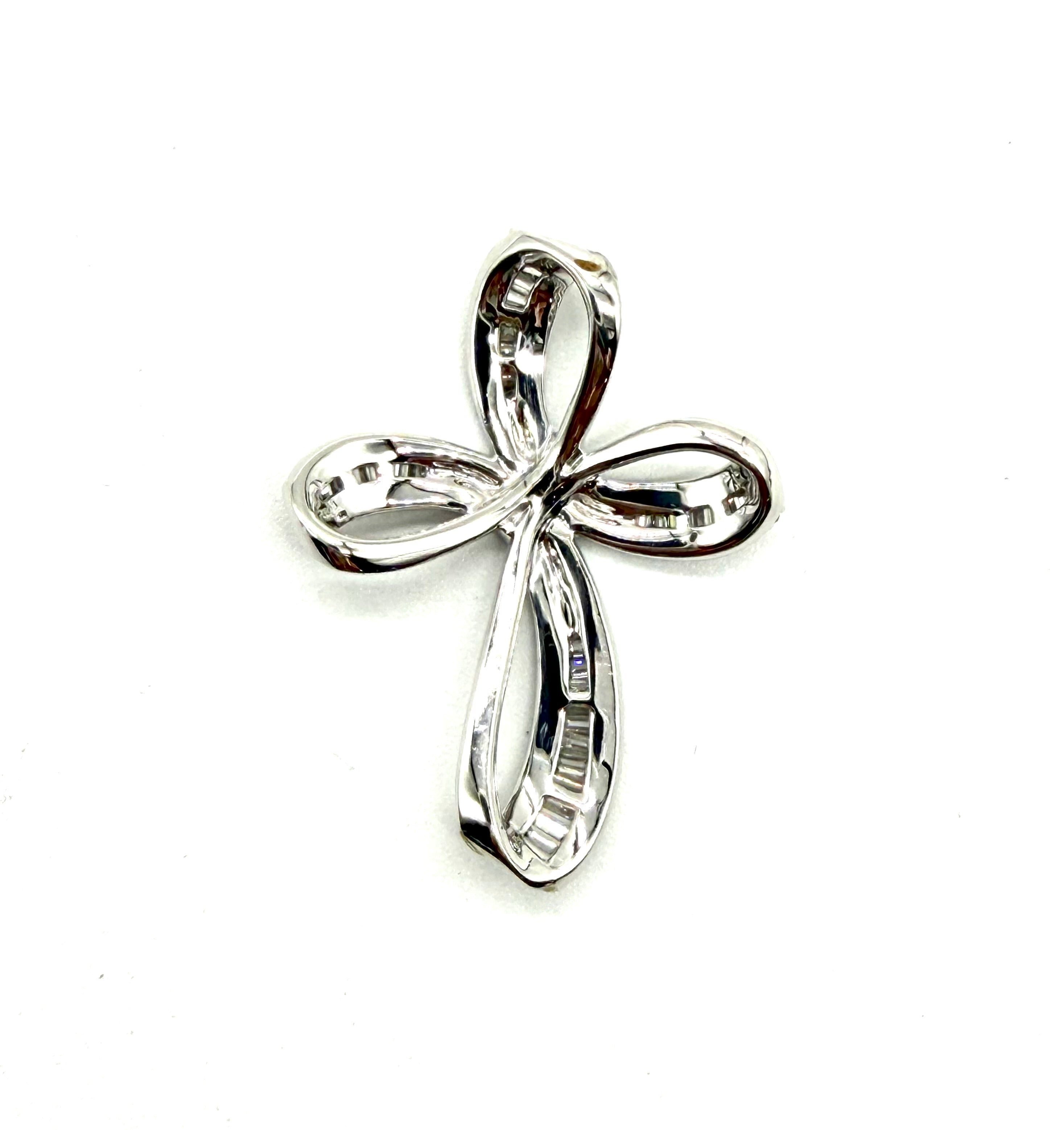 This elegant piece is a curved ribbon cross pendant, characterized by its fluid, interlocking loop design and shimmering one carat diamond embellishments. This beautiful cross is set in 10 karat white gold.