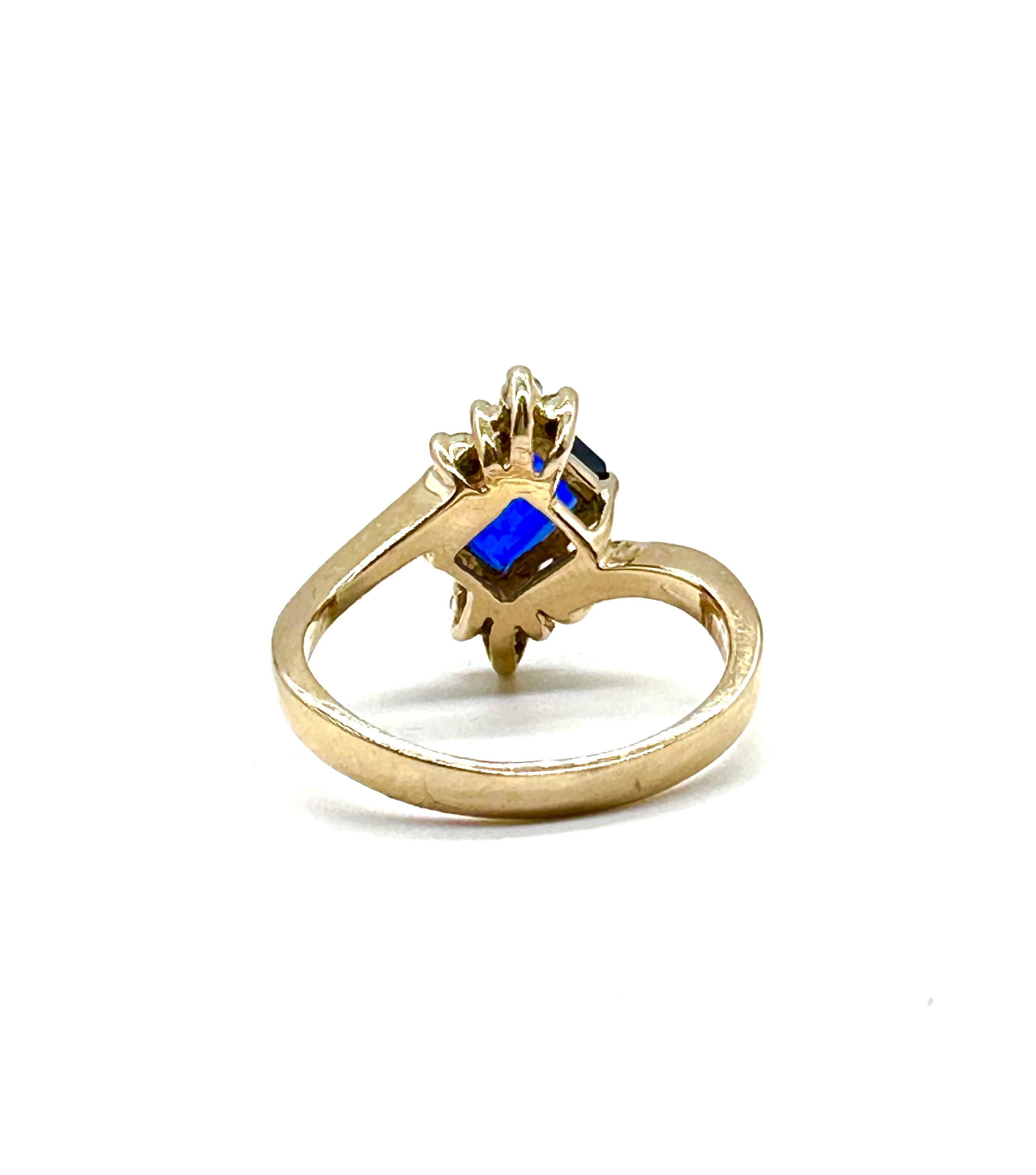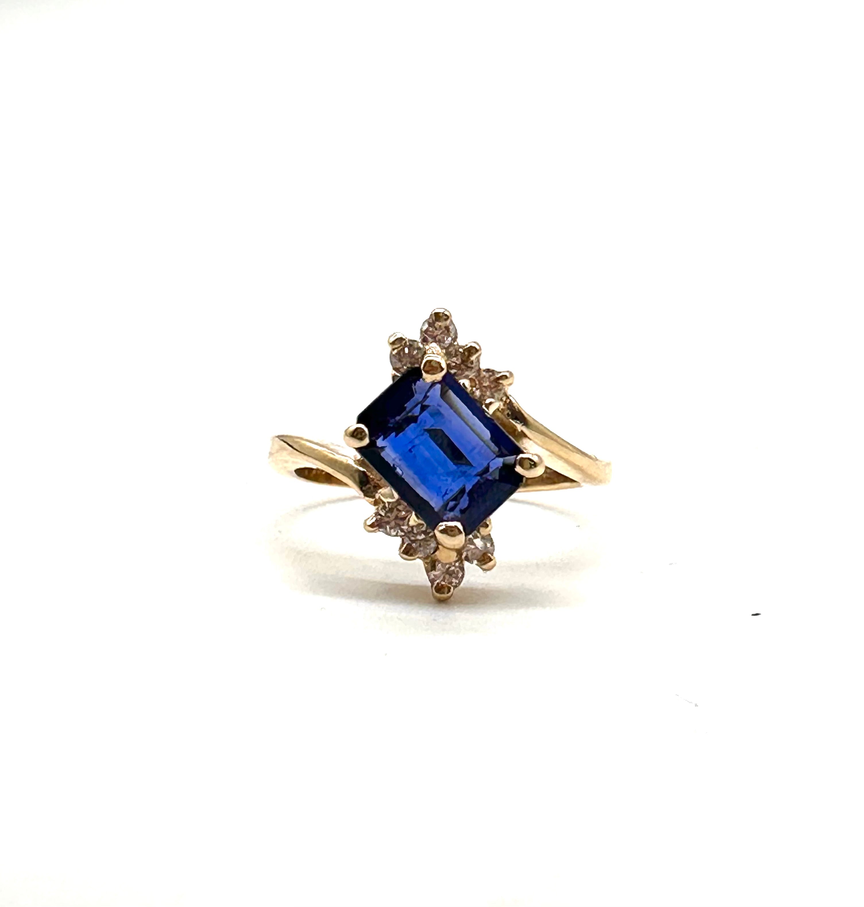 This beautiful Emerald cut sapphire is accentuated with a quarter carat of diamonds and set in 14 karat gold.