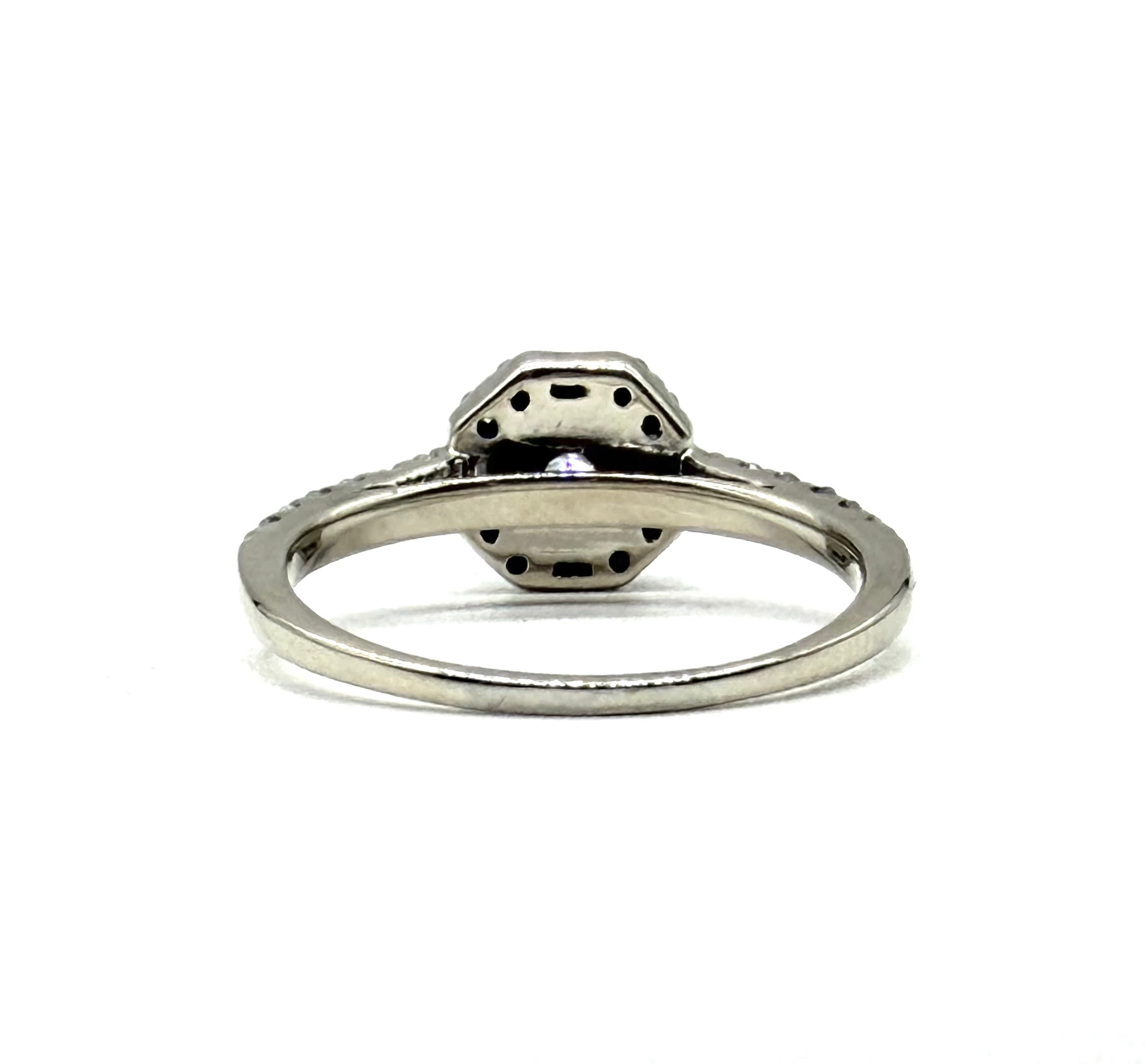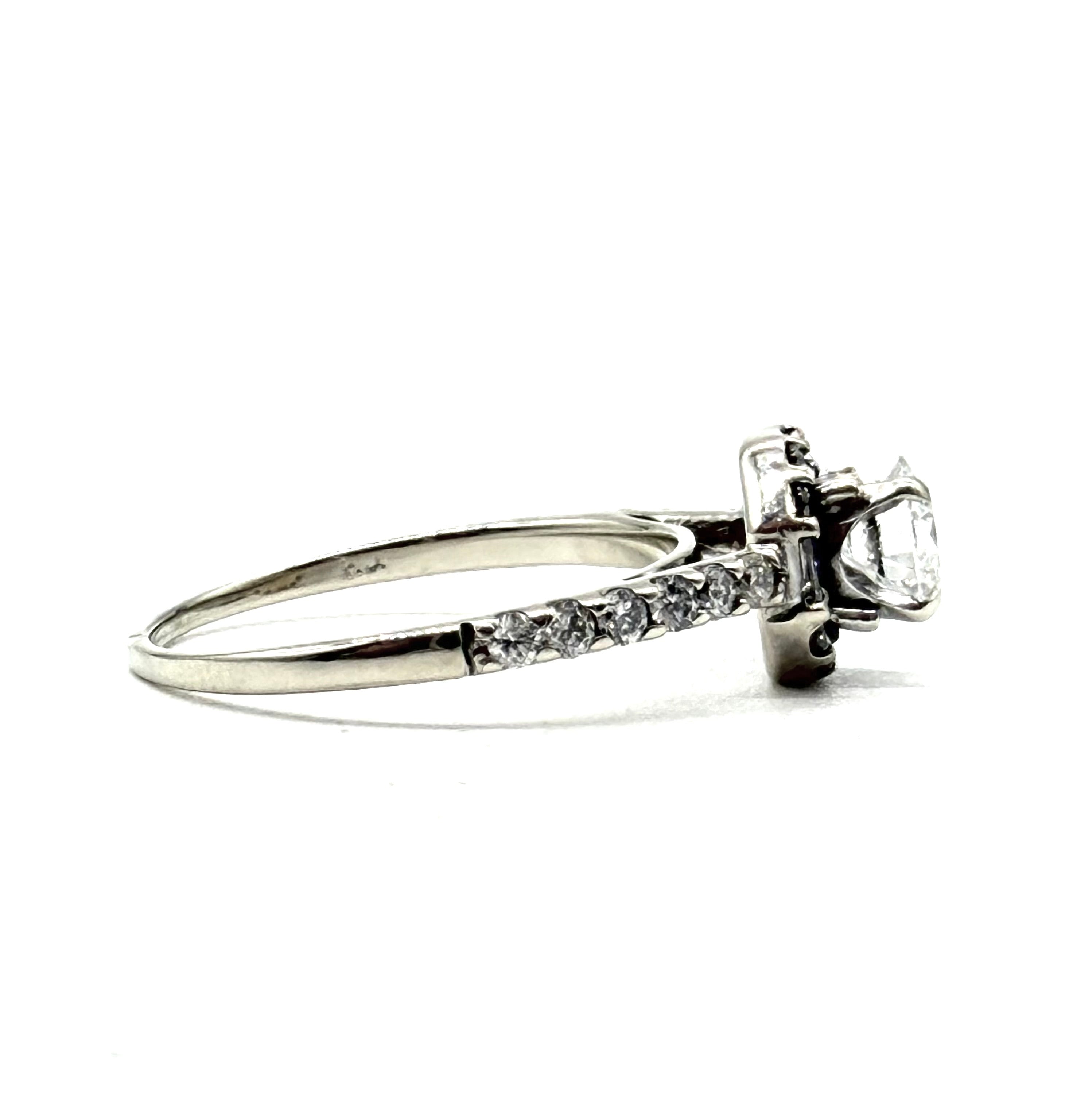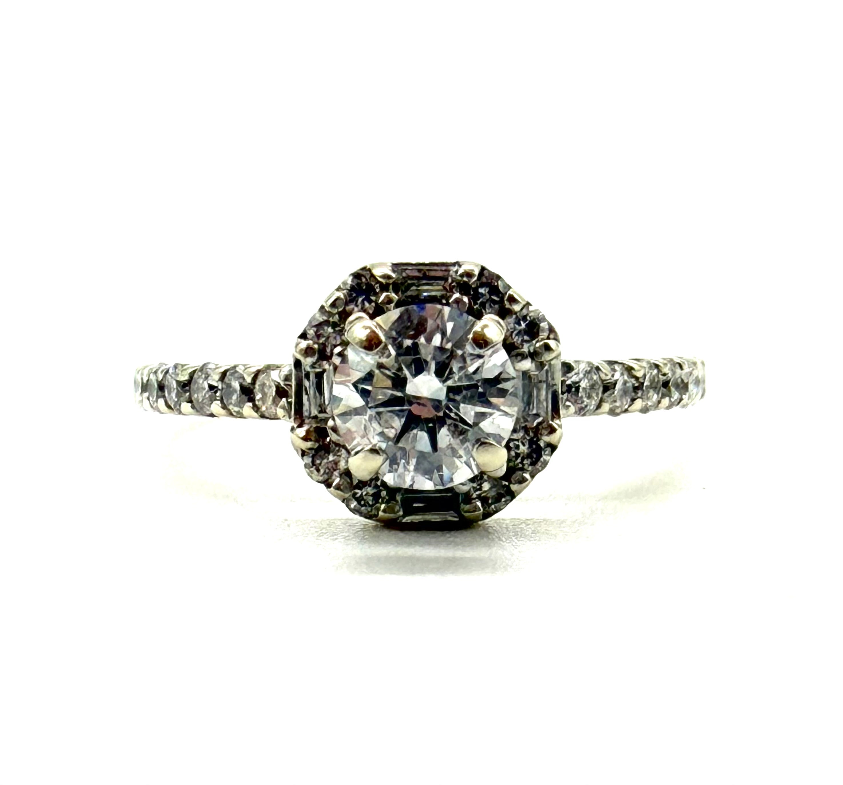 This captivatingly beautiful old European cut diamonds is stunningly haloed with Round And Baguette Diamonds totaling one carat and is set in 14 karat white gold.