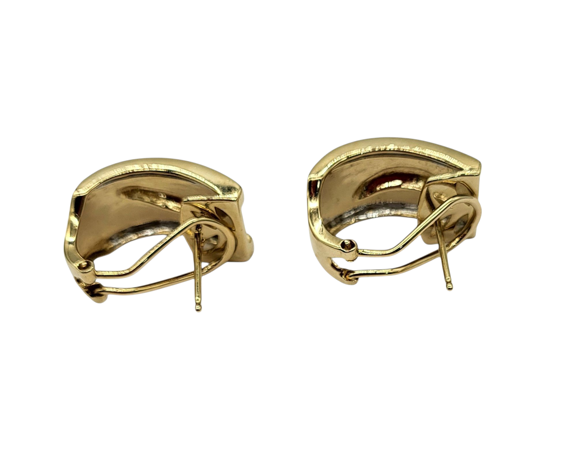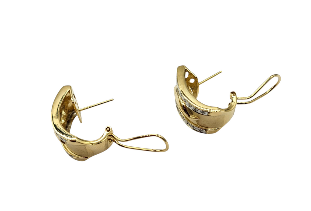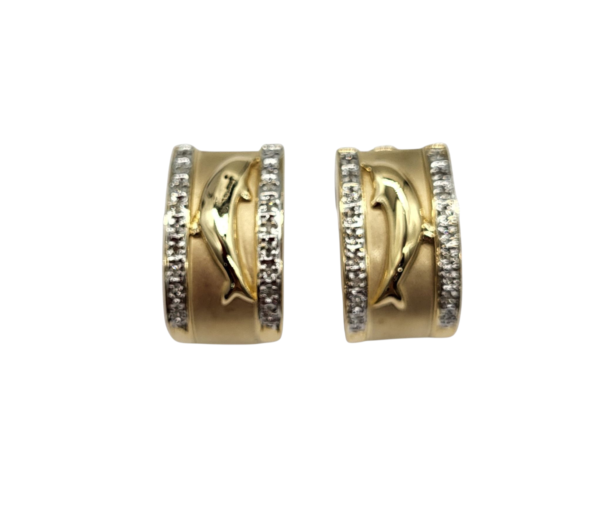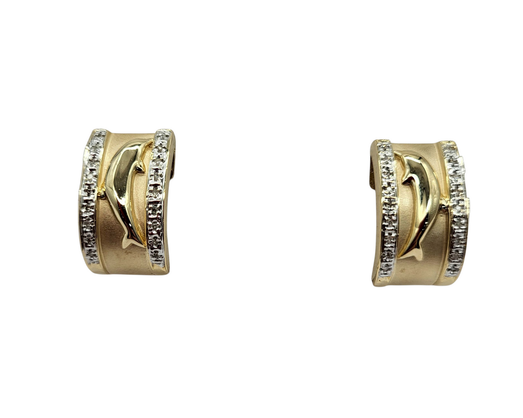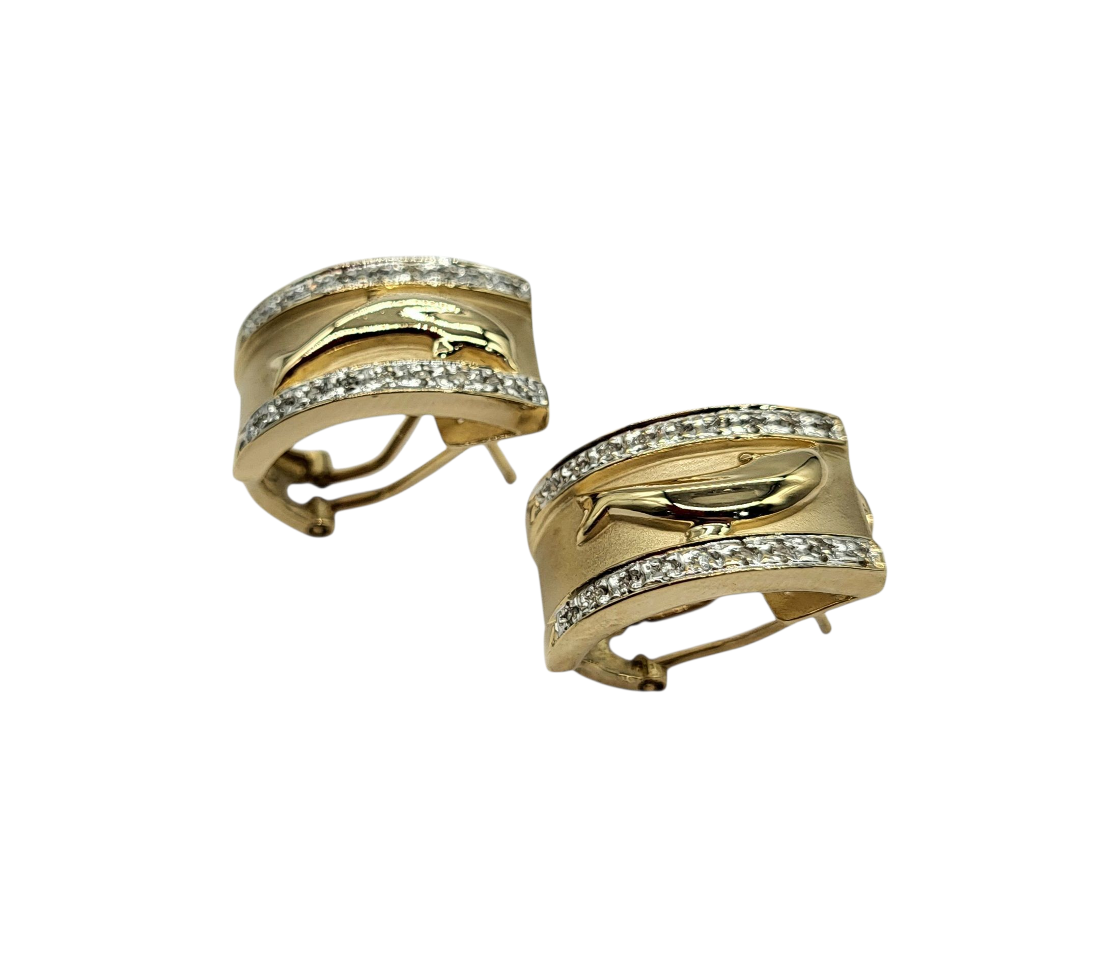 "Add a touch of whimsy to your outfit with our Gold Dolphin Earrings! Made of 14 karat white and yellow gold, these earrings feature charming dolphin designs with sparkling diamond chip accents. And with the secure omega back closure, you'll never have to worry about losing these playful beauties!"