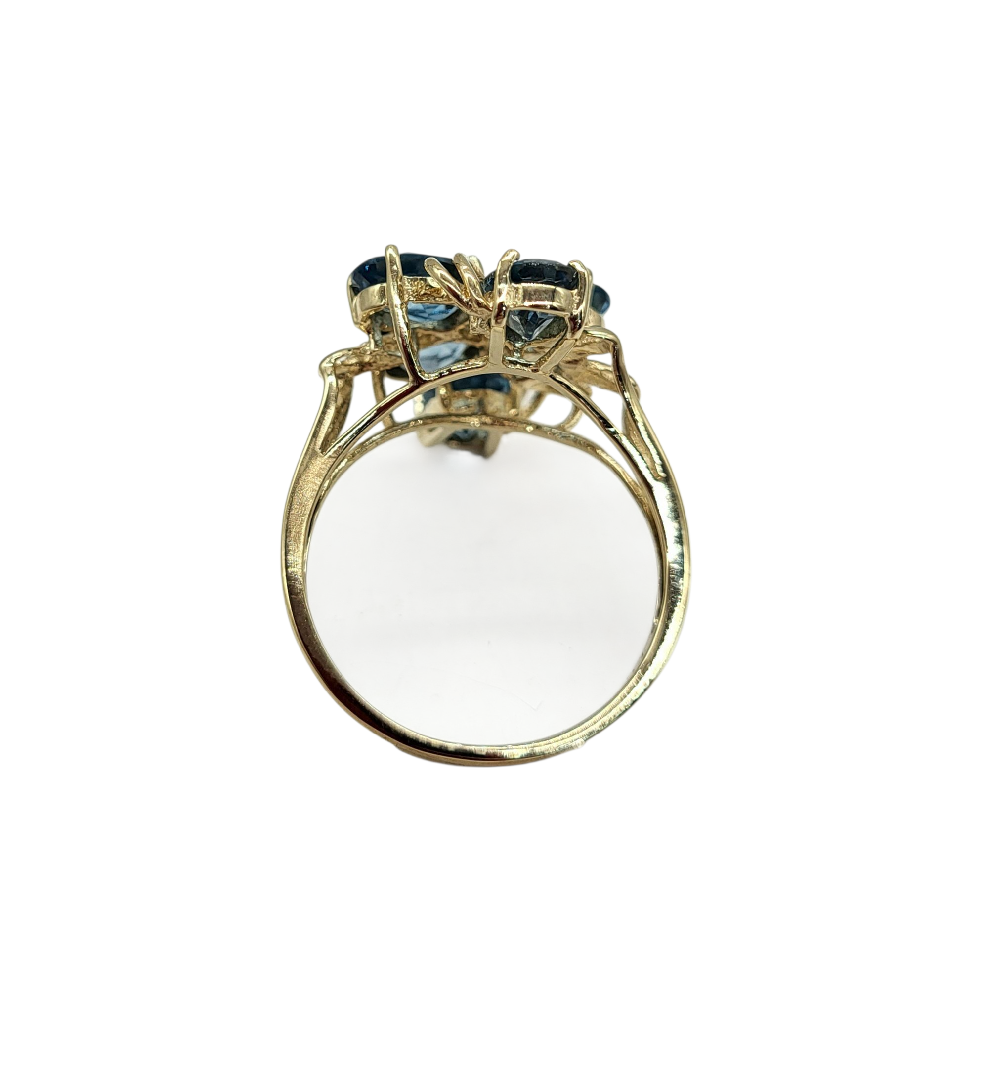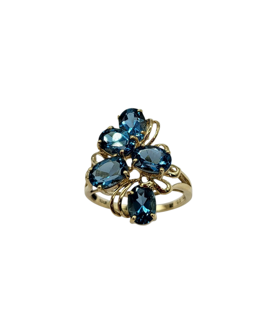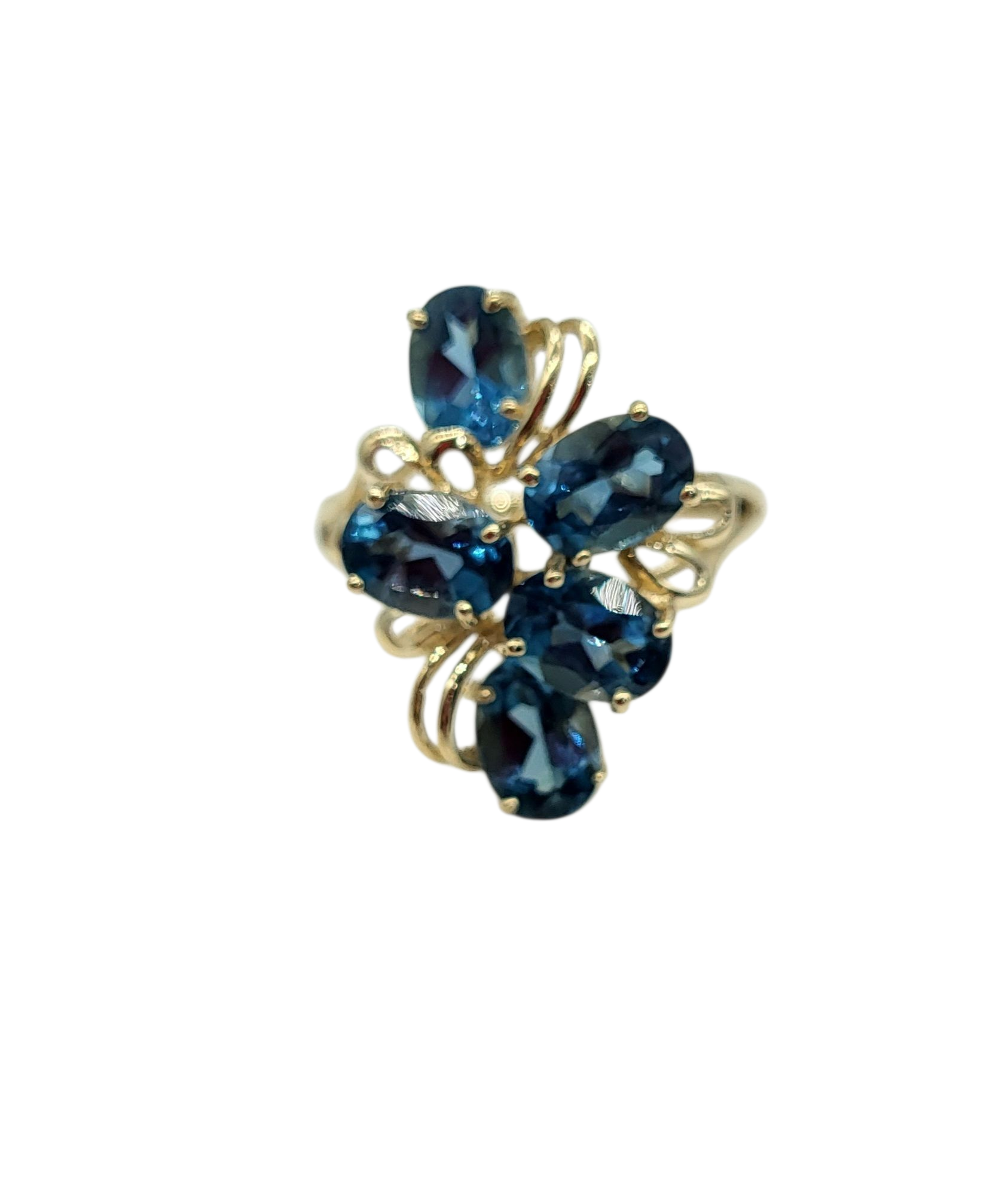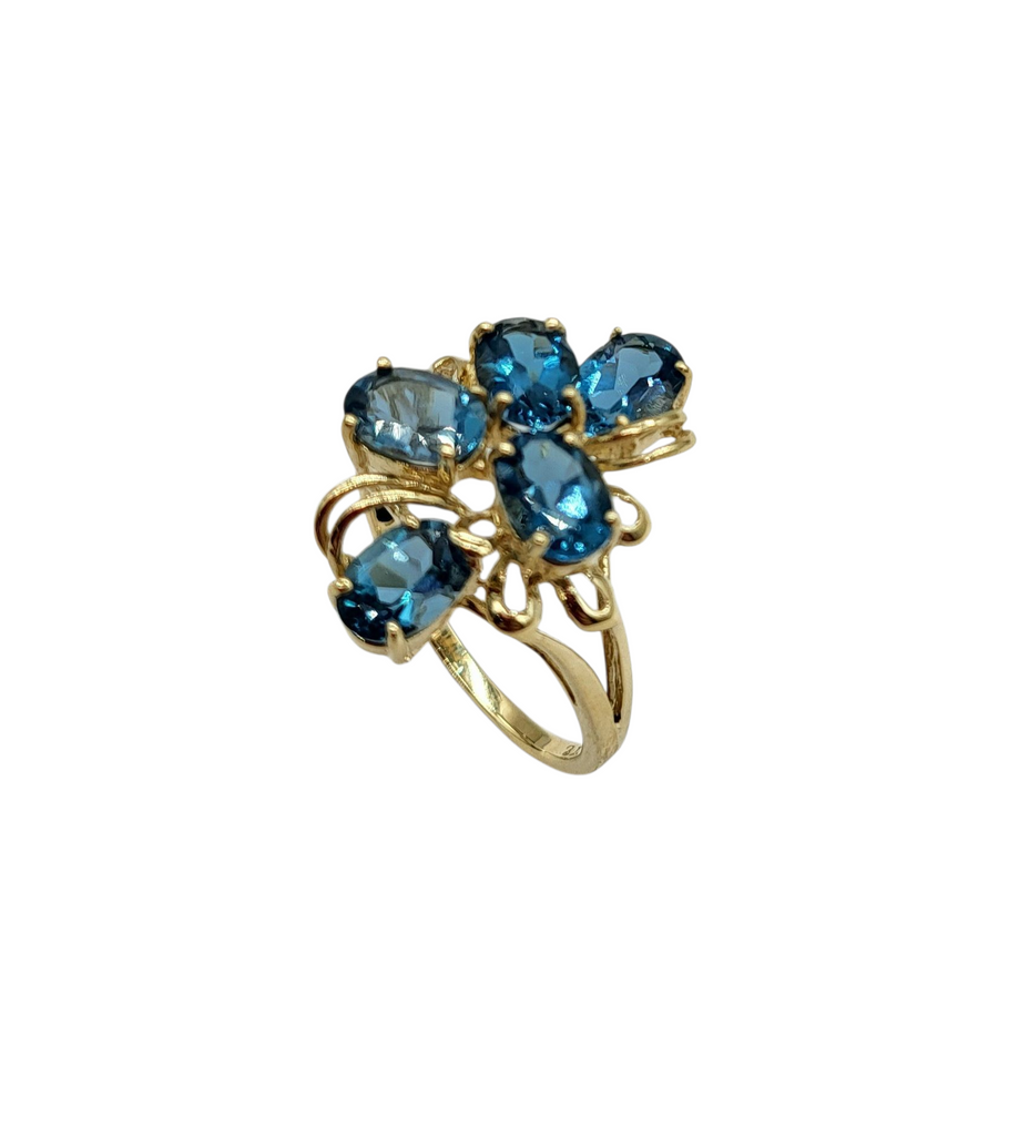 Embrace the captivating beauty of this London Blue Topaz Ring. Crafted with 14K yellow gold, the 5 oval topaz stones create a stunning bouquet burst design. Transport yourself to the streets of London and feel the elegance and glamour radiating from this amazing piece.