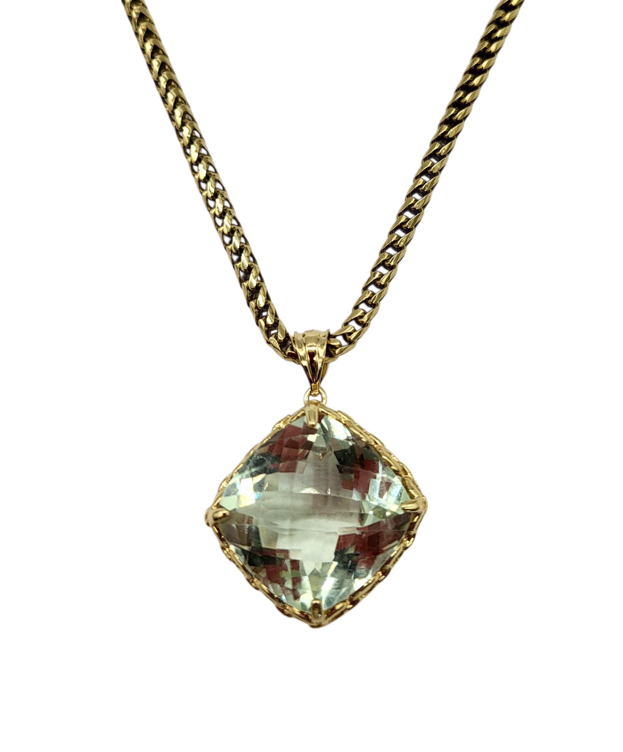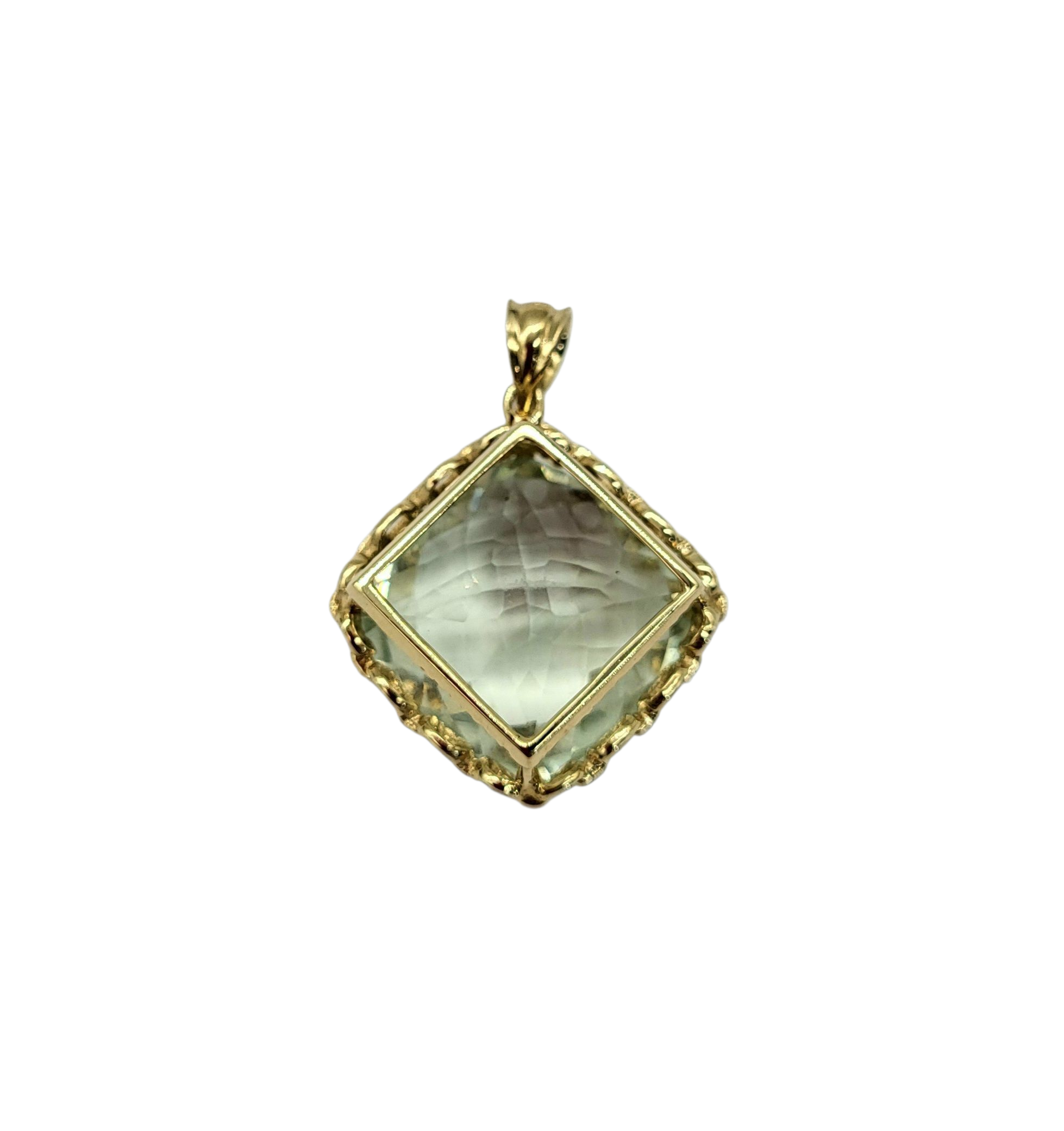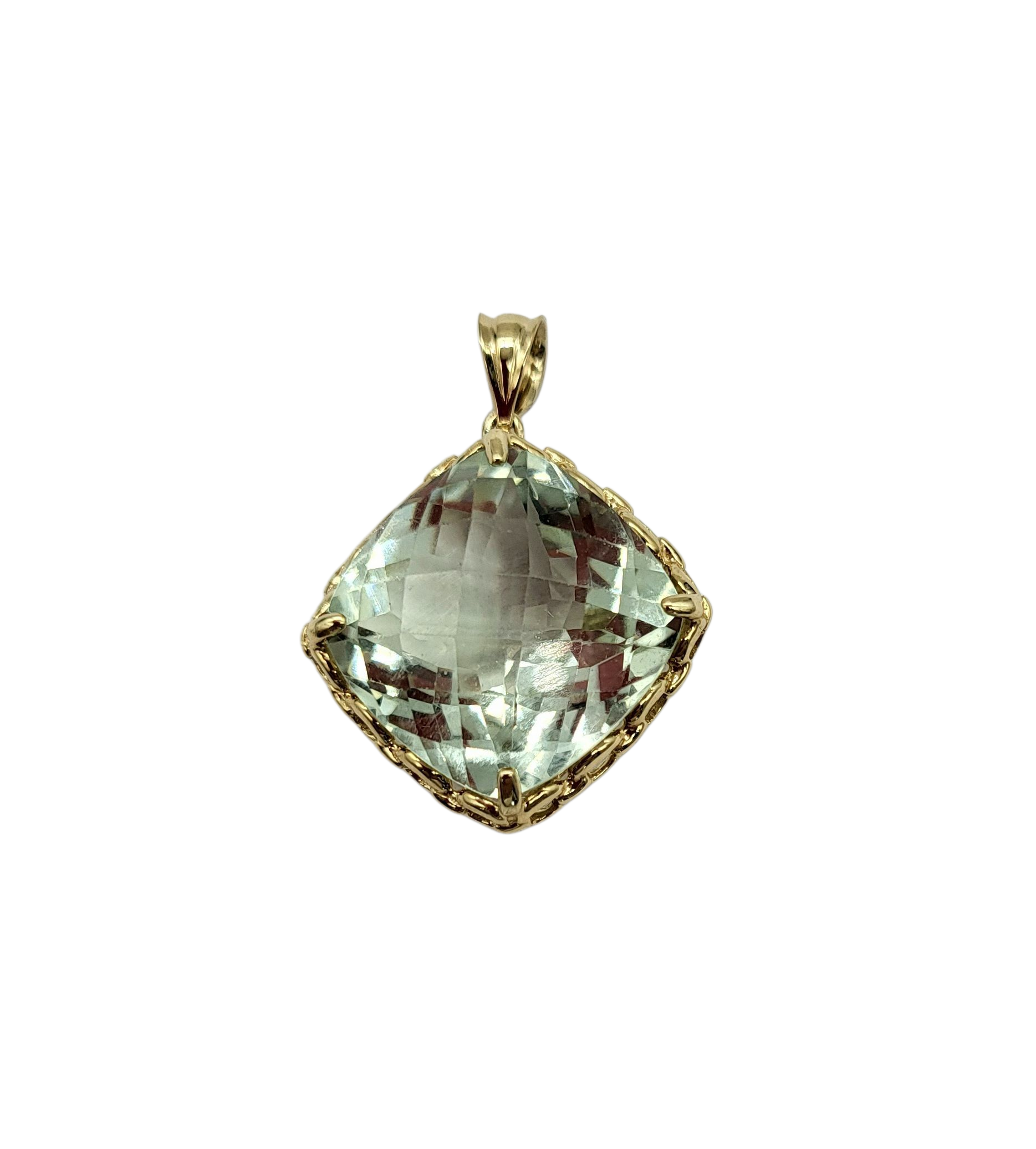 This Mint Green Quartz Pendant features a fasciated cushion cut in an ornate 14 karat yellow gold mount. The elegant design showcases the unique color and sparkle of the mint green quartz, making it a striking piece of jewelry. Enhance your wardrobe with this pendant and pair it with your favorite (chain sold separately).