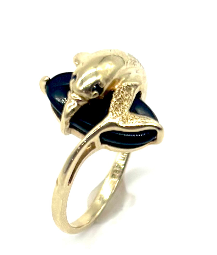 This stunning piece beautifully captures the fluid motion of dolphins while adding a bold, timeless touch with its deep black onyx. Perfect as a statement ring, a thoughtful gift, or a collector’s item for lovers of unique fine jewelry.