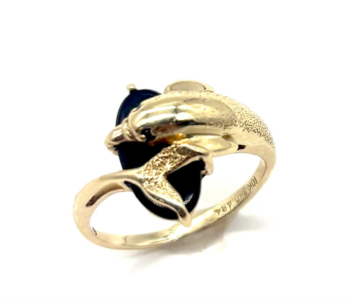 🐬 10K Yellow Gold Dolphin Bypass Ring with Marquise Onyx – Size 4.75 (Pre-Owned)