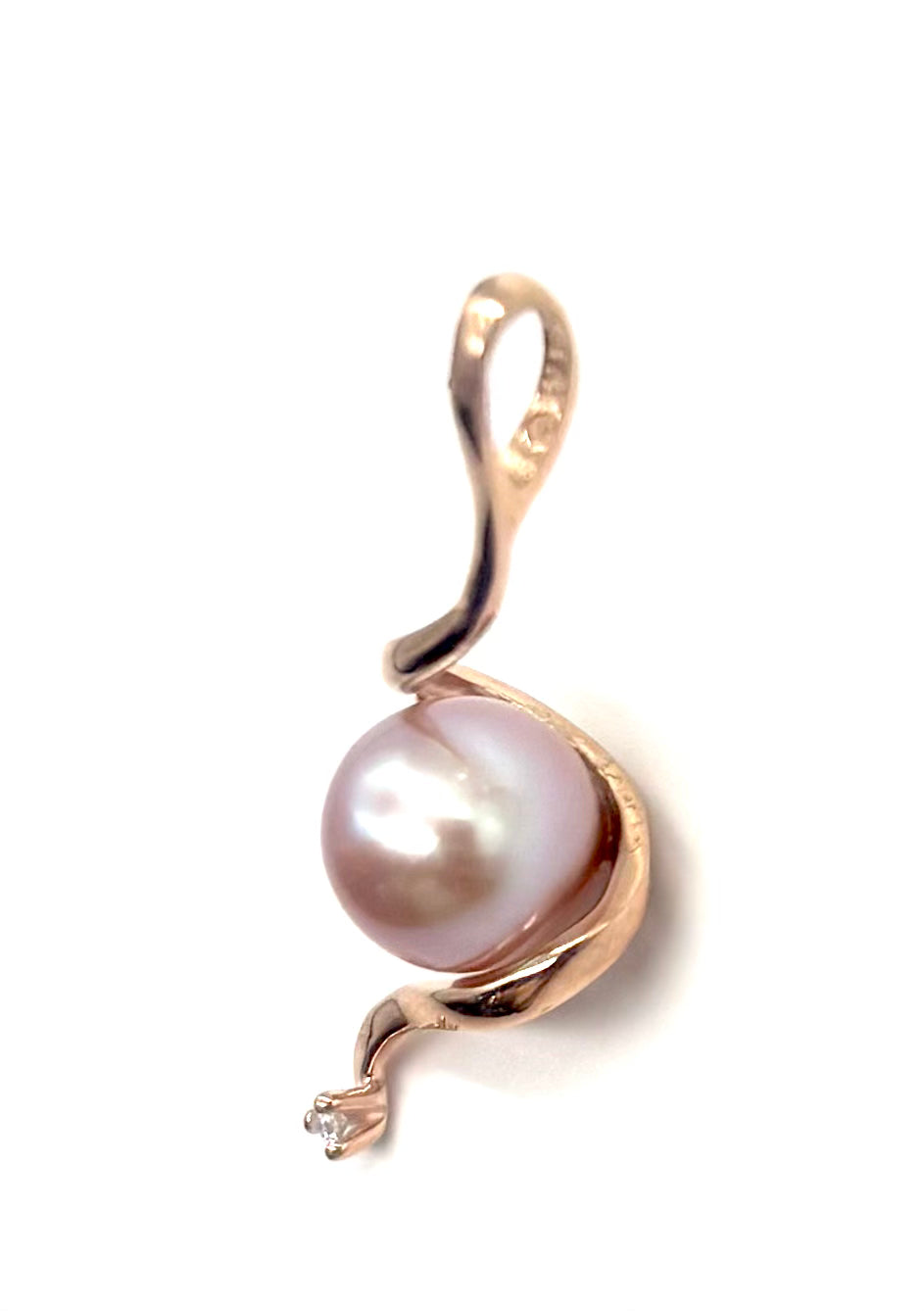 Delicate and unique, this pre-owned 14K rose gold pendant features a soft pink pearl set in a graceful twist design, finished with a subtle diamond accent for just the right touch of sparkle. The warm tone of rose gold perfectly complements the blush hues of the pearl, creating a timeless and romantic look.
