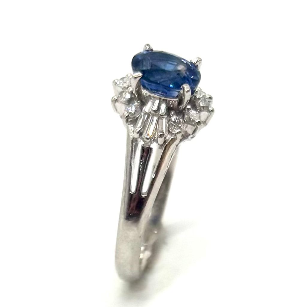 Elevate your collection with this exquisite platinum ring, featuring a 1.21 carat oval-cut sapphire that radiates deep, captivating color. Expertly accented with a shimmering combination of round and baguette-cut diamonds, this design balances timeless elegance with modern sophistication.