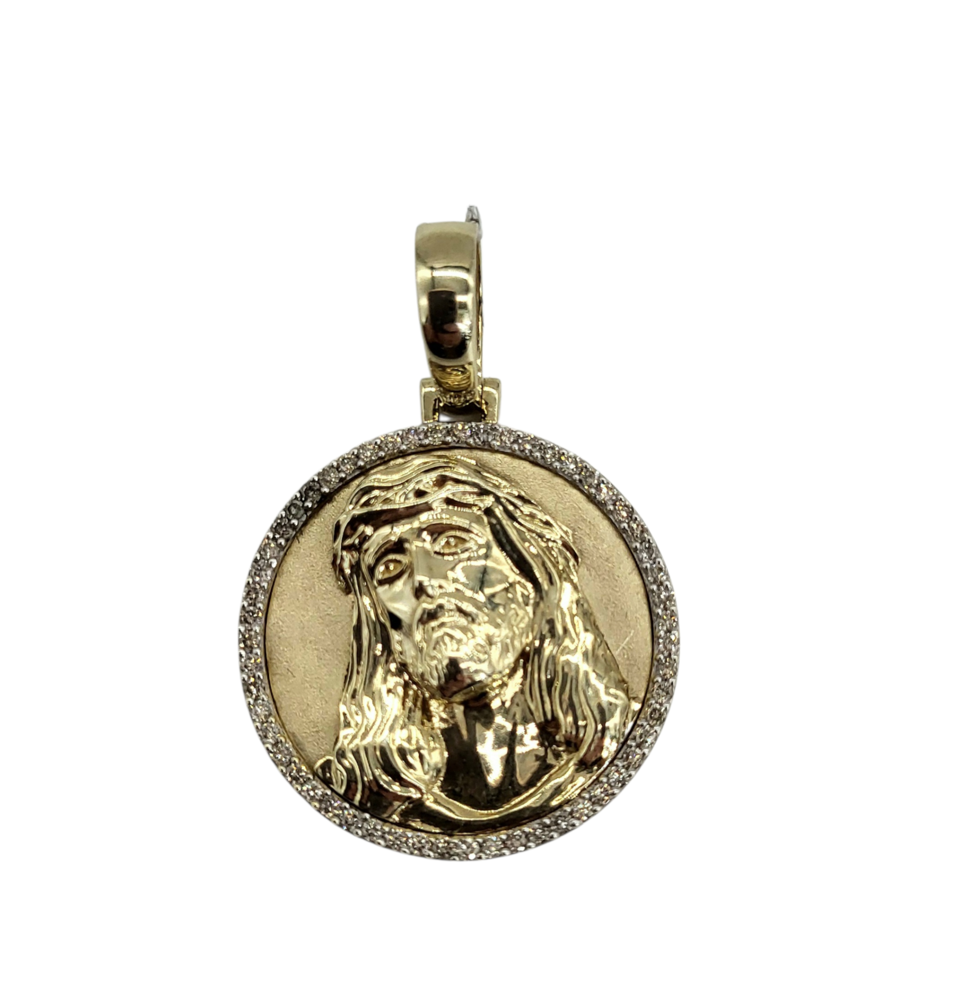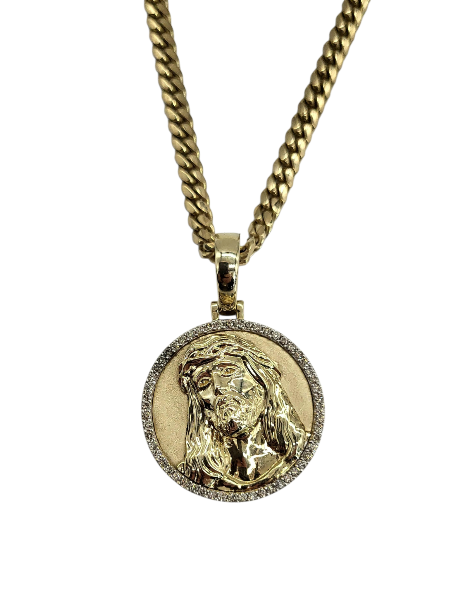 The Round Diamond Jesus Head Pendant features a 1/2 carat total weight diamond border, encased in 10 karat yellow gold. This piece combines durability with elegance, providing a sophisticated accessory option. The chain is sold separately, allowing customization in style and length.