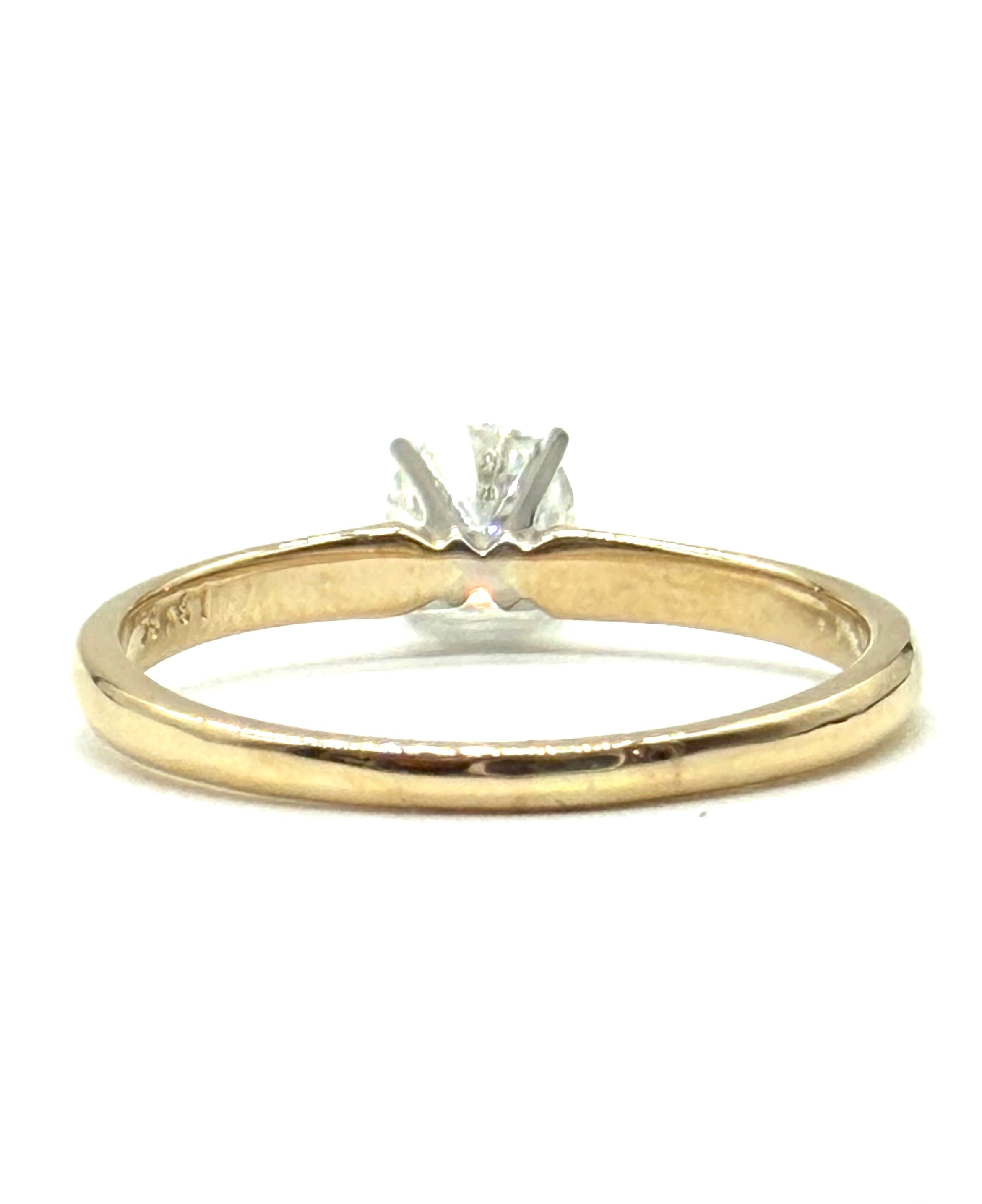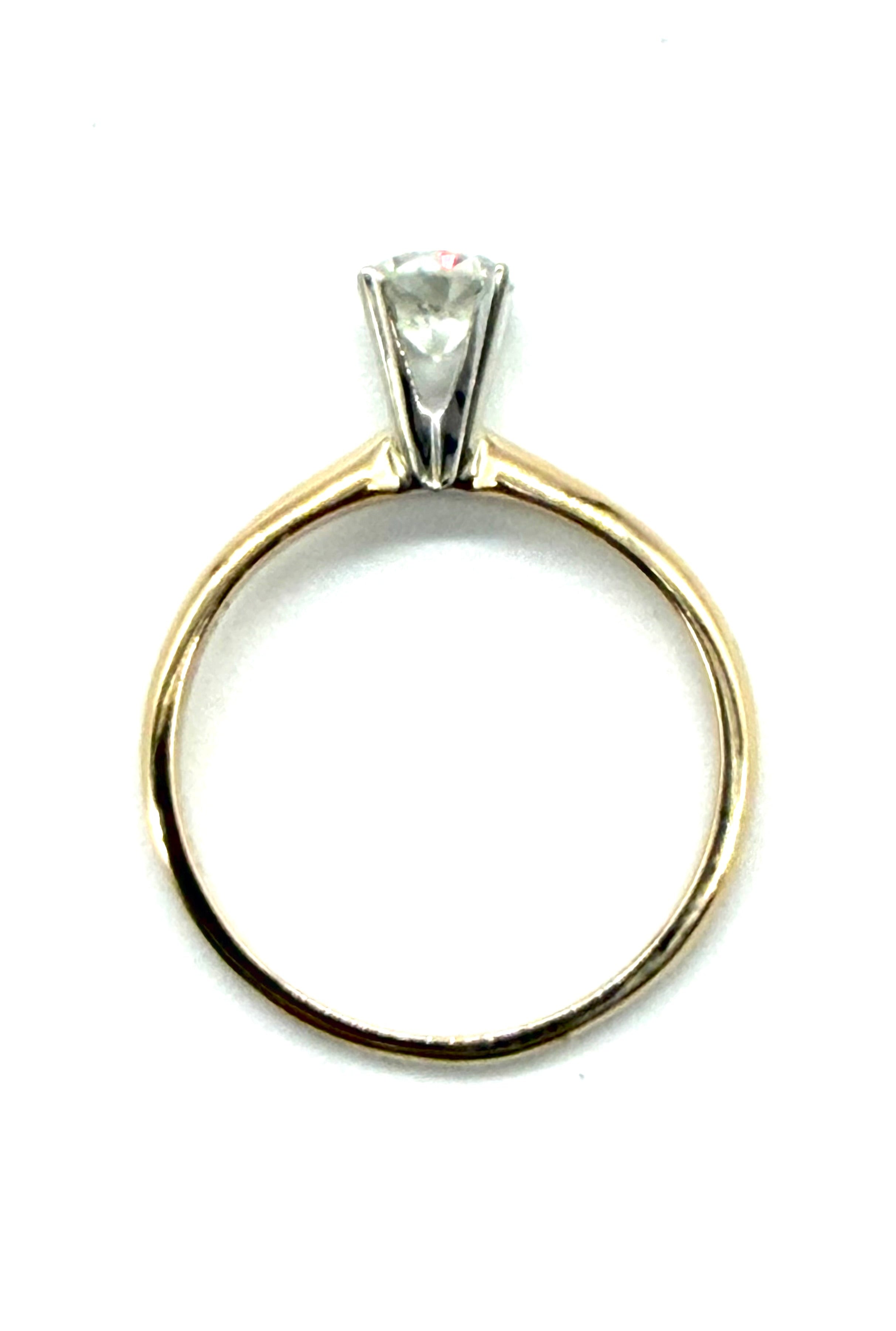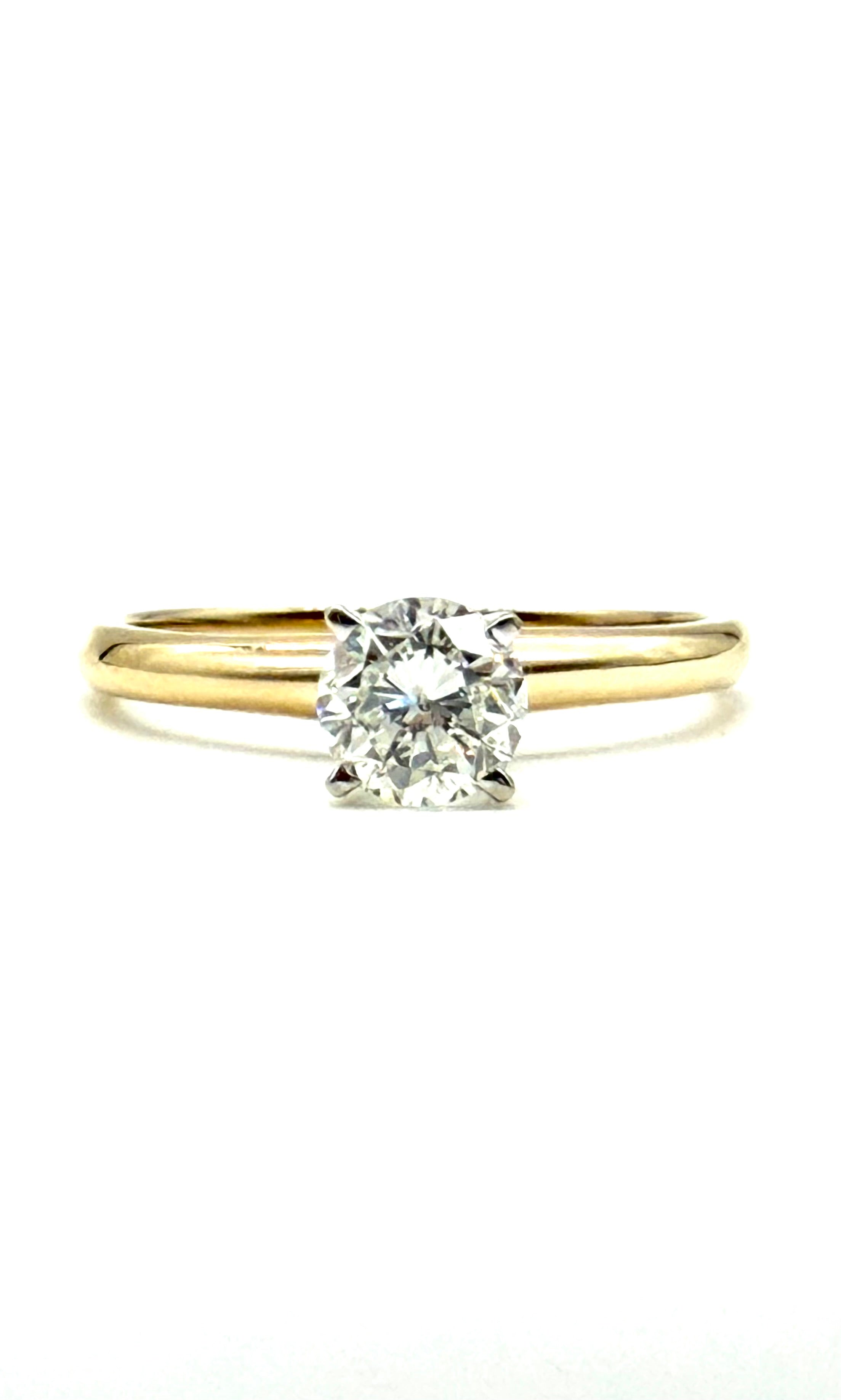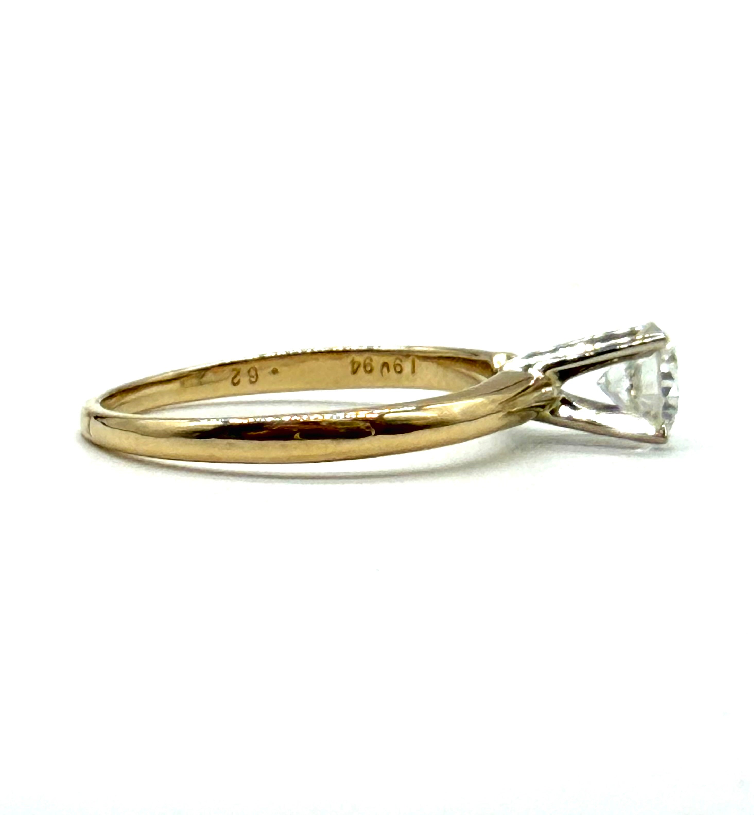 This beautiful solitaire diamond ring is set with a 62 point diamond In 14 Karat yellow and white gold.