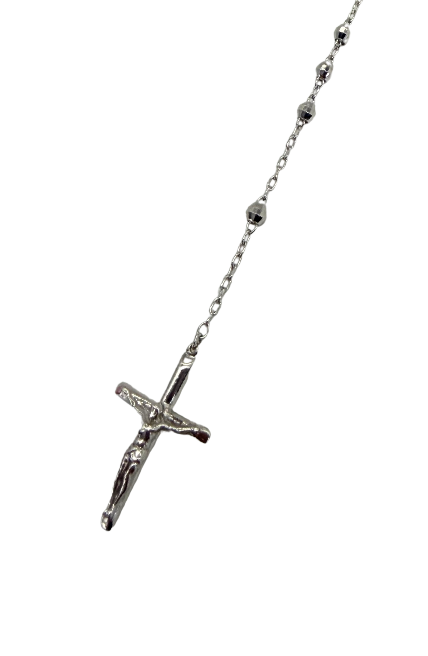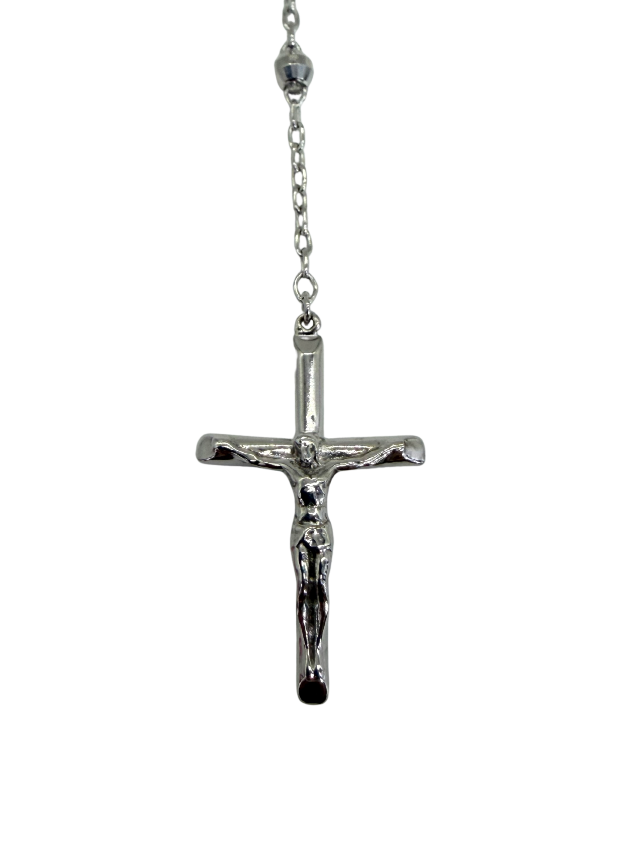 This sterling silver rosary necklace features diamond cut beaded detailing that catches the light beautifully with every movement. The faceted beads create subtle sparkle along the chain, leading to a classic crucifix centerpiece and detailed medallion for a timeless devotional design.