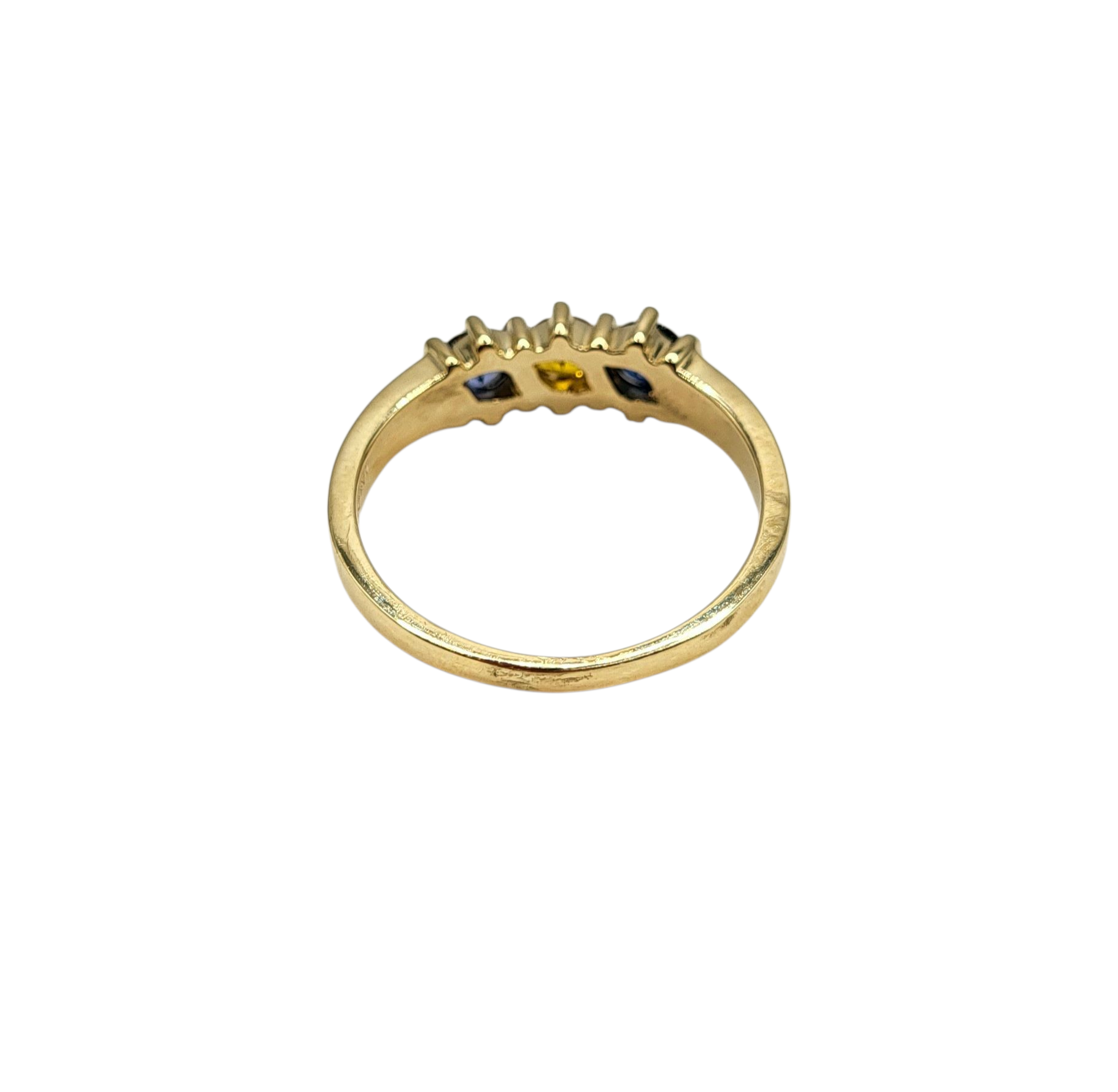 Explore the stunning beauty of this Tanzanite and Citrine 3 Inline Ring. Made of 14 karat gold, this ring features a perfect combination of these two gemstones. Its vibrant colors and elegant design make it a perfect choice for any occasion. Elevate your style with this exquisite ring.
