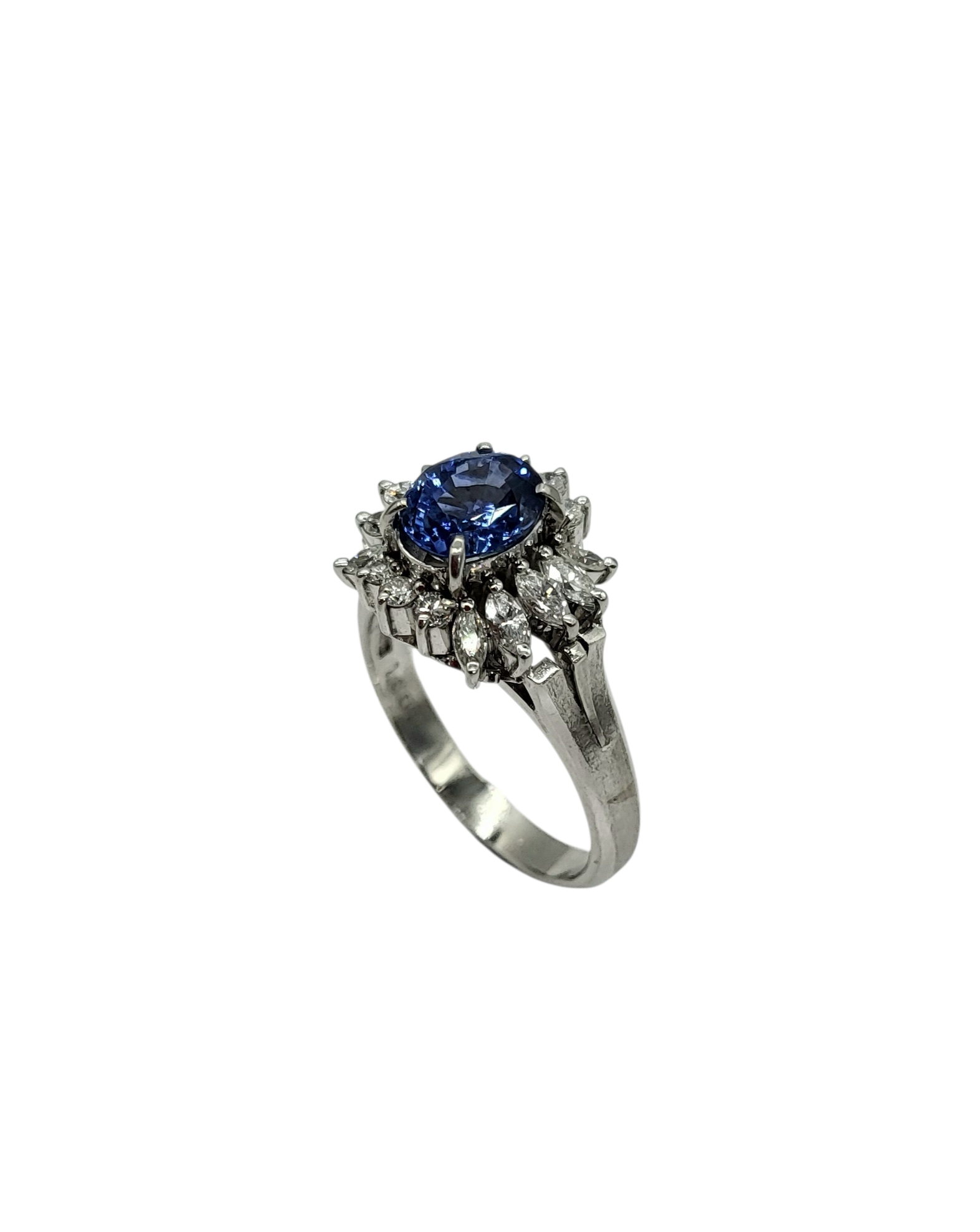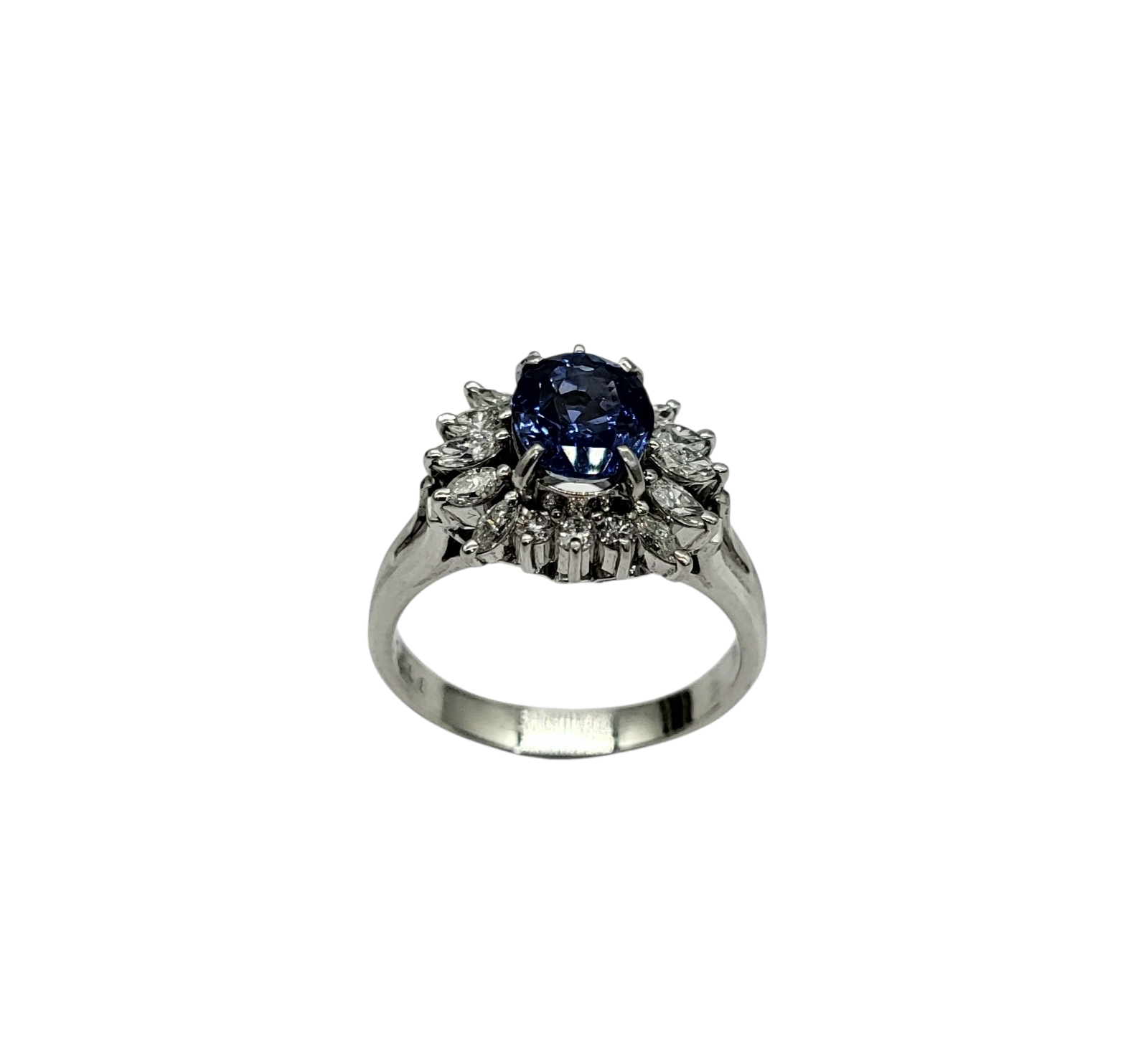 Experience the elegance of our Tanzanite and Diamond Halo Ring in Platinum. Featuring a stunning 1.66-carat oval tanzanite surrounded by a radiant halo of marquise and round diamonds, this ring combines luxurious design with timeless beauty. It's the perfect accessory for those special moments in life.