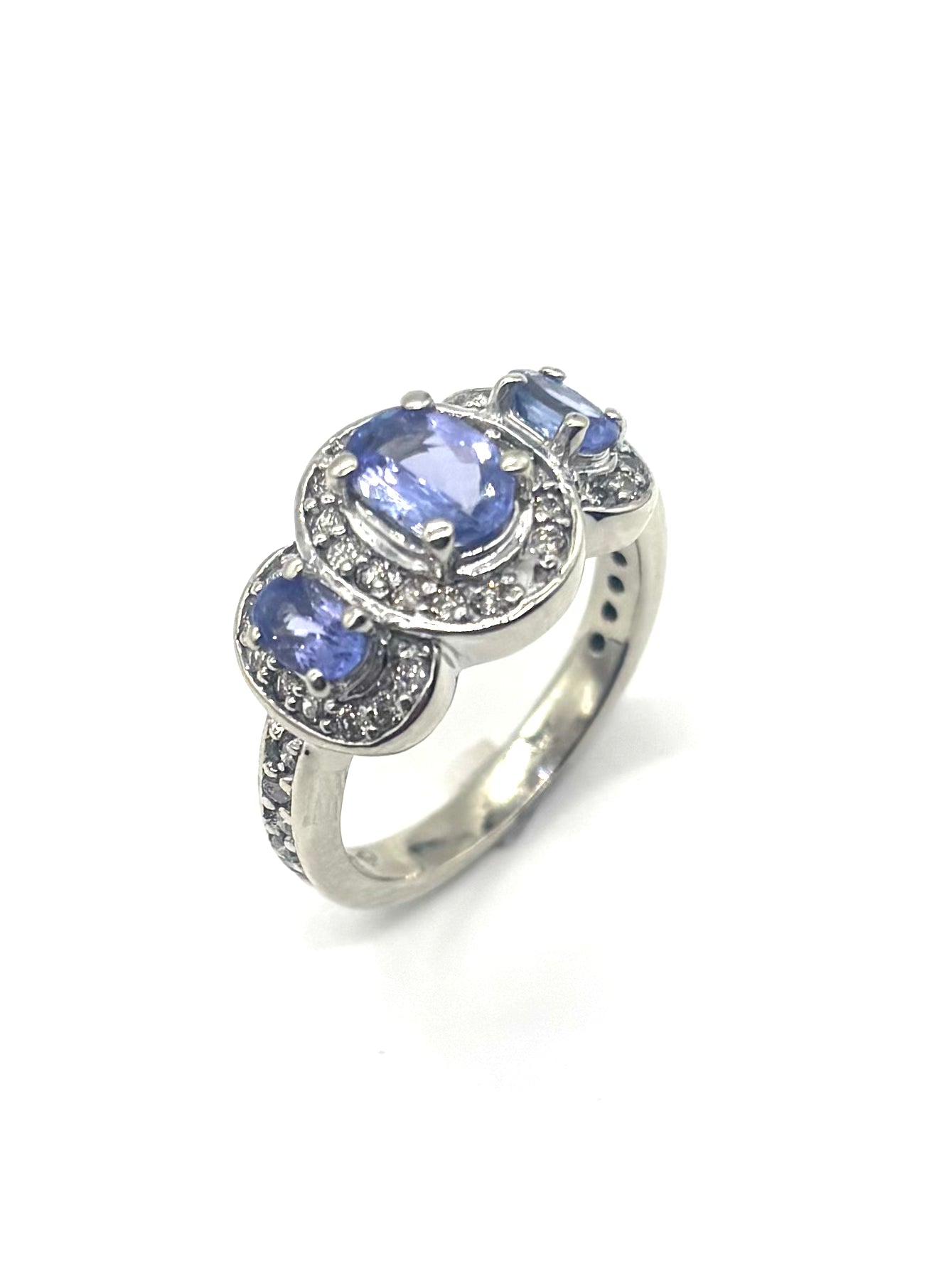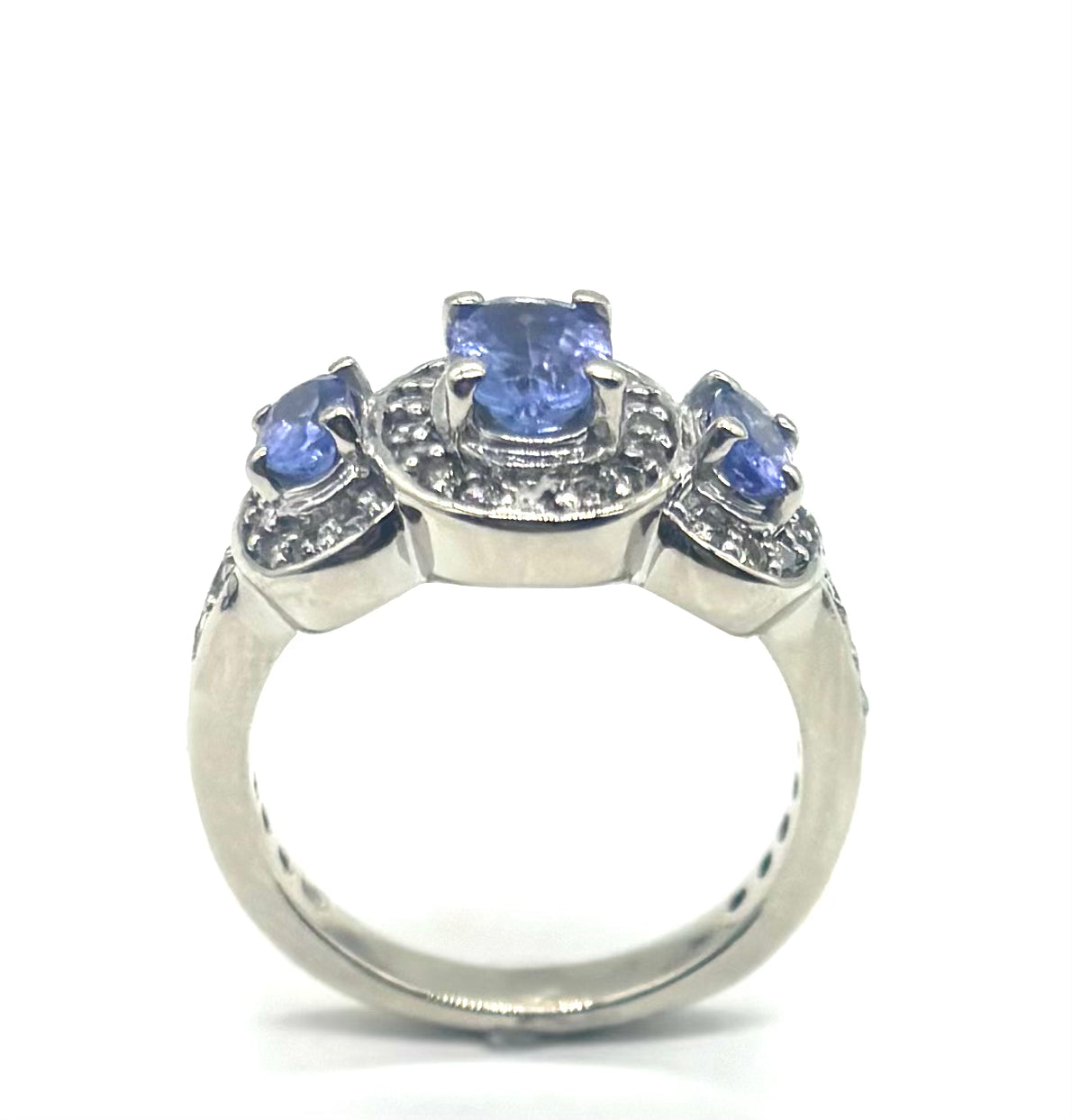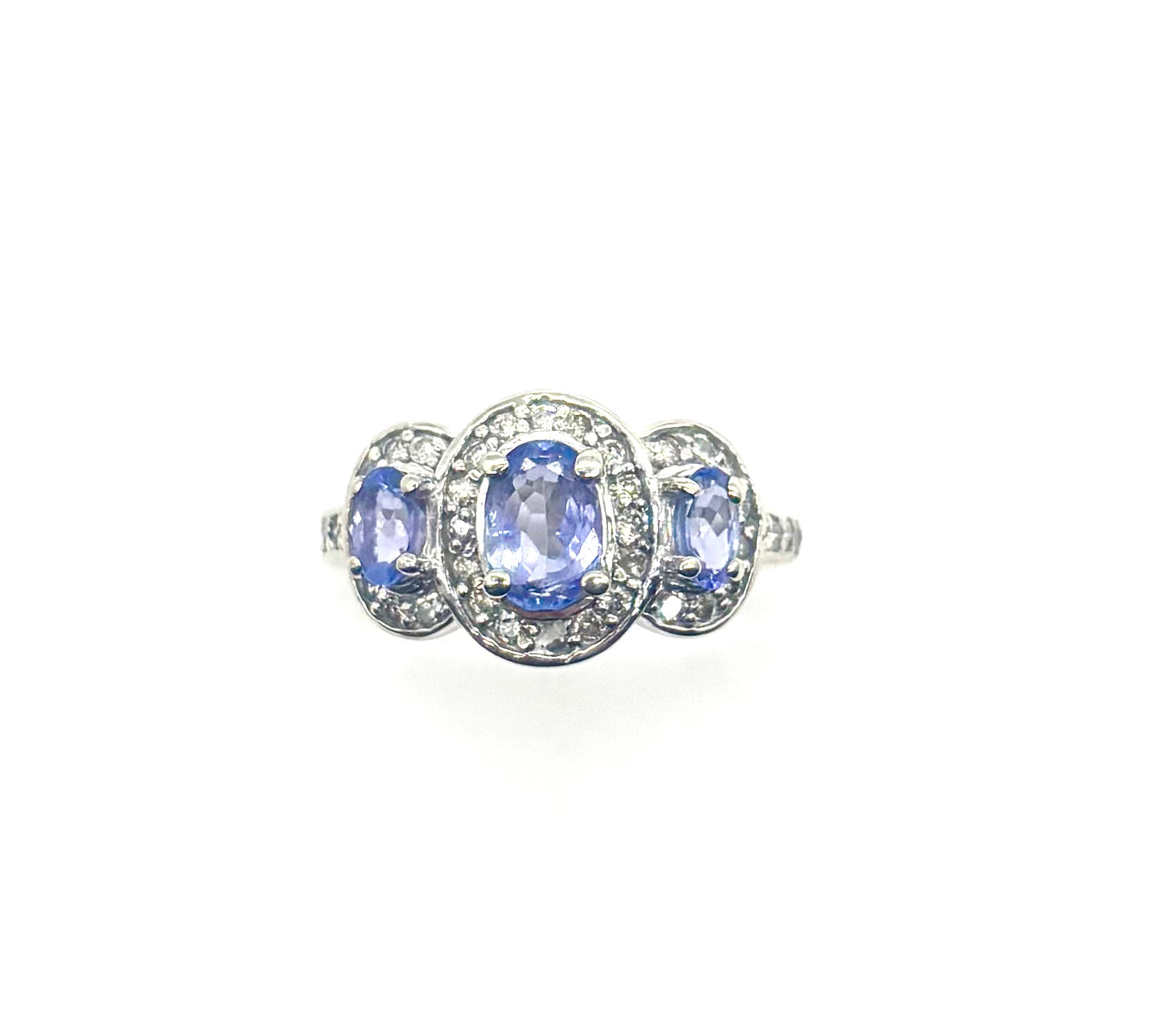 Three Stone Tanzanite & Diamond Halo Ring- 14k White Gold