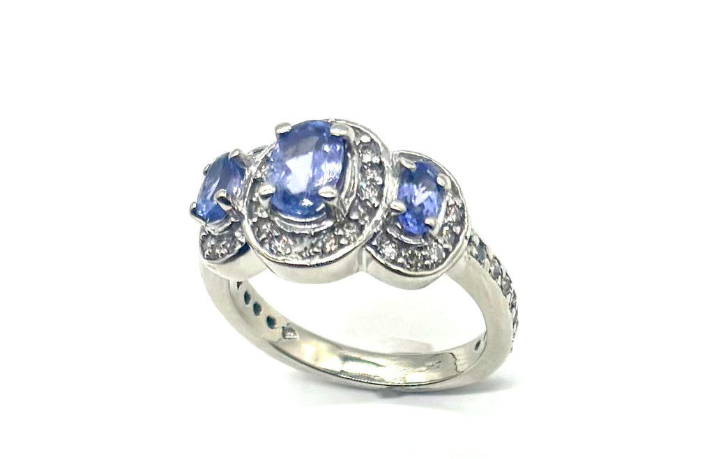 Add timeless sophistication to your jewelry collection with this stunning pre-owned ring. Crafted in 14K white gold, this piece showcases three captivating oval-cut tanzanite stones, each framed by a delicate halo of sparkling diamonds. Additional ½ carat total weight (ctw) of diamond accents enhance the ring’s brilliance and charm.