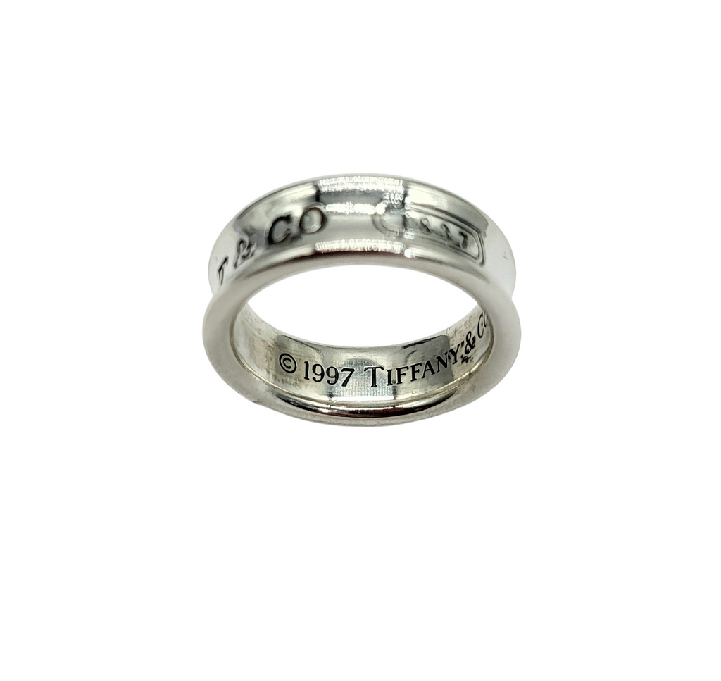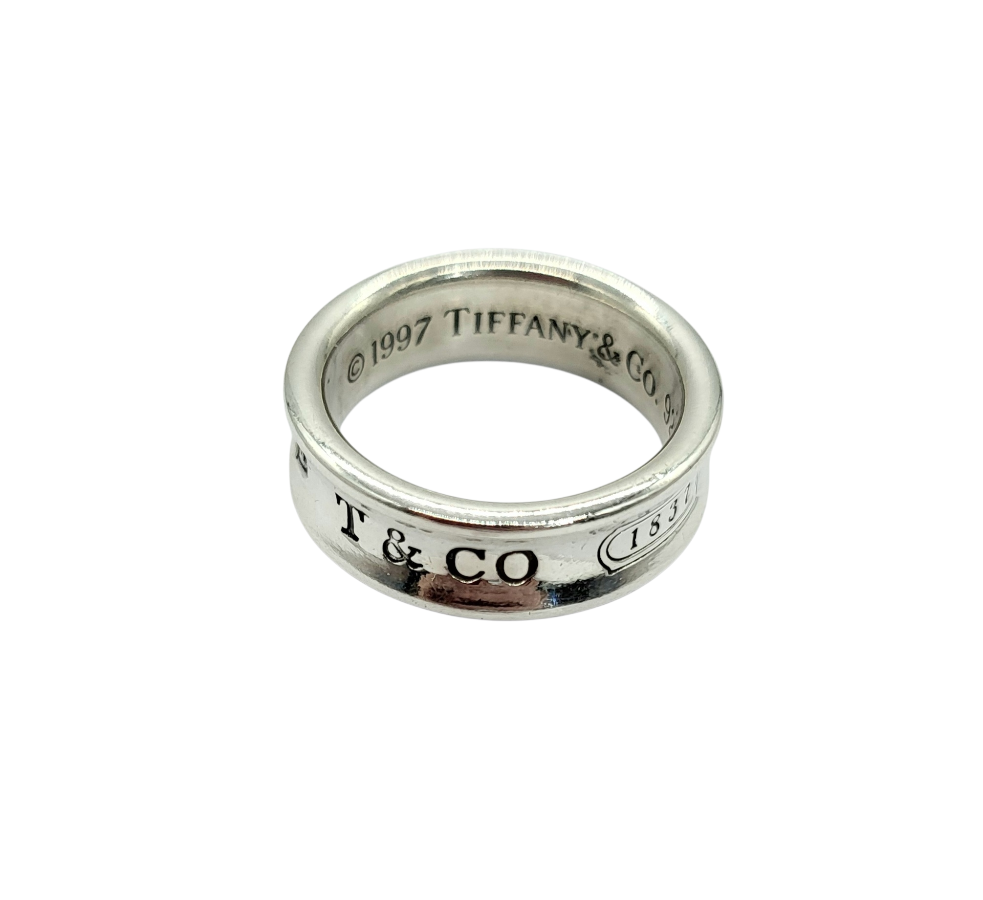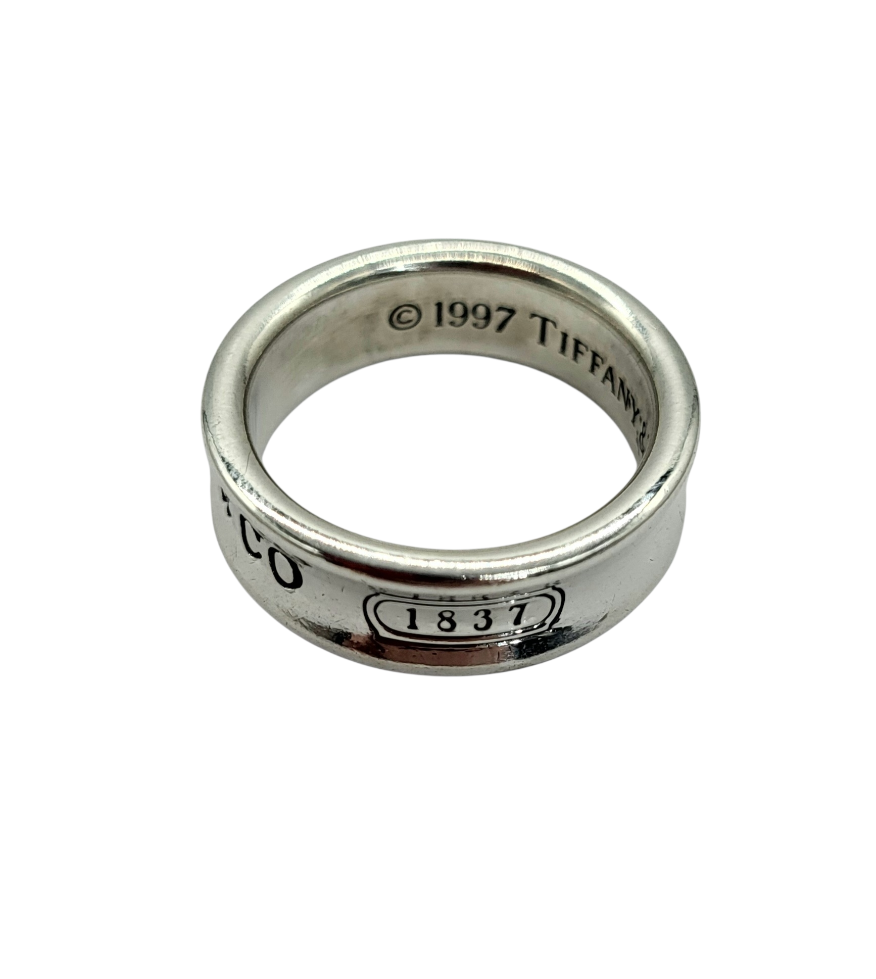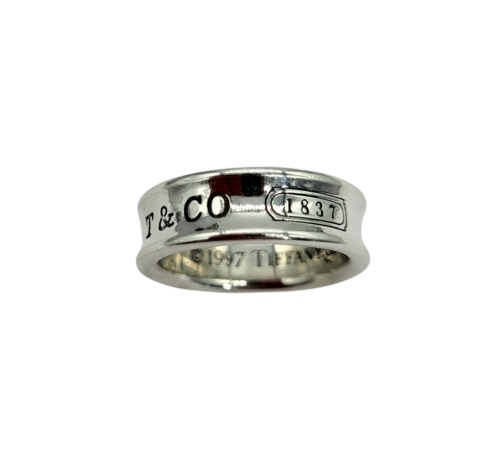 "Get ready to add some designer flare to your jewelry collection with Tiffany & Company's Sterling Silver Band! This concave 1837 ring boasts the iconic Tiffany & Company inscriptions, making it the perfect accessory for any look. Elevate your style game with this unique and classic piece."