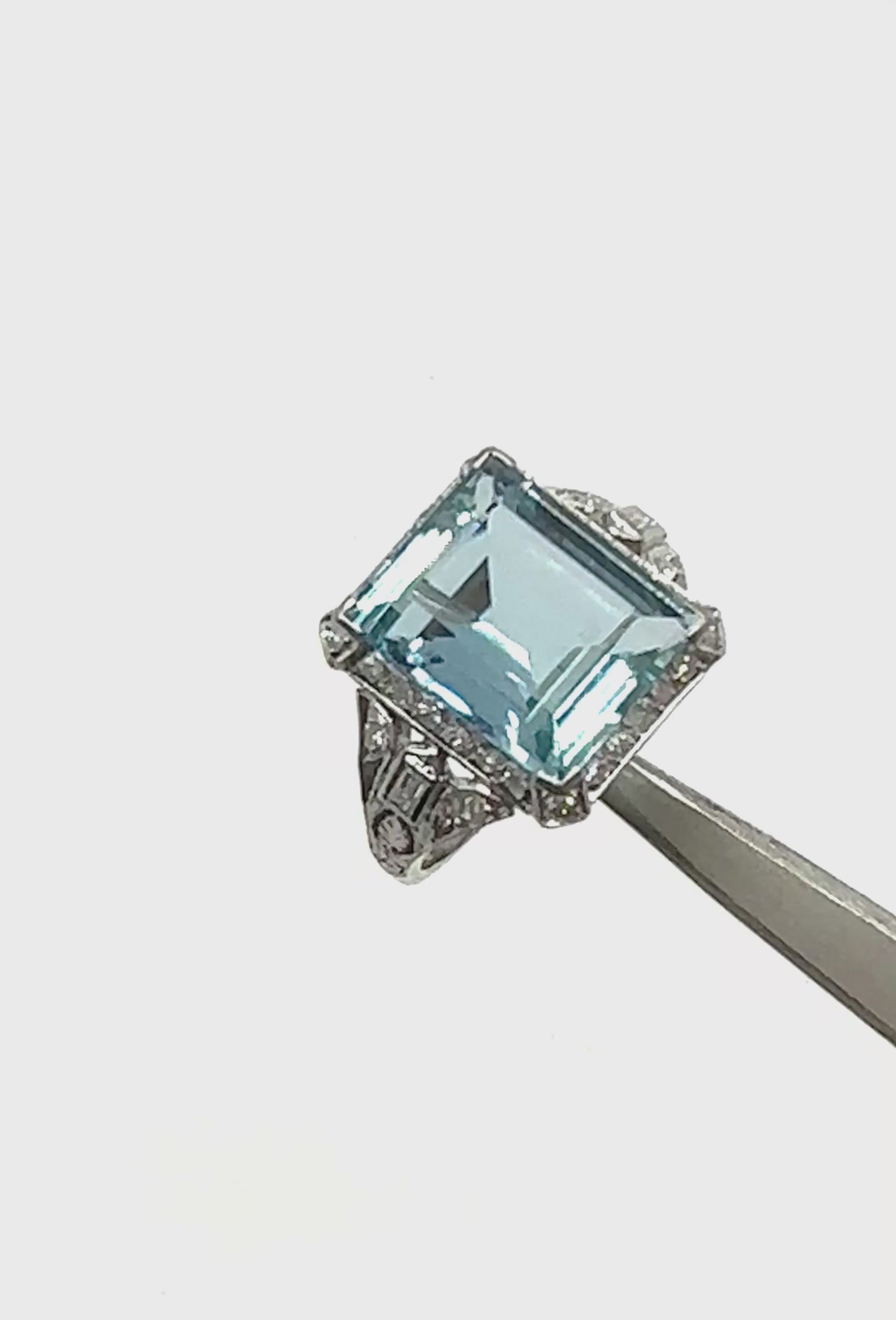 This elegantly beautiful Vintage emerald cut Aquamarine ring is set with a half carat of diamonds in platinum.