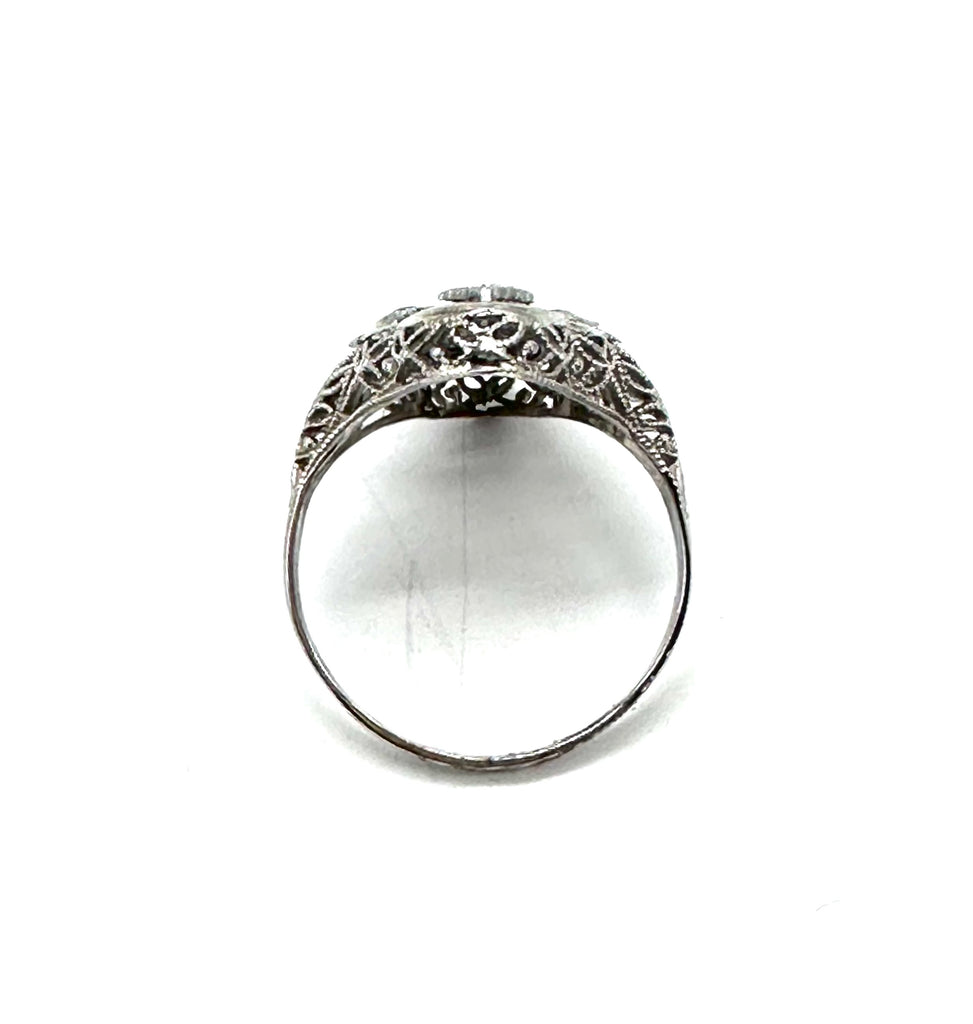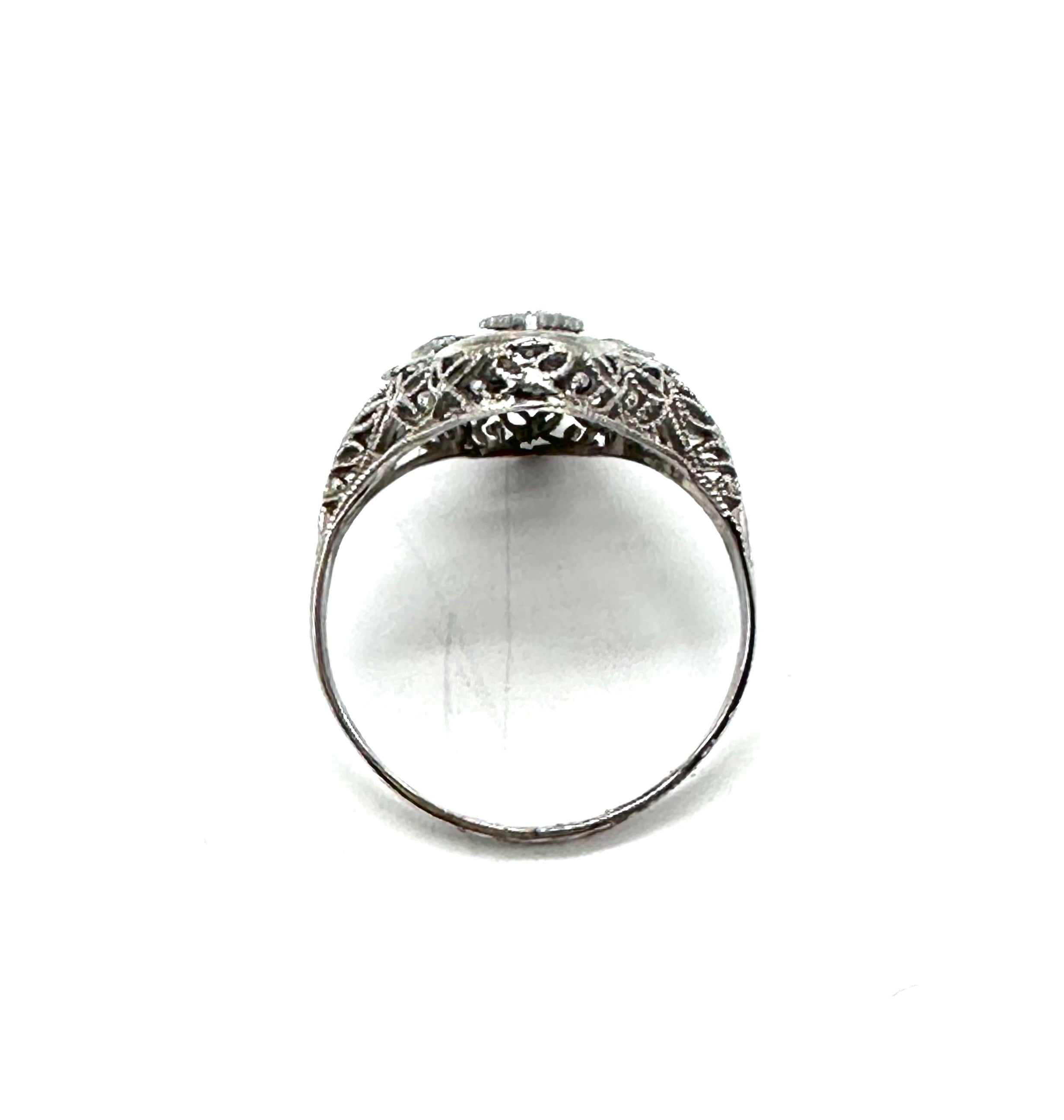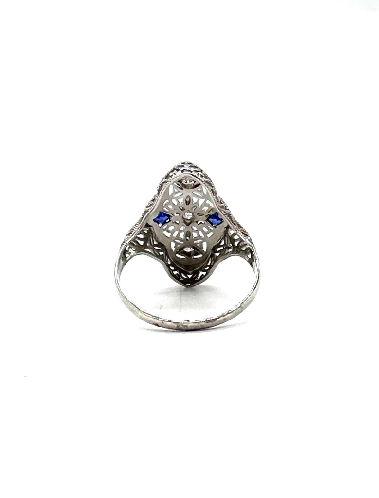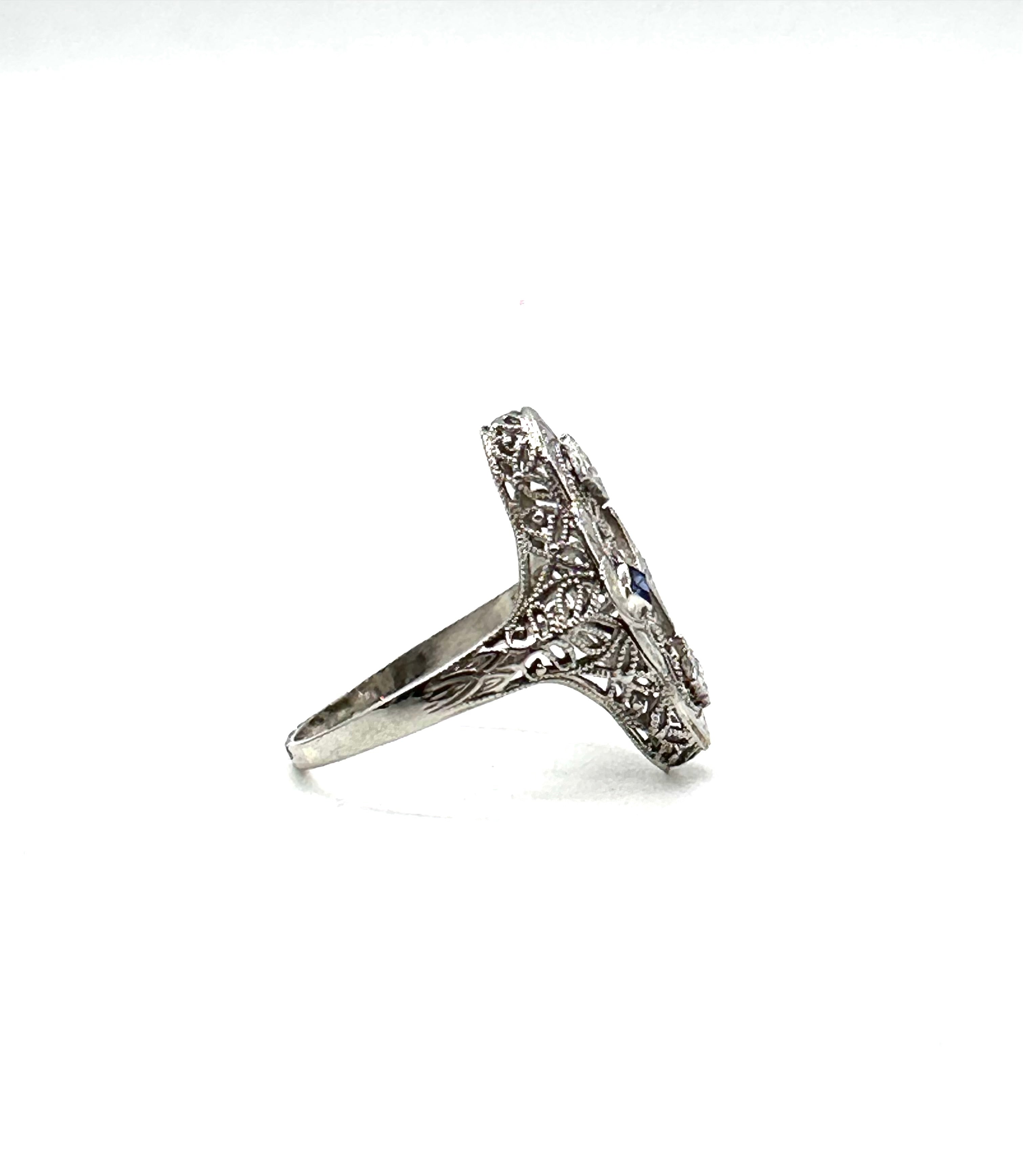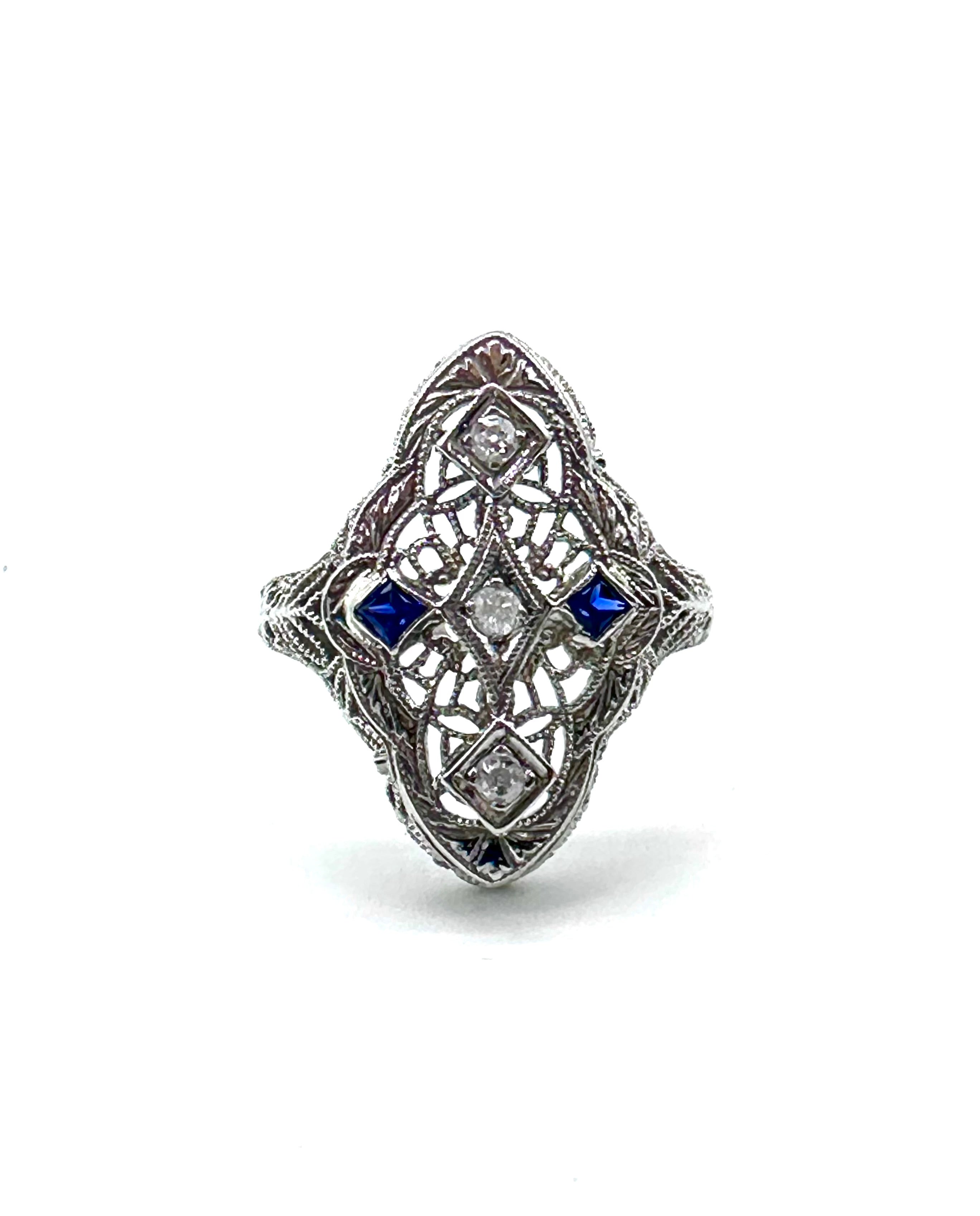 This captivatingly beautiful vintage sapphire and diamond Filigree ring is set in 14 karat white gold.