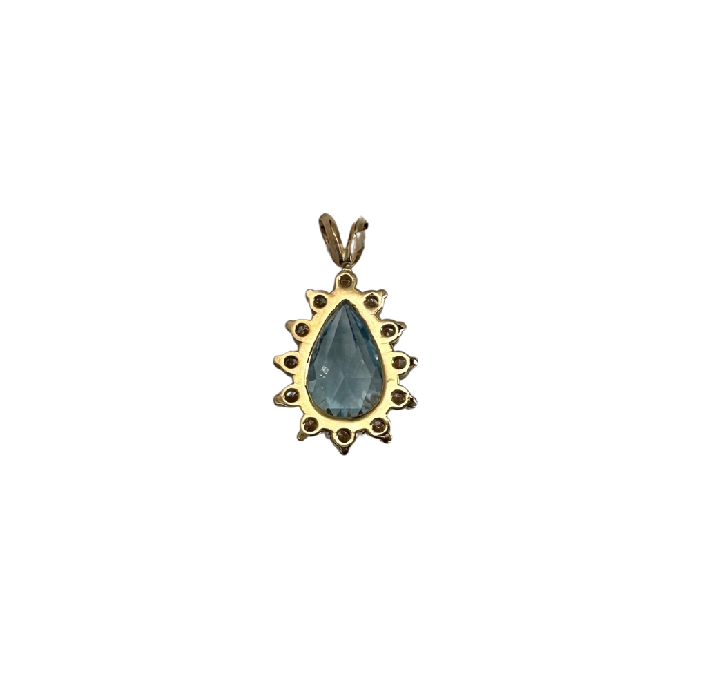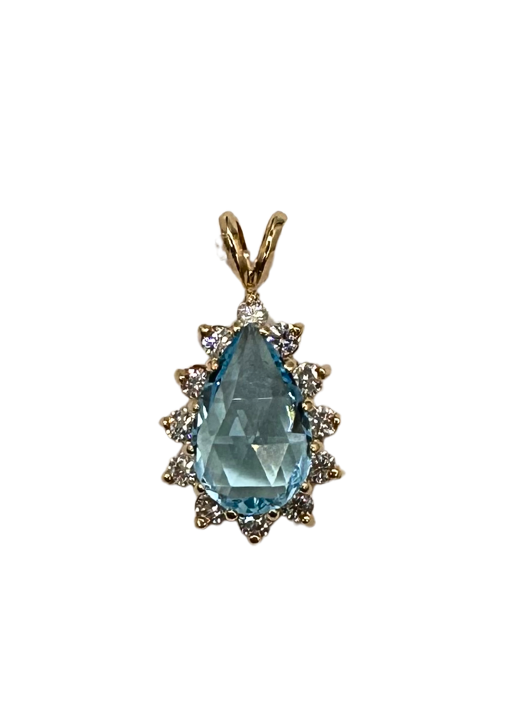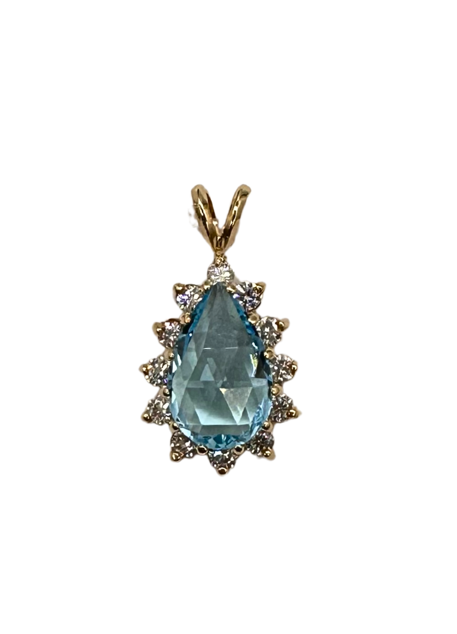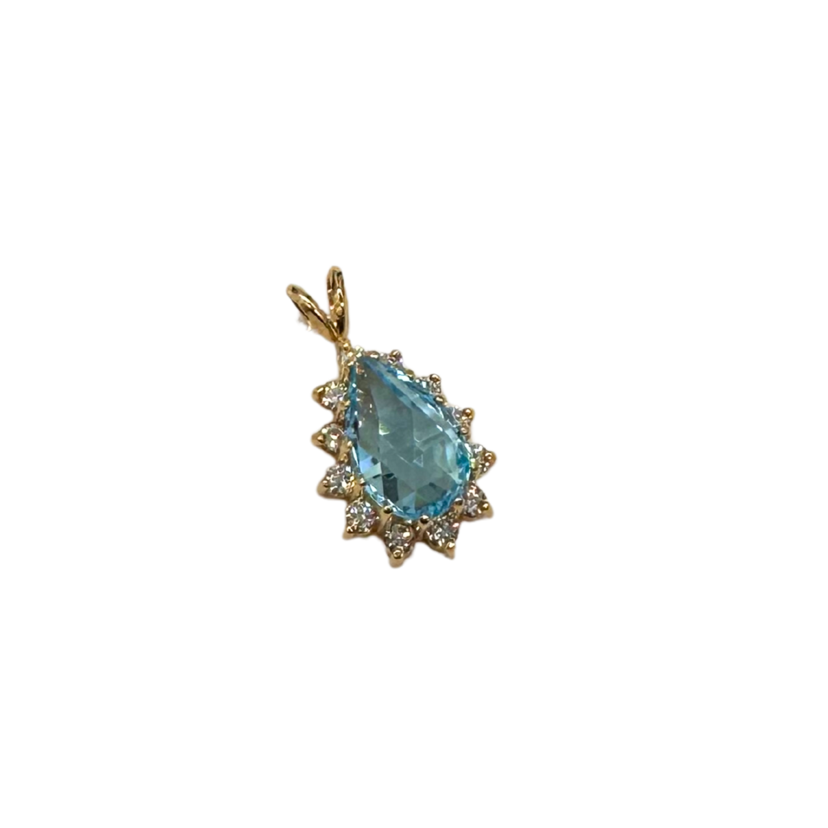 This dazzling pendant showcases a pear-shaped blue topaz surrounded by a brilliant halo of lab-grown diamonds, all set in 14K yellow gold. The radiant blue gemstone draws the eye with its striking sparkle, while the diamond halo enhances its elegance with just the right touch of brilliance. With a refined finish and smooth gold bale, this pendant makes a luxurious statement whether worn daily or reserved for special occasions.