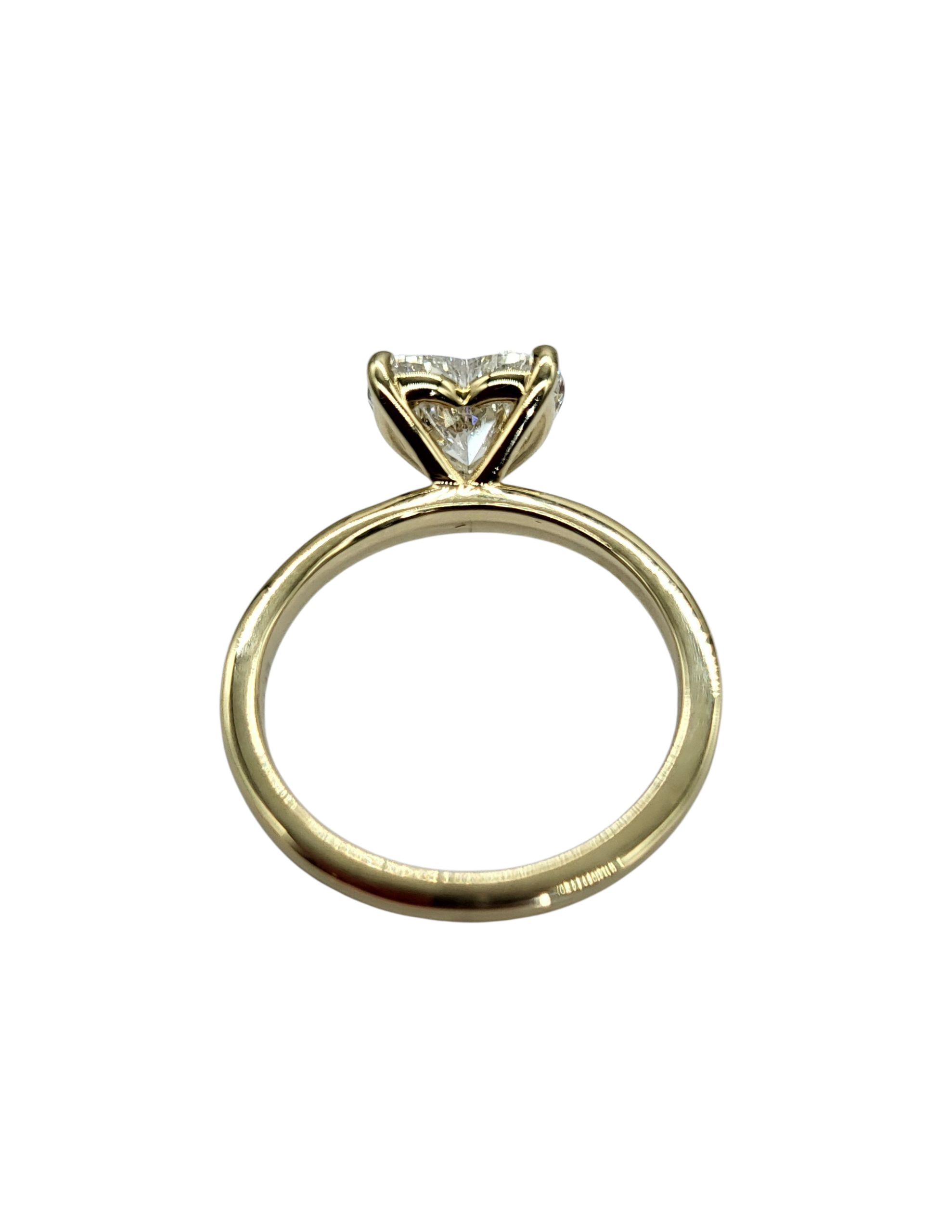 "Make their heart skip a beat with our dazzling 2.07 carat heart shaped lab grown diamond ring in 14 karat yellow gold. A modern twist on a classic symbol of love, this ring is a stunning and ethical choice for the one you love. No mines, all love."