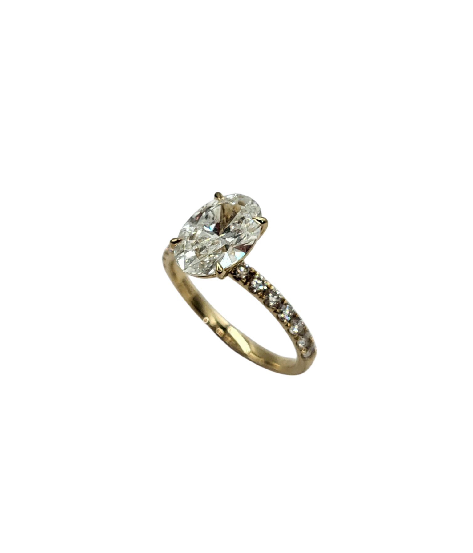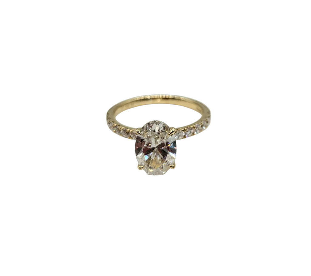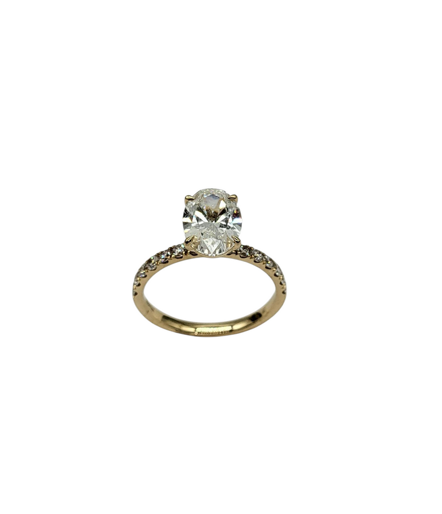 Experience the beauty and brilliance of our new 2.59 carat total weight oval lab grown diamond ring. The oval center diamond is complemented by additional round diamonds on the semi-mount, creating a stunning and sophisticated look. Embrace the future of sustainable luxury with this one-of-a-kind piece.