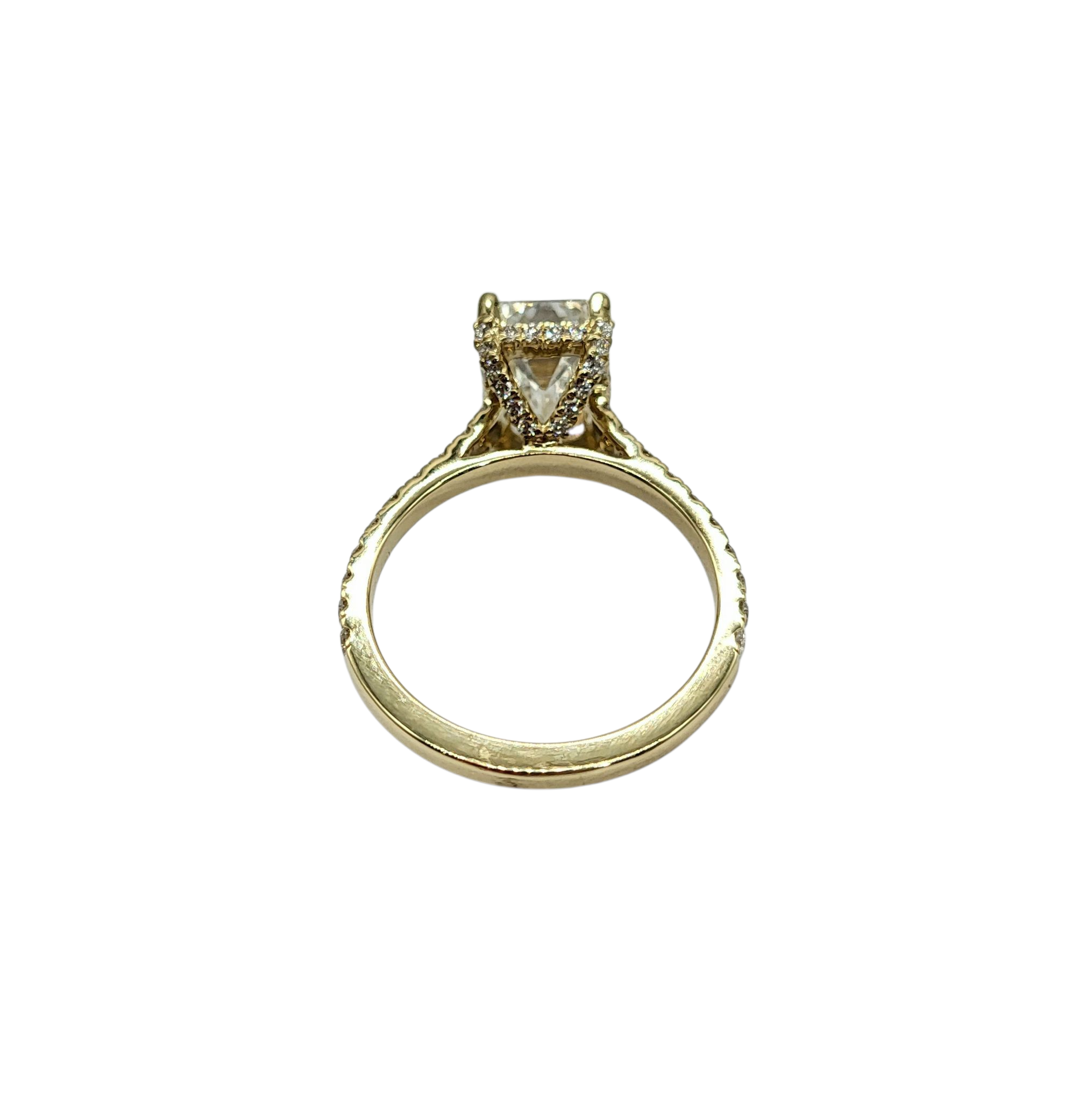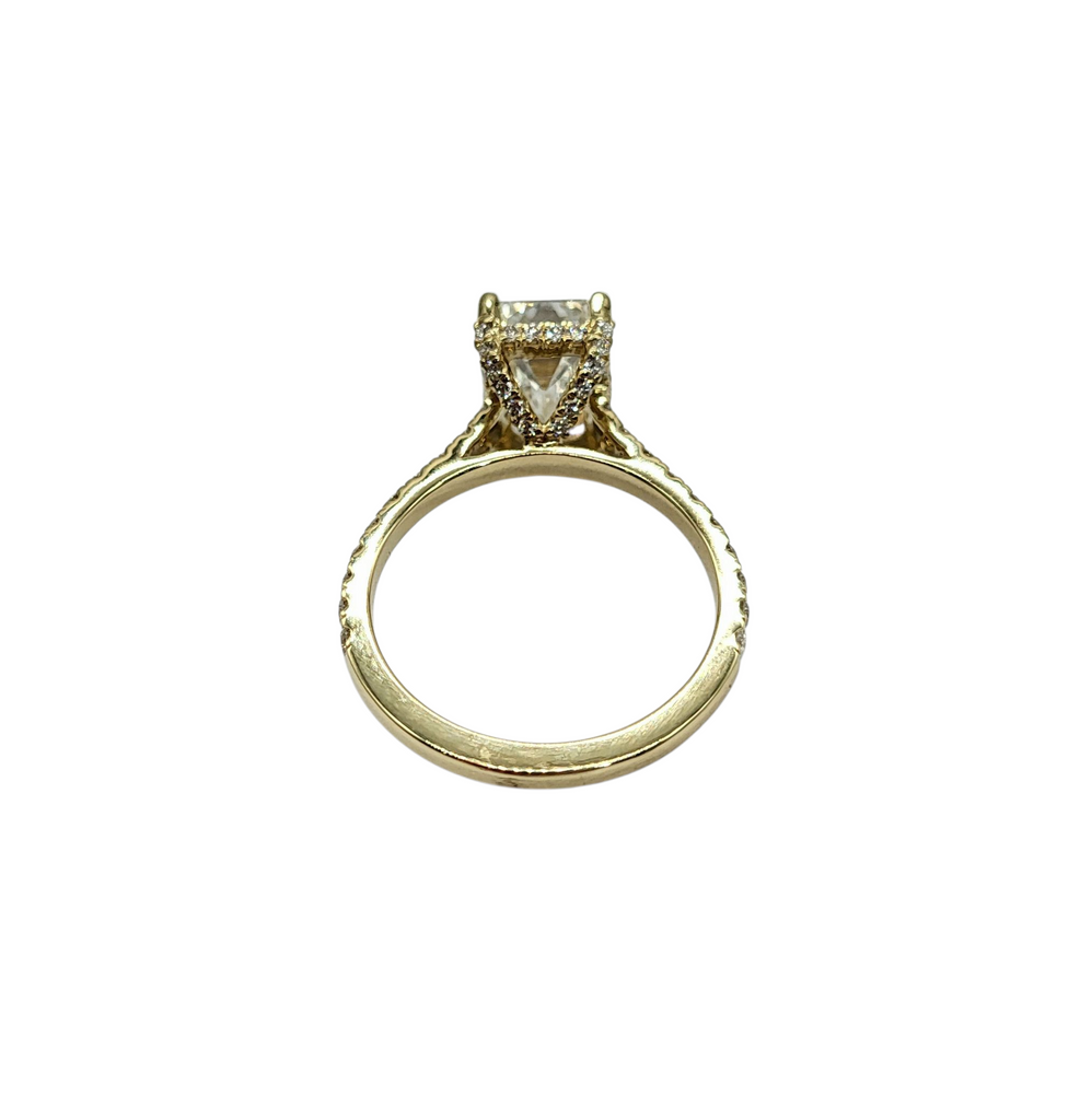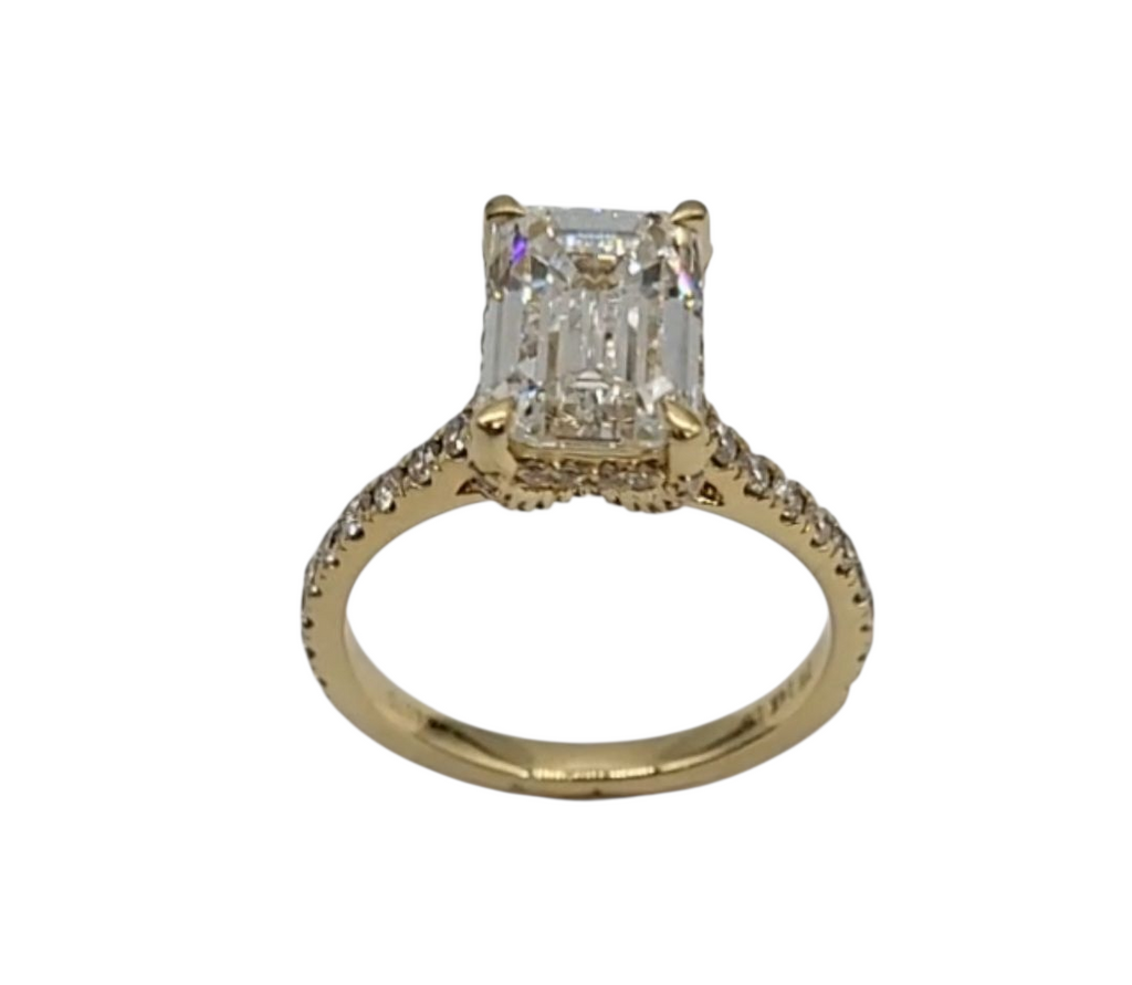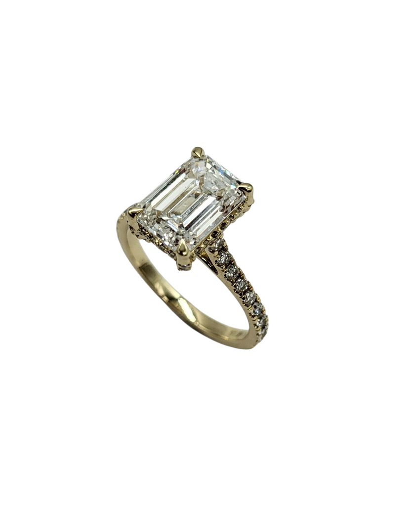 Elevate your style with our 3.89 Carat Total Weight Emerald Cut Lab Grown Diamond Ring. Crafted with 14 karat yellow gold and featuring a stunning 3 carat lab grown emerald cut diamond at the center, this ring exudes an air of sophistication and luxury. Adorned with an additional 89 PTW lab round diamonds, it is the perfect statement piece for and engagement ring or any occasion.