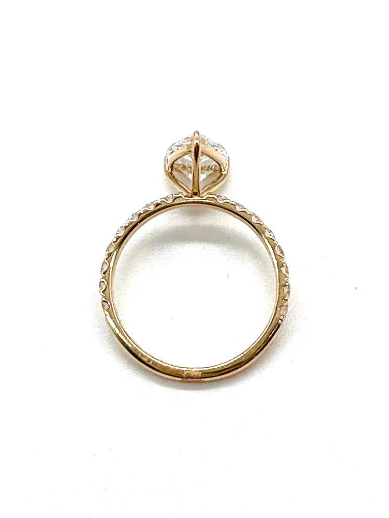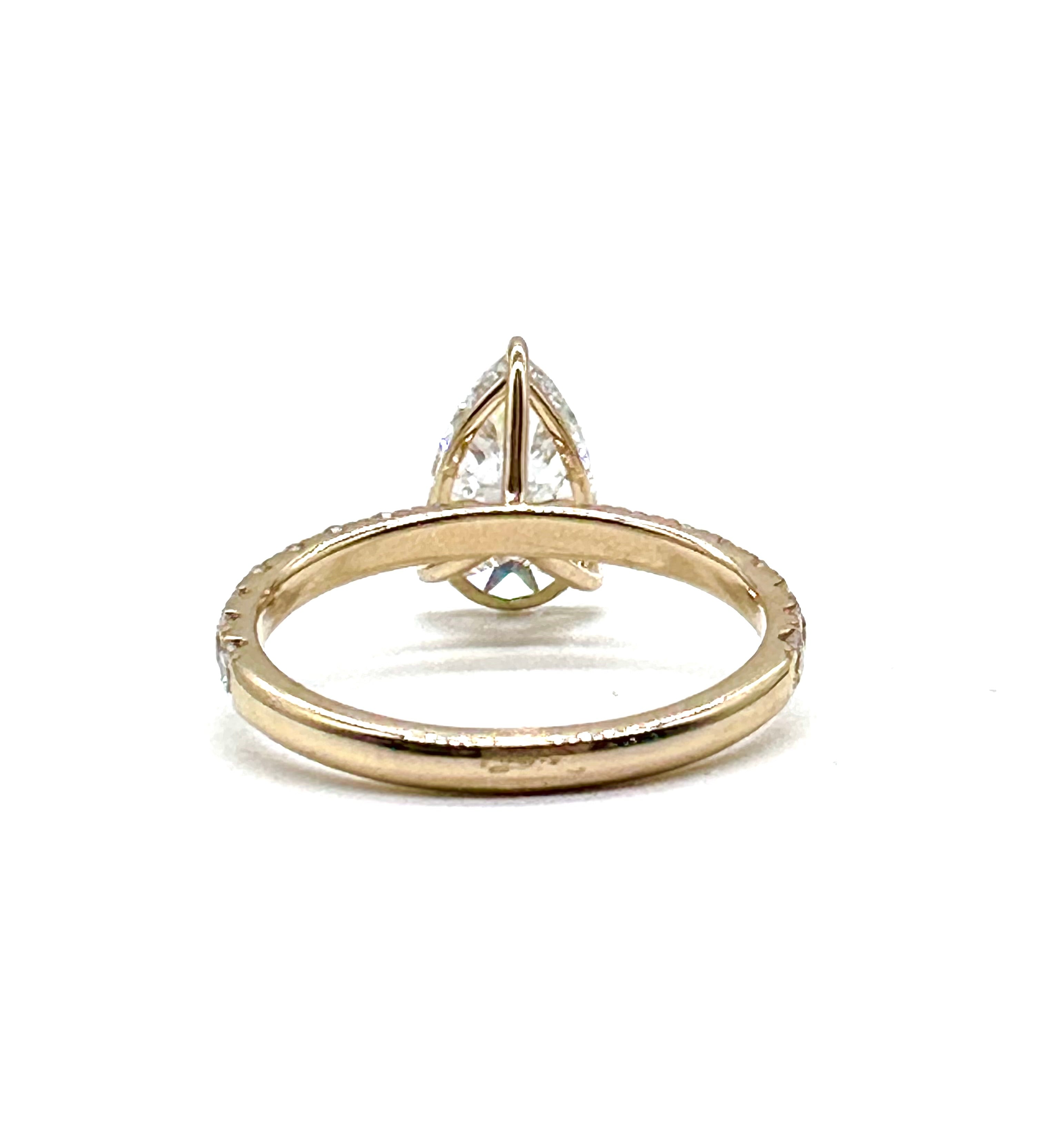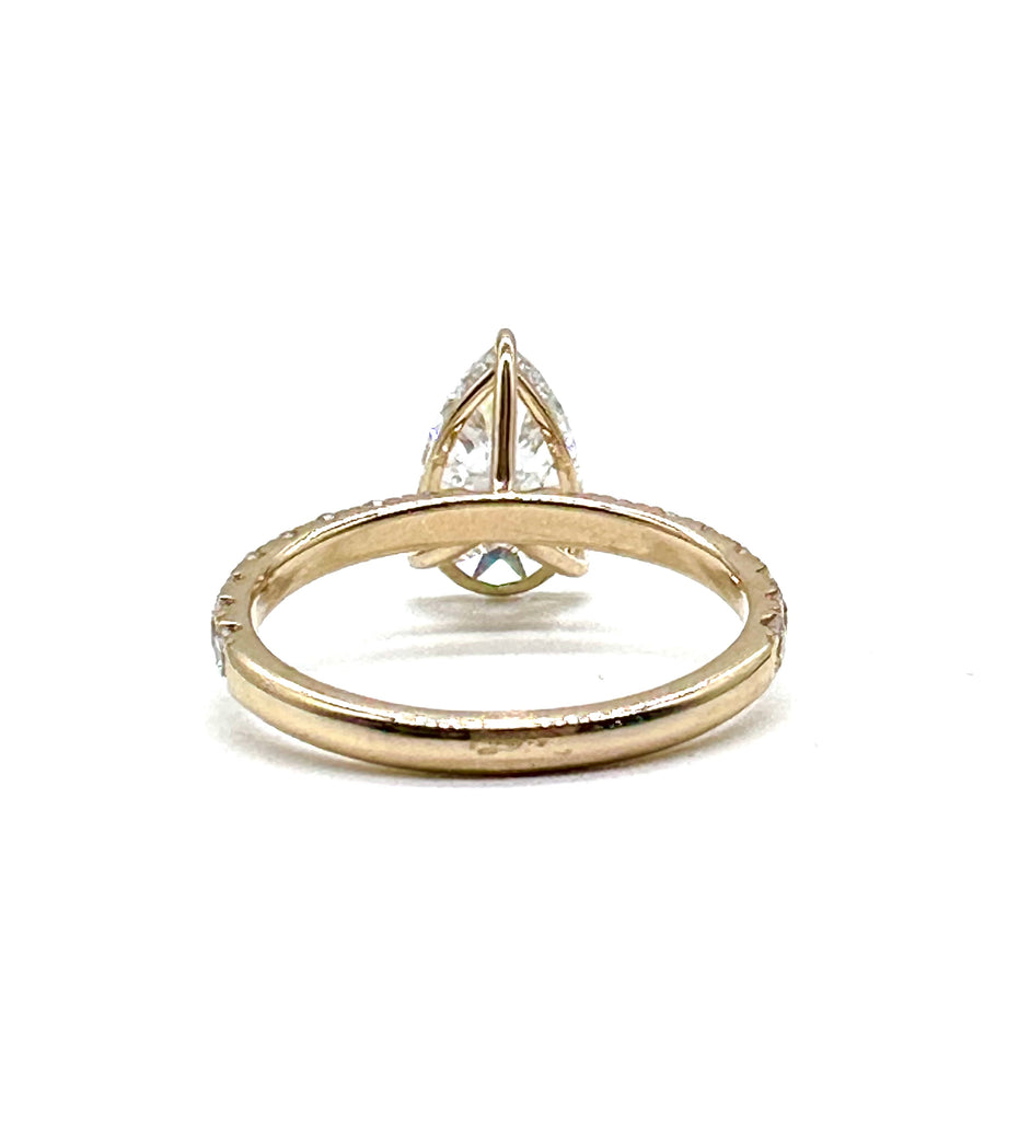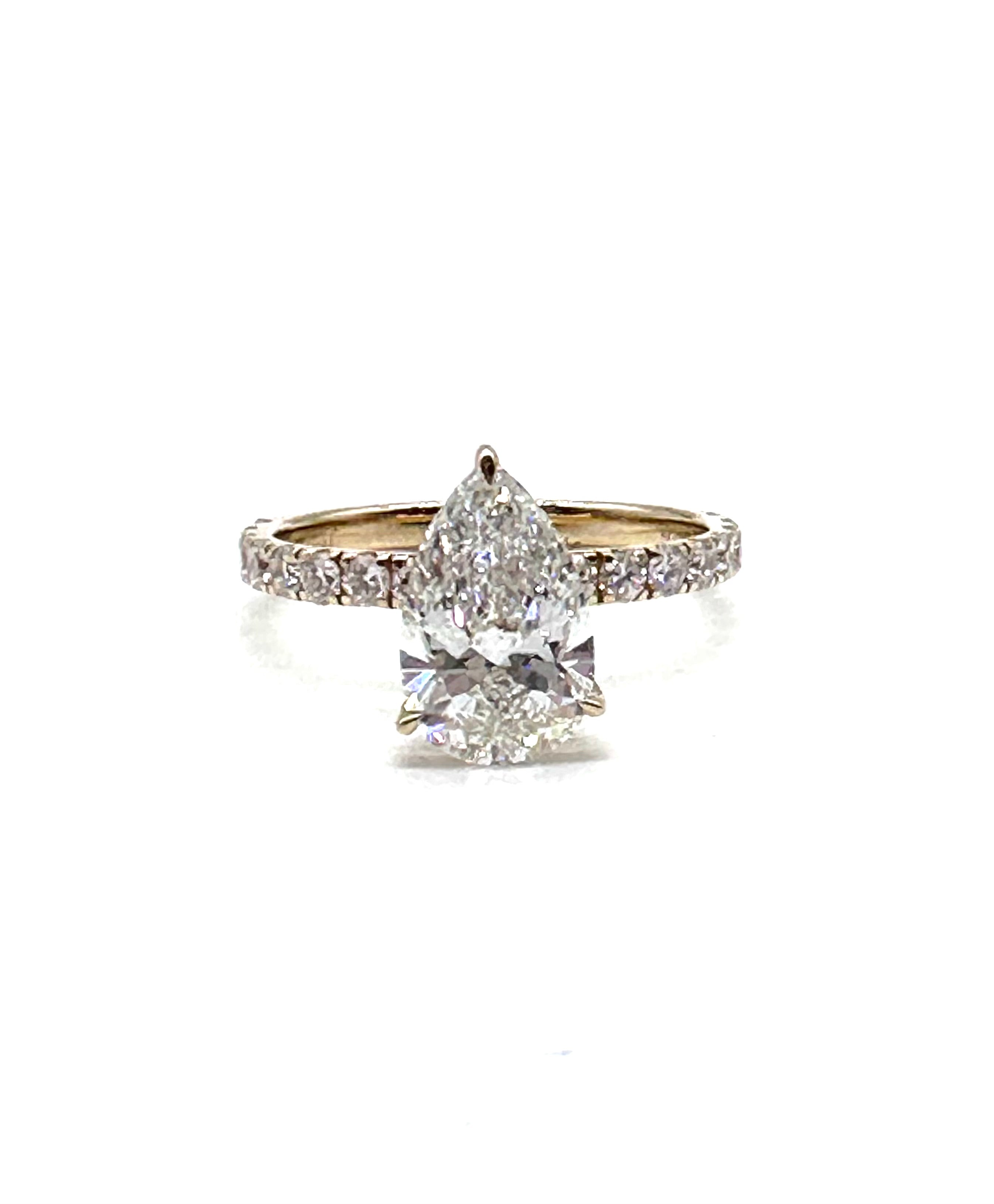 This breathtaking 2.56 total carats lab grown pair shaped diamond ring is stunningly accented with round side diamonds in 14 karat gold.