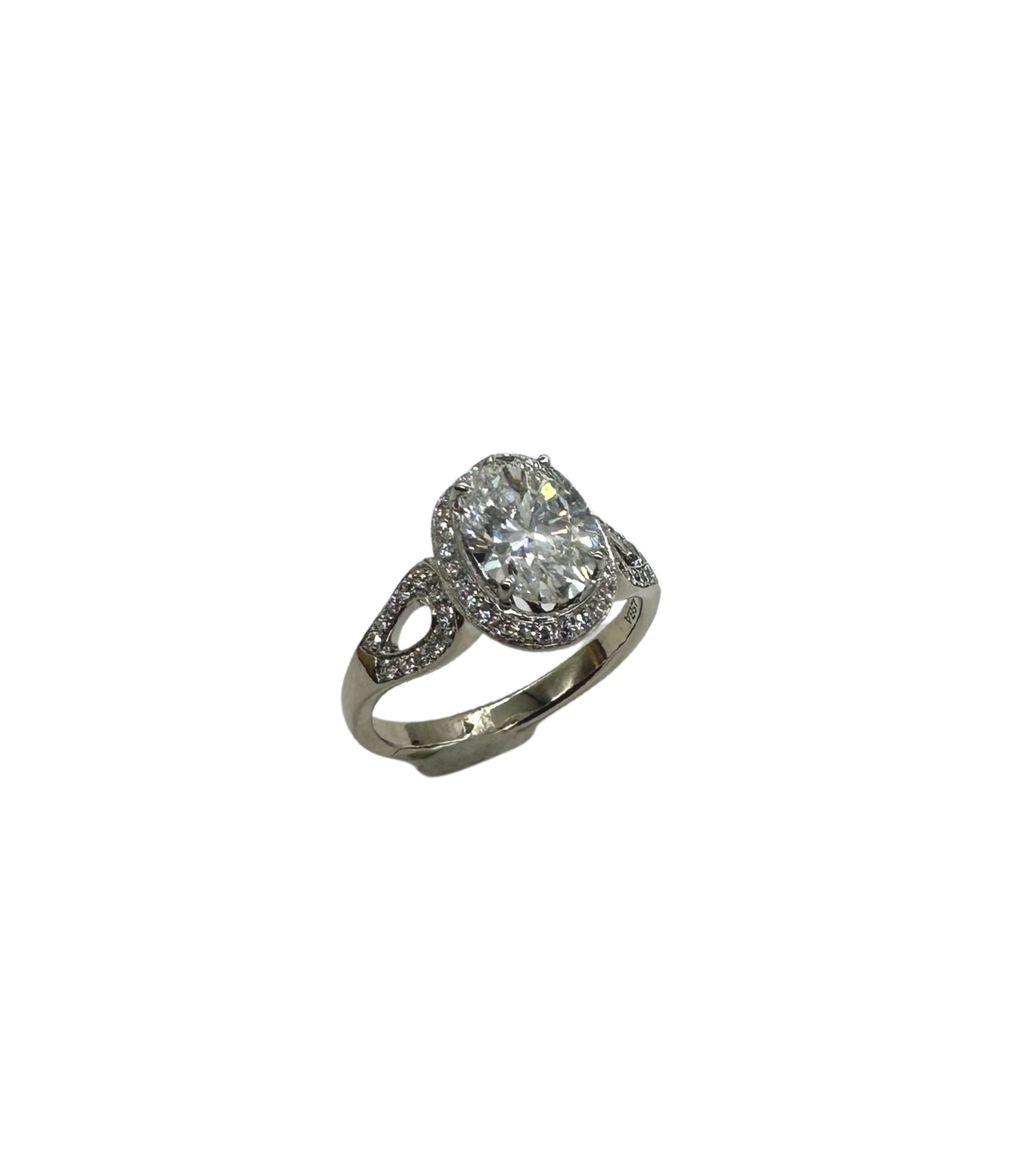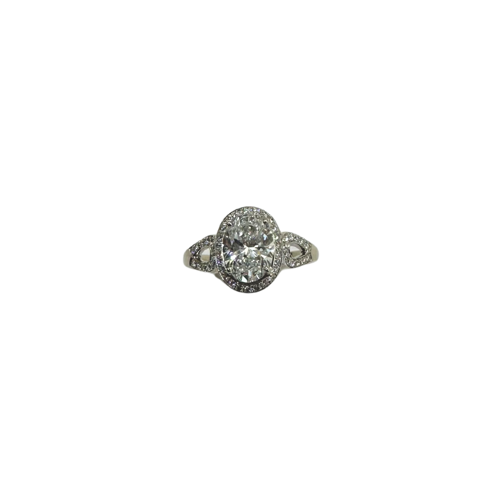 A ring of timeless sophistication, this piece features a captivating 2.35 carat total weight oval lab diamond set in lustrous 14k white gold. The center diamond is surrounded by a shimmering halo and complemented by intricate side accents, designed to catch the light from every angle.
