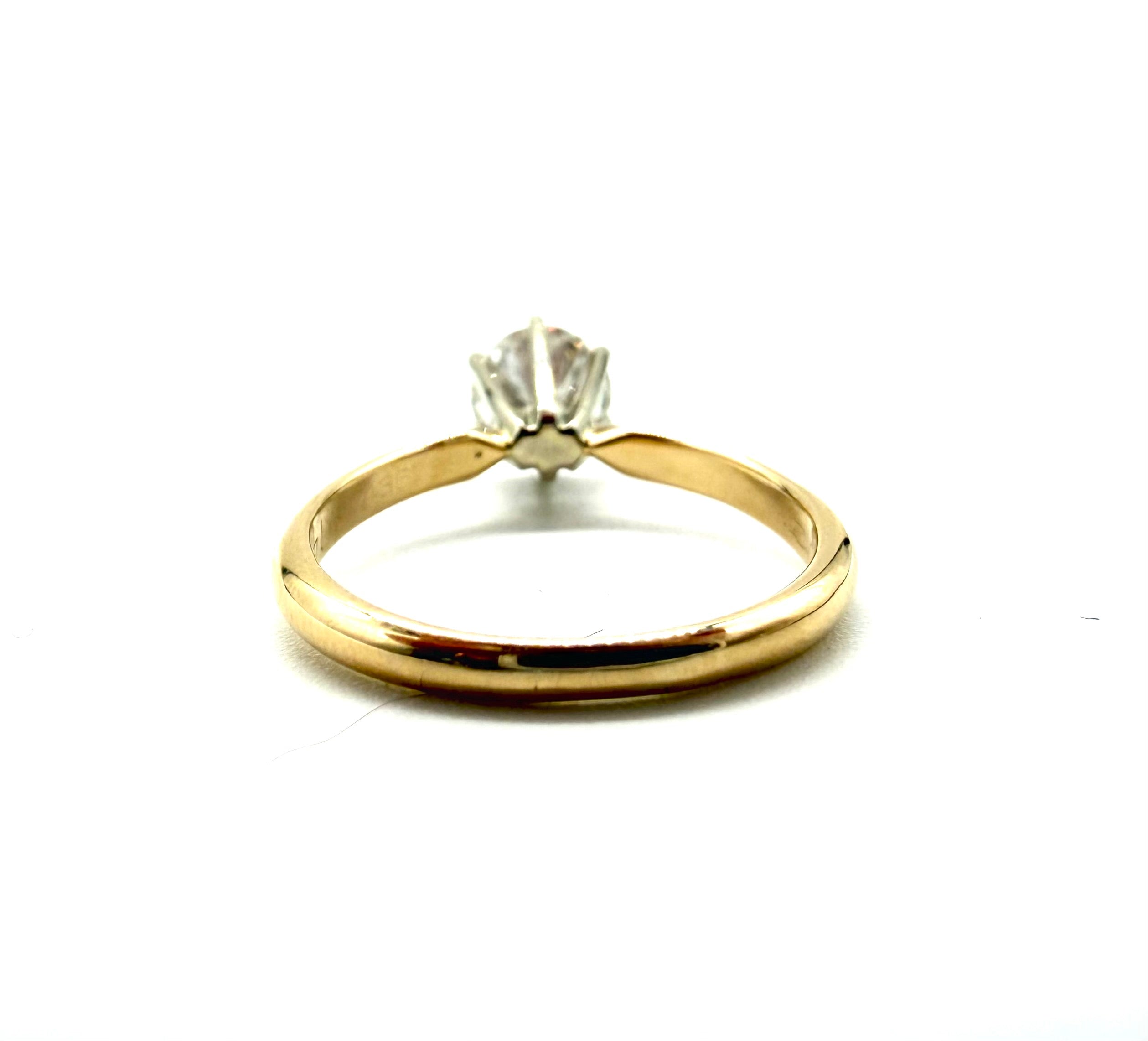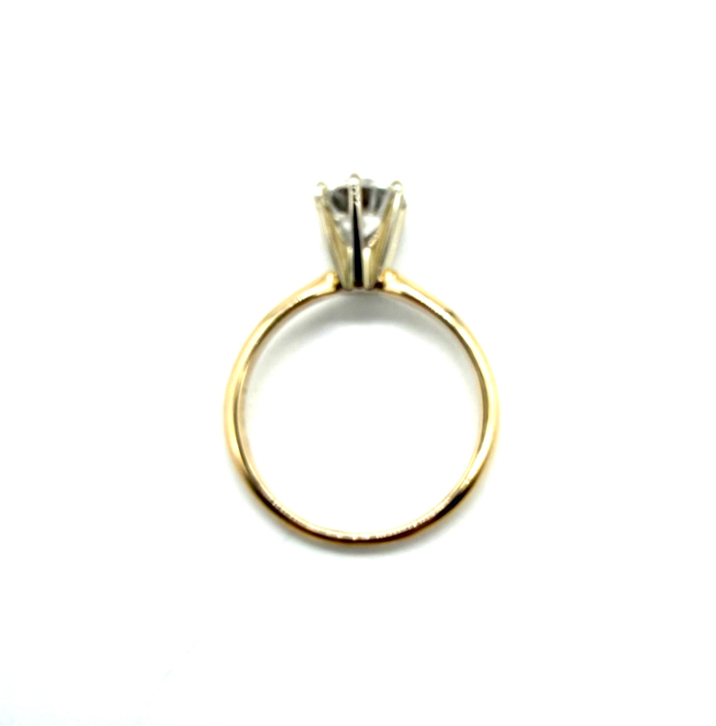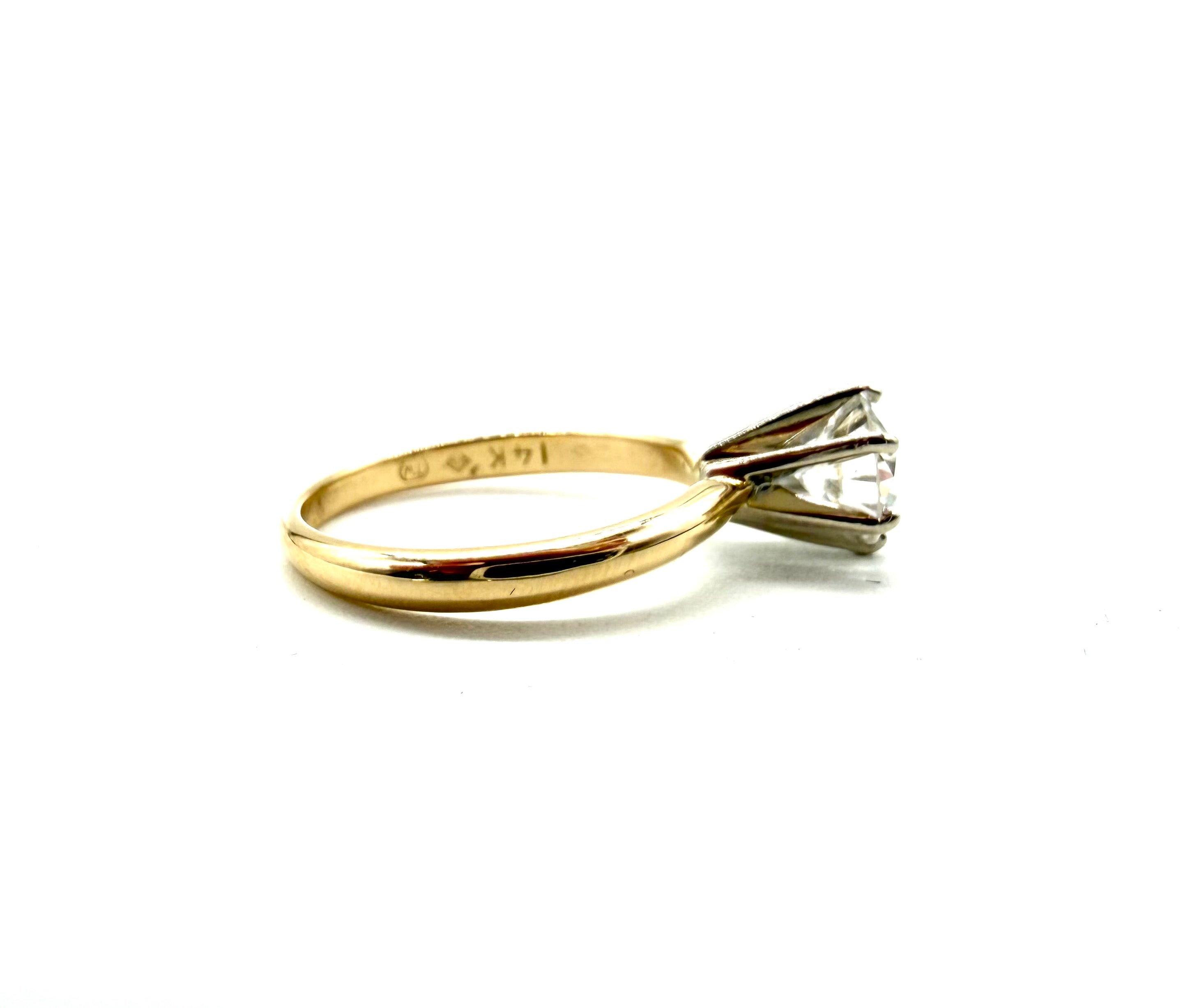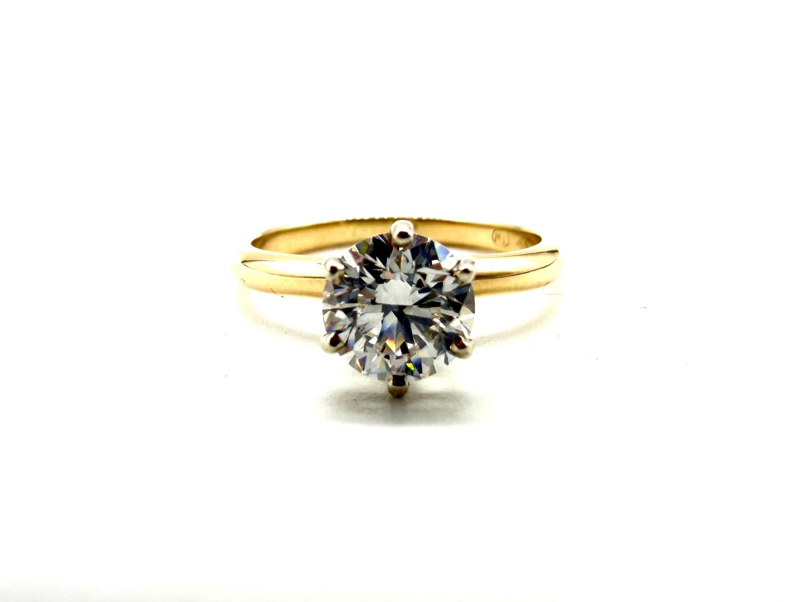 This beautiful one carat round Solitaire lab diamond is set in a 14 karat yellow and white gold Tiffany setting.