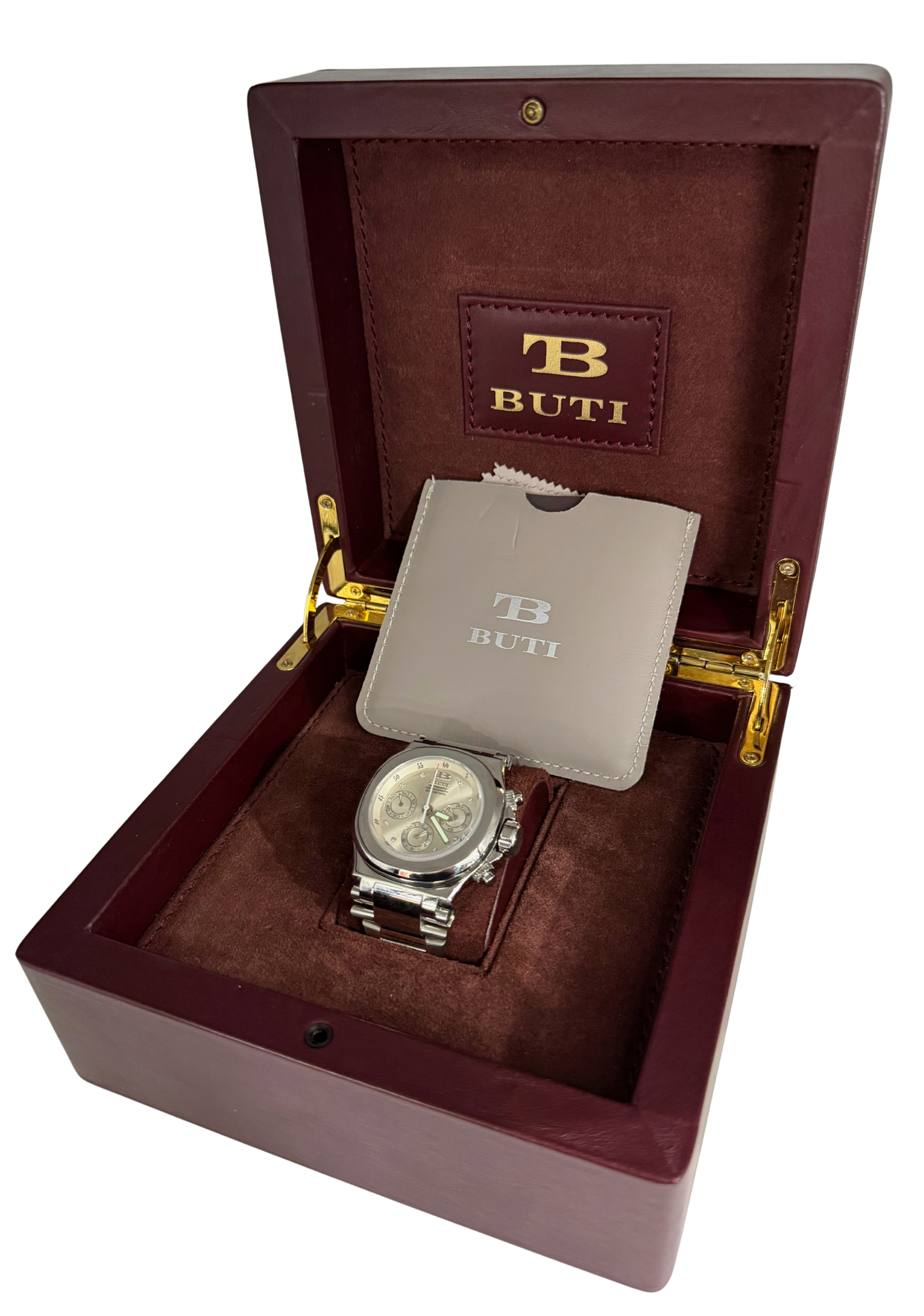 Powered by an automatic movement and rated for water resistance up to 200 meters, this timepiece delivers reliable performance suitable for everyday wear or active use. The signature Buti craftsmanship is evident throughout, from the detailed dial layout to the secure clasp and robust case design.
