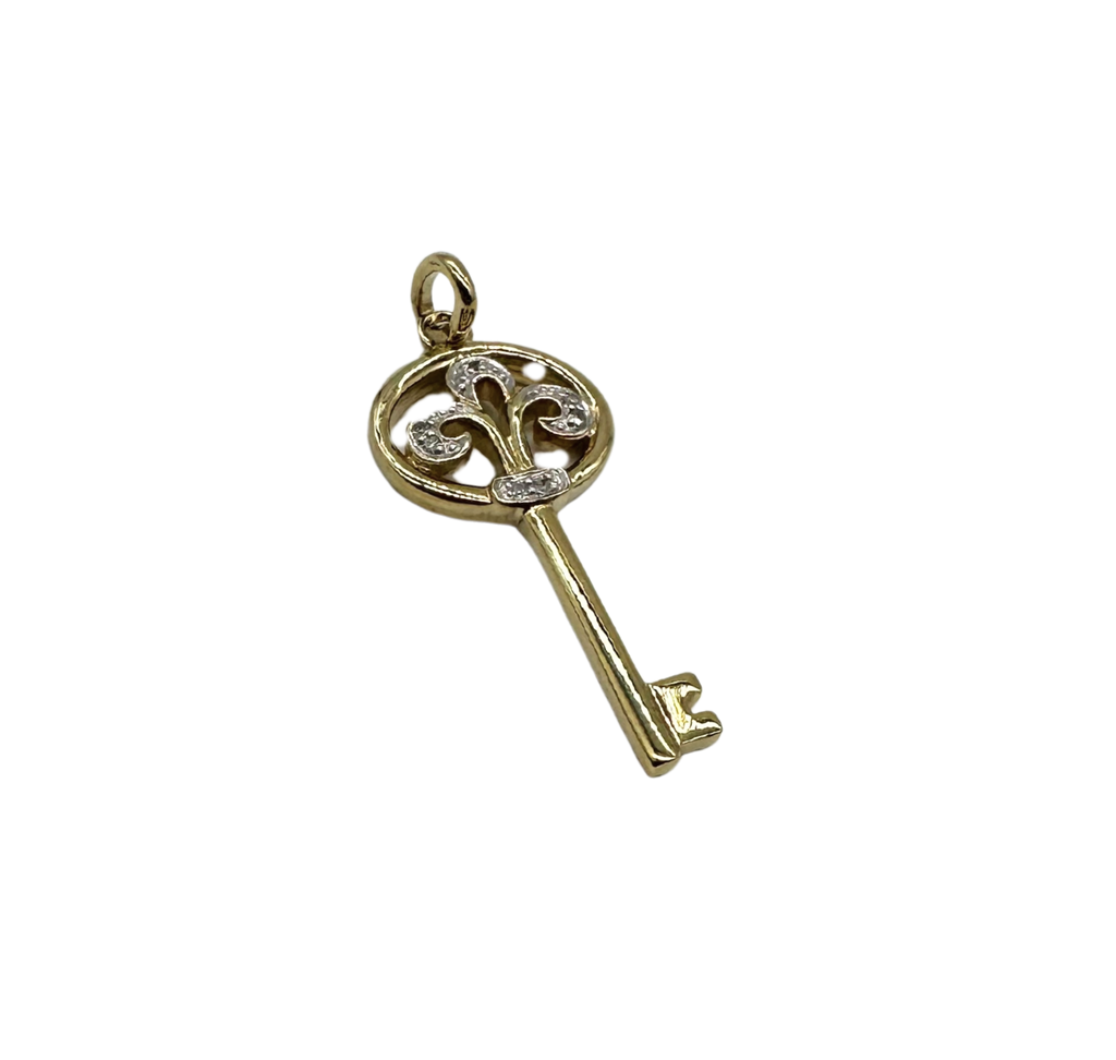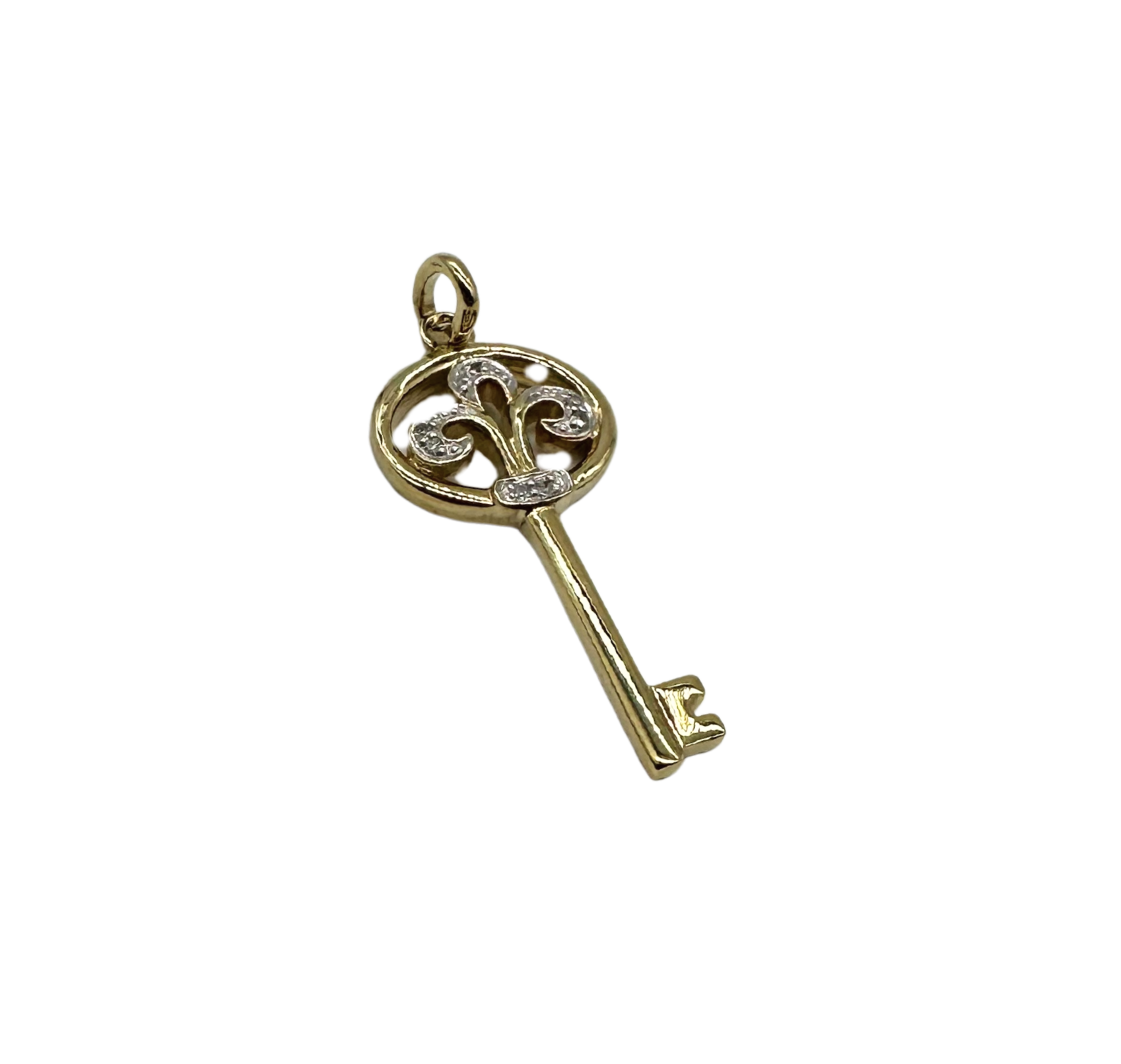 Unlock timeless elegance with this exquisite fleur-de-lis key pendant crafted in 10k yellow and white gold. Featuring a beautifully detailed fleur-de-lis symbol at the top of a classic key design, this 2.3-gram pendant effortlessly combines sophistication and charm.