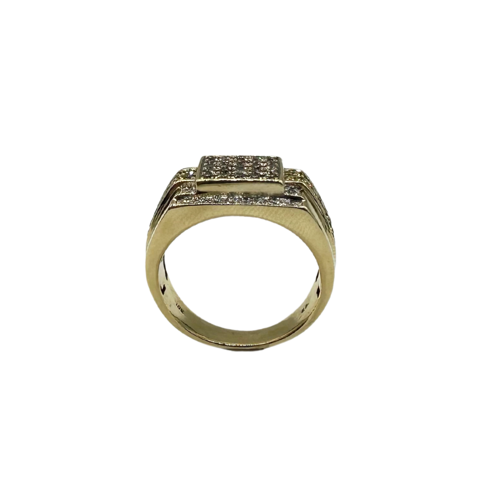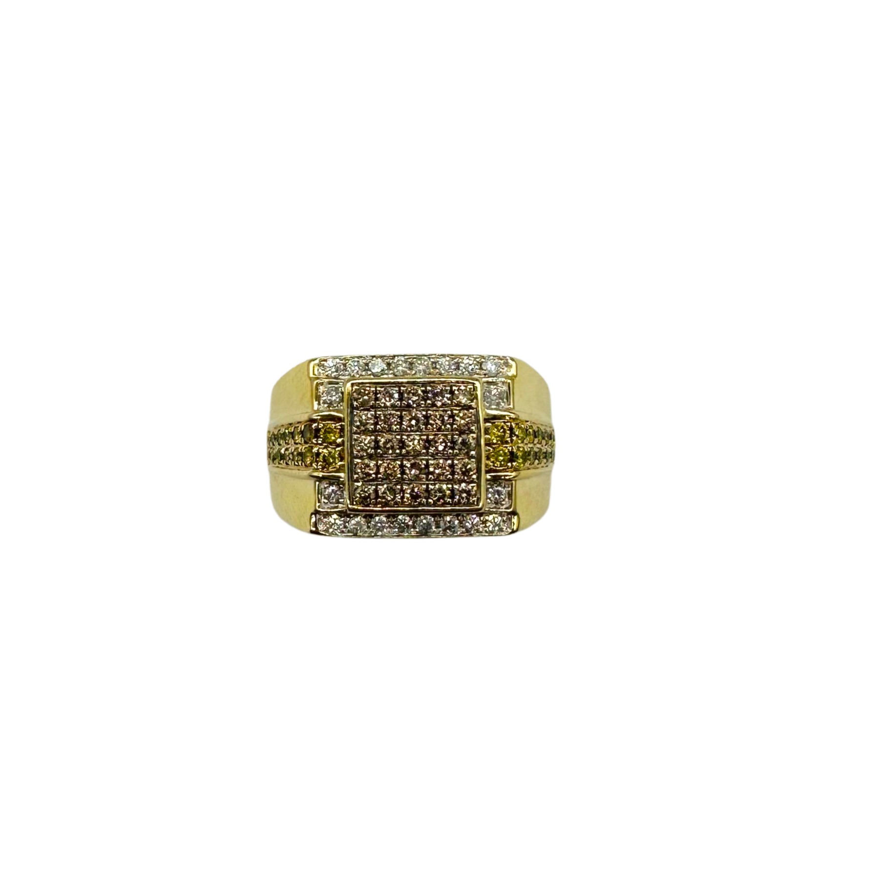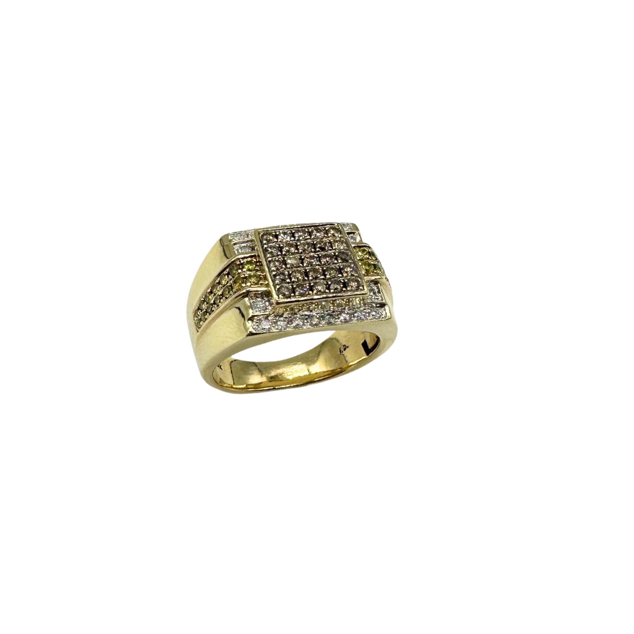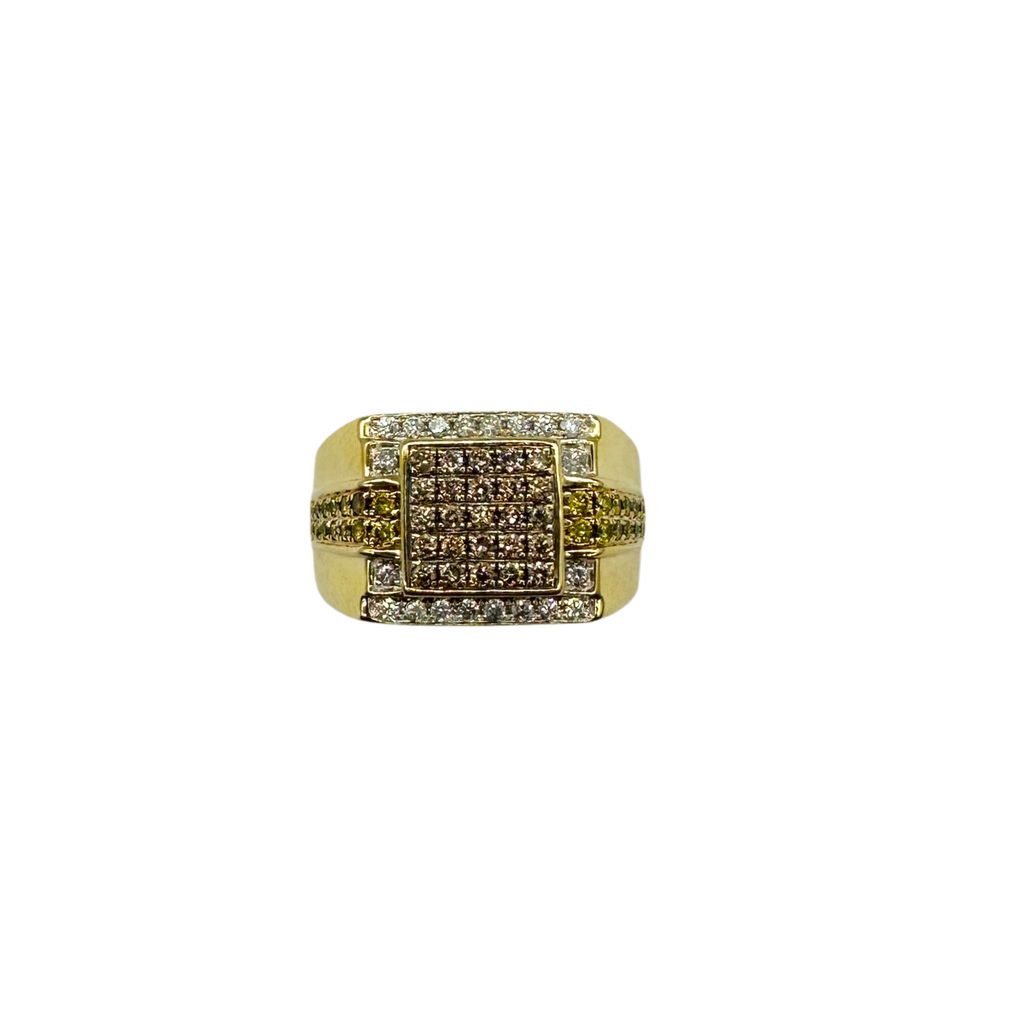 Framing the center are vibrant yellow diamonds flanked by white diamonds on all sides, adding layers of luxurious dimension and contrast. The thick gold band offers a sturdy, masculine feel, ideal for someone who wants to make a strong yet stylish statement. A powerhouse of sparkle and craftsmanship, this ring is perfect for upgrading your look or marking a milestone with style.