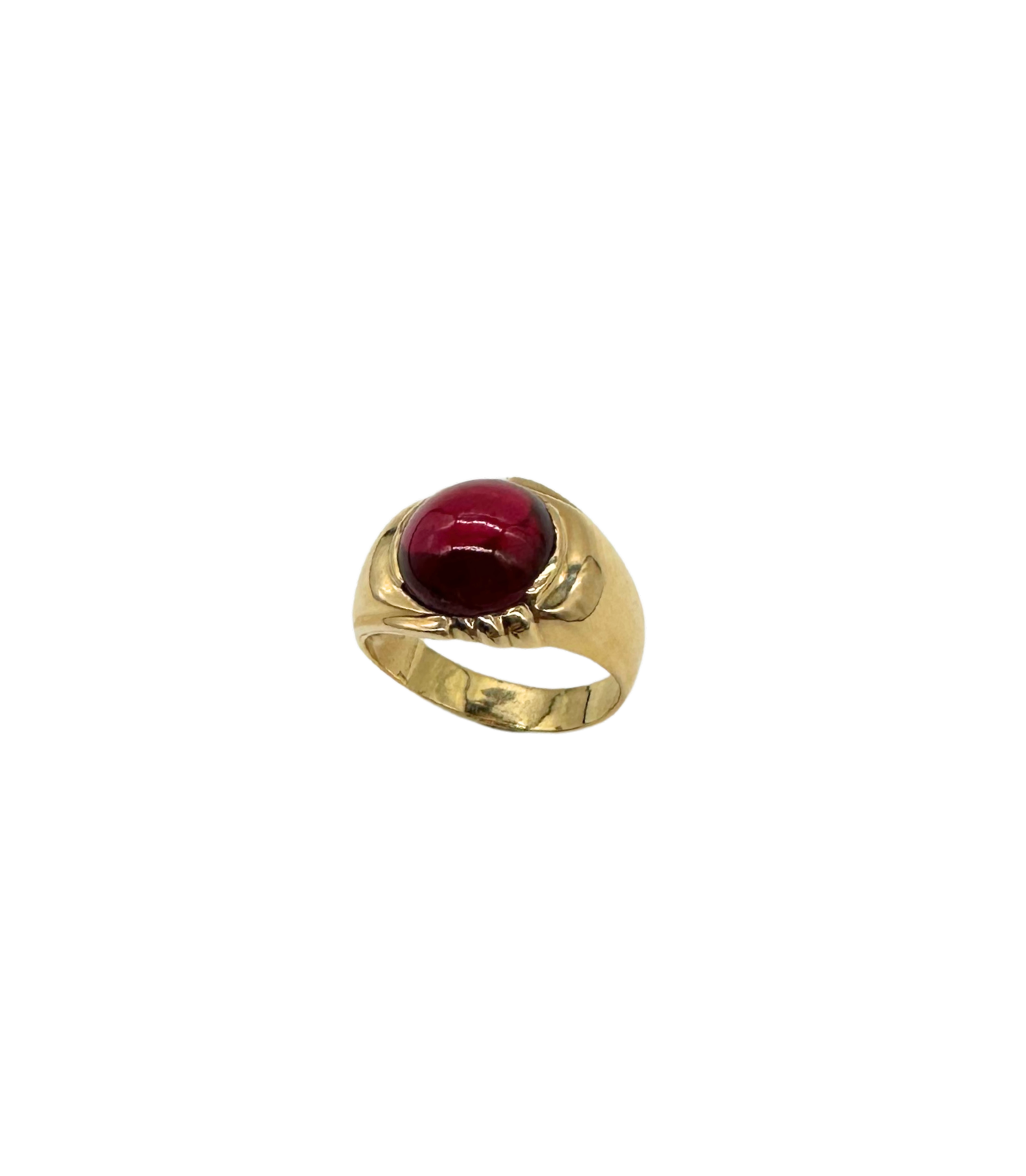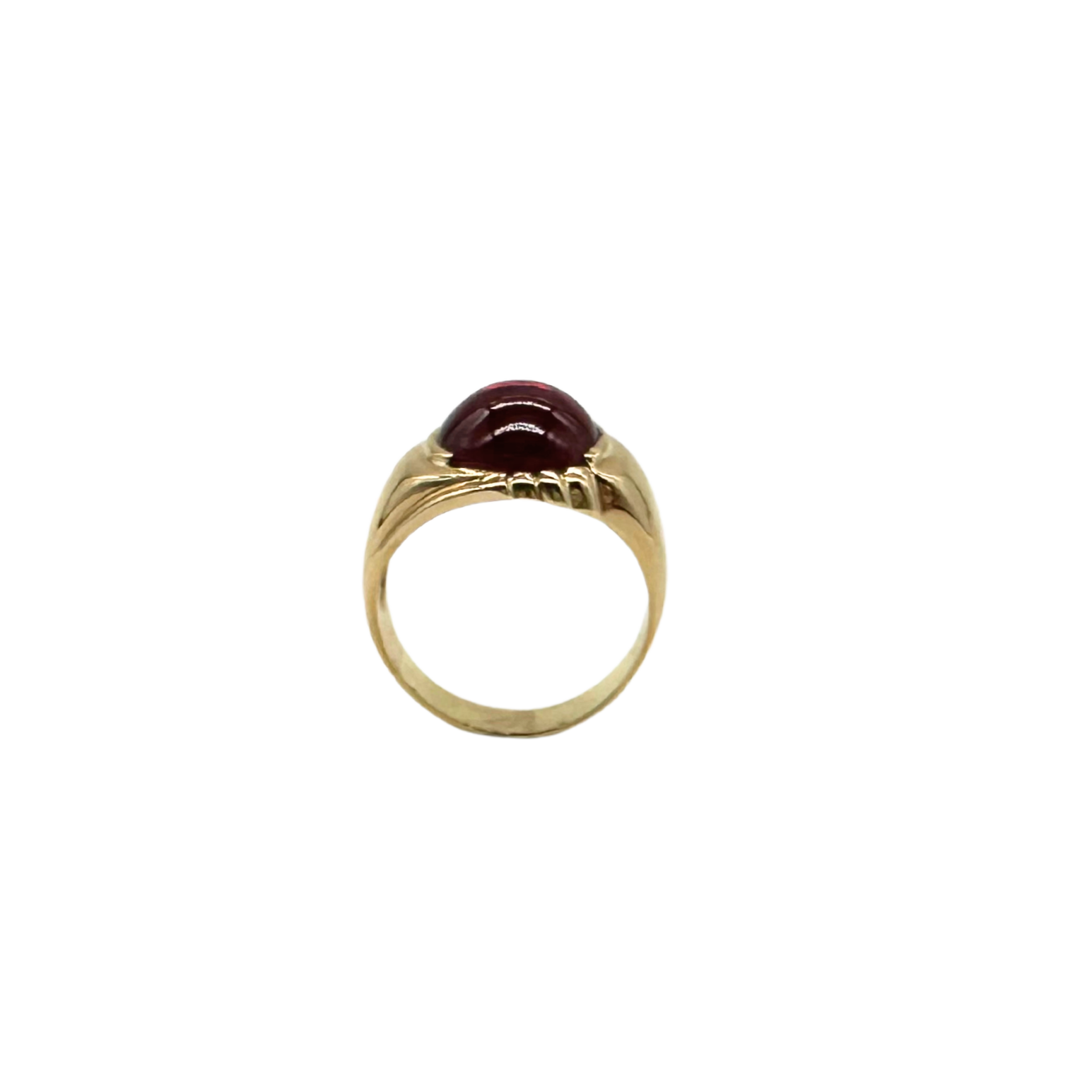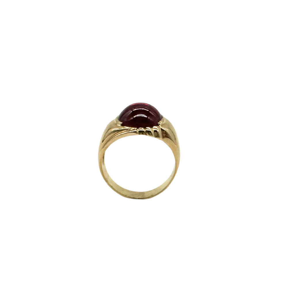 Bold and striking, this 10k yellow gold ring features a deep red cabochon stone set in a smooth, sculpted solitaire-style setting.