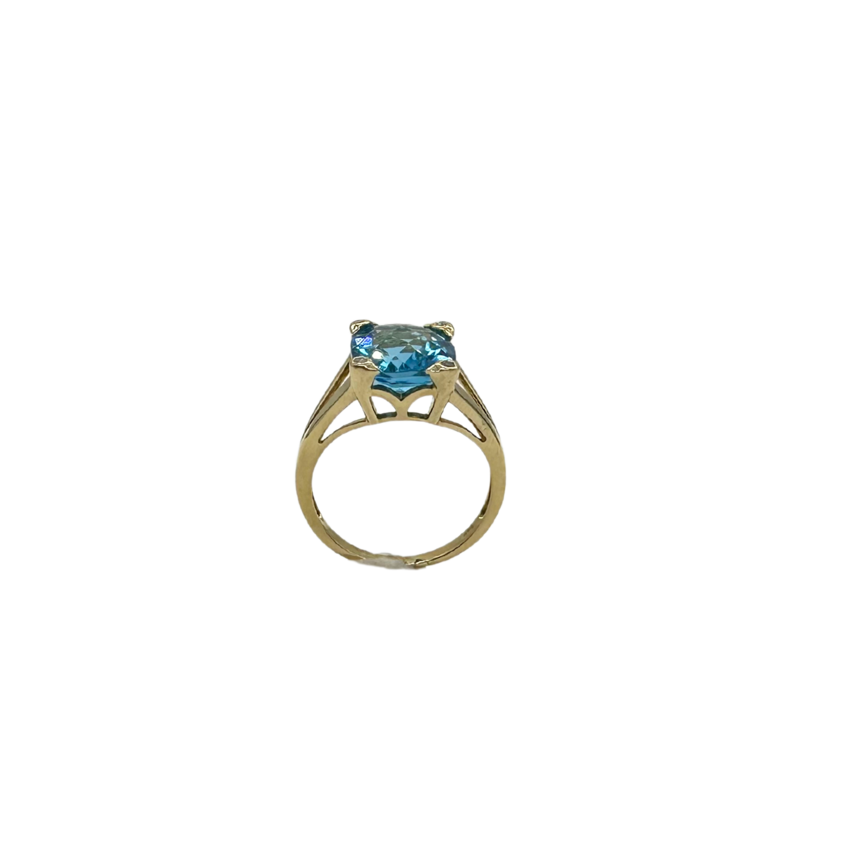 Step into sophistication with this radiant 14k yellow gold ring, showcasing a mesmerizing faceted blue topaz at its center. This captivating gemstone boasts a brilliant sparkle and striking clarity, elevated by a graceful four-prong setting that allows the stone to truly shine. The wide split shoulders of the band draw the eye upward to the topaz, while subtle diamond accents lend just the right touch of shimmer and elegance.