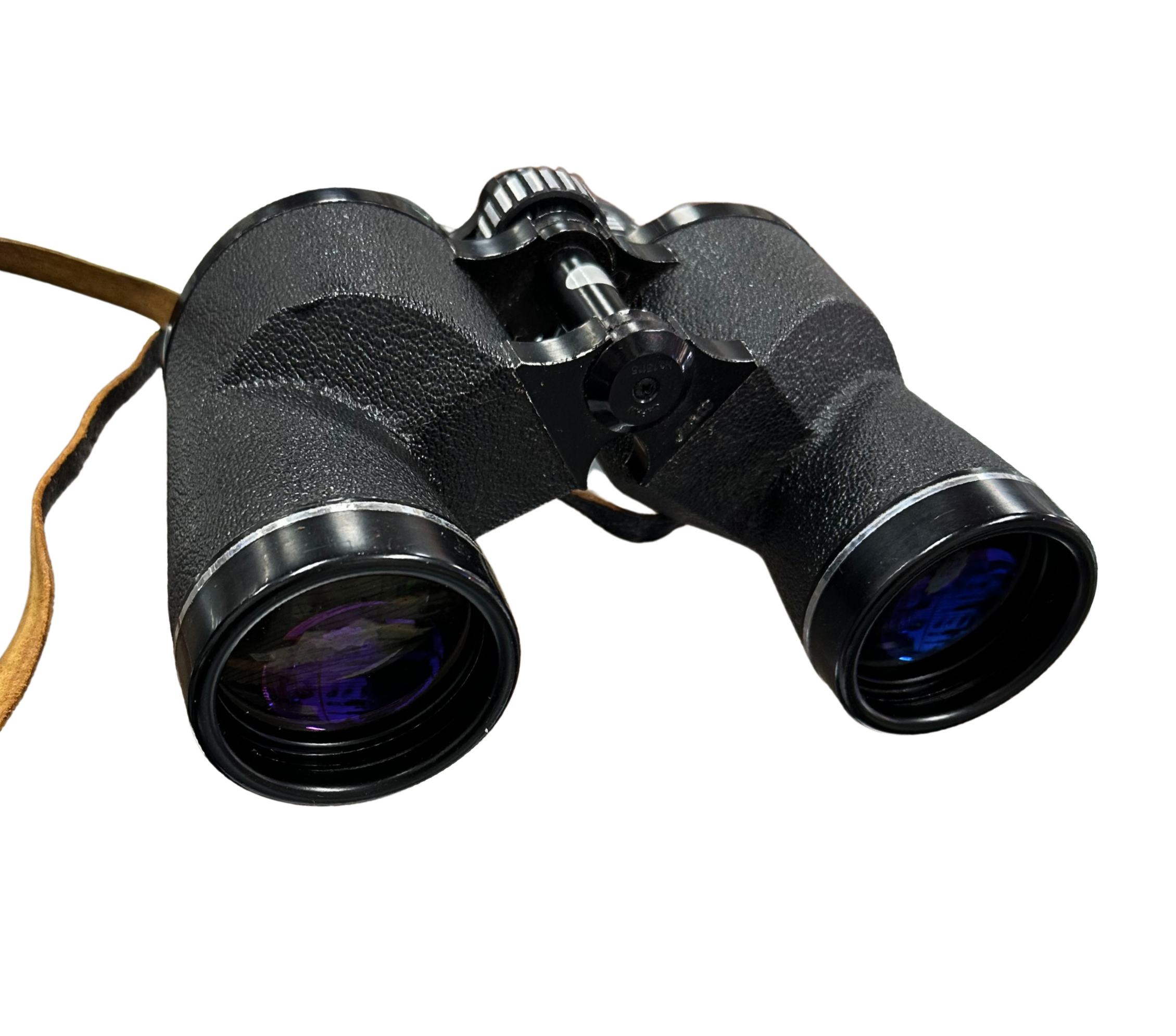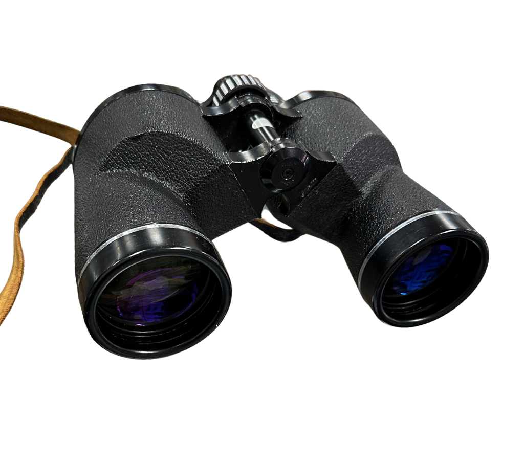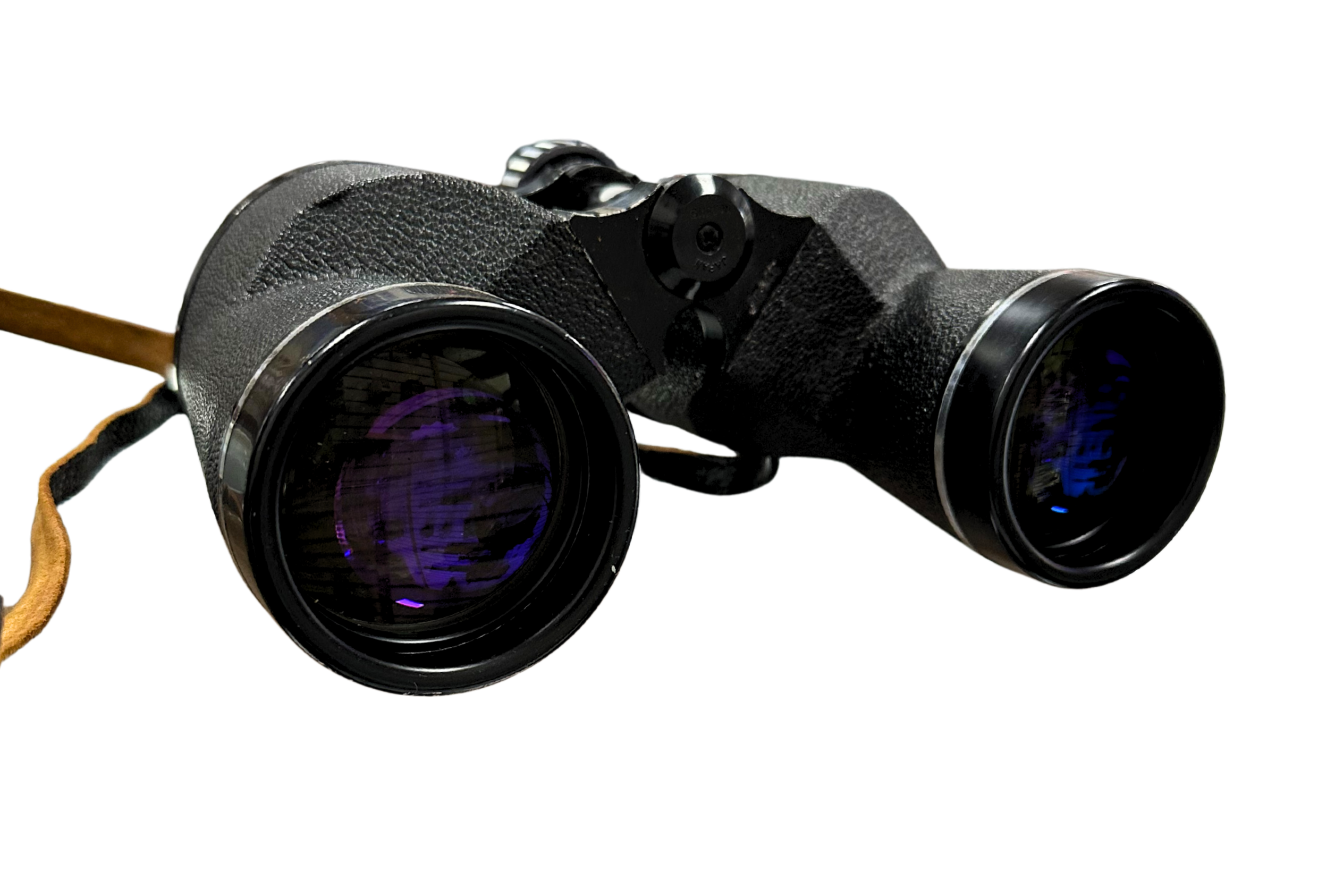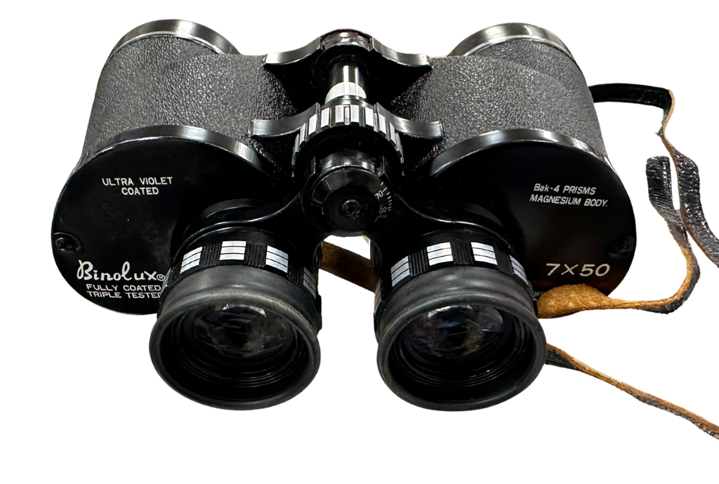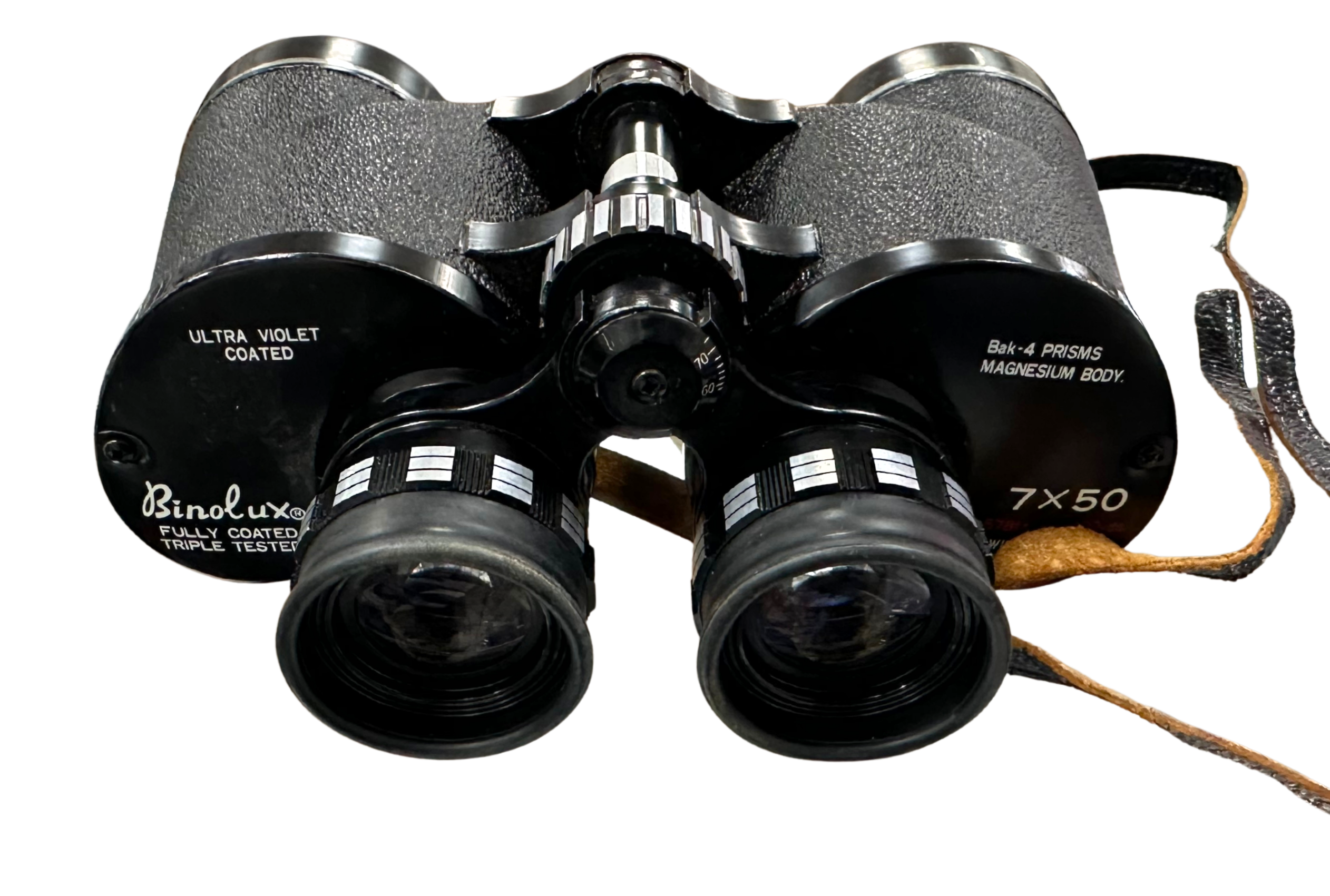 Vintage Binolux 7x50 binoculars featuring fully coated optics with UV protection, BaK-4 prisms, and a sturdy magnesium body.