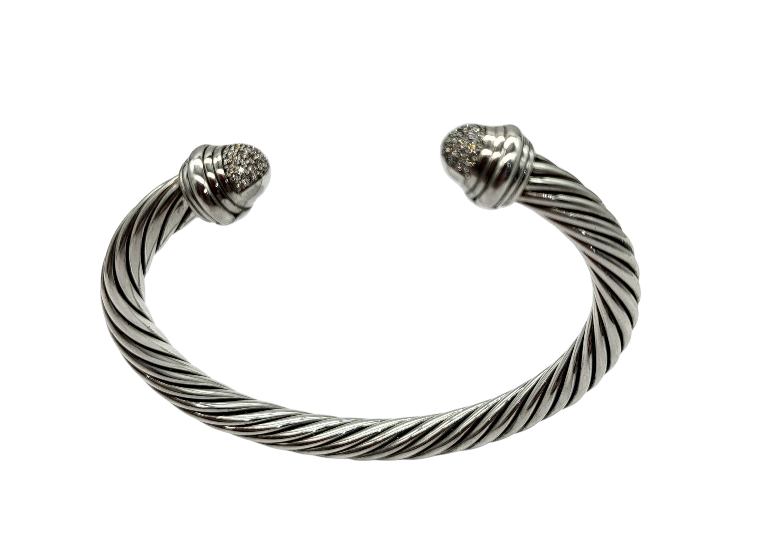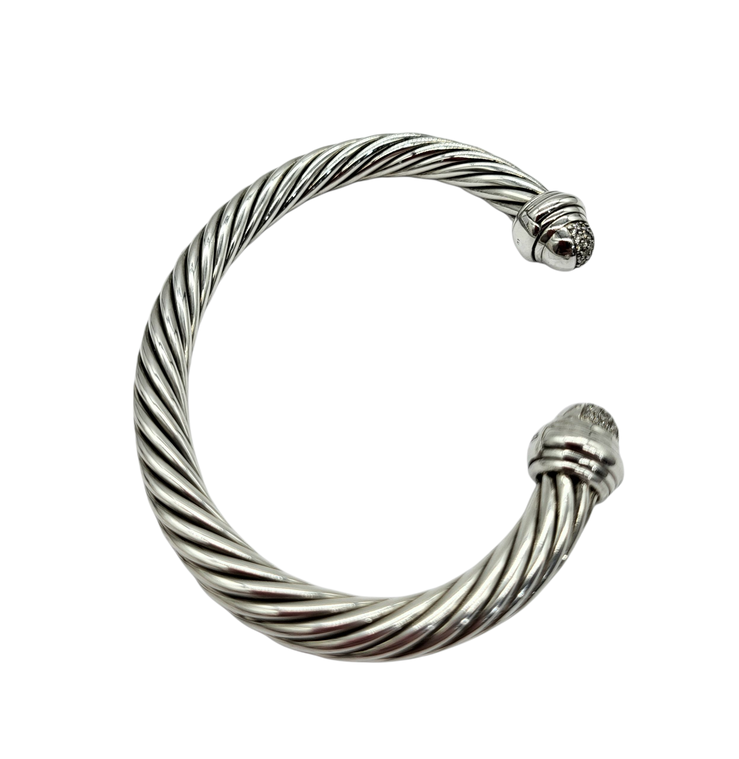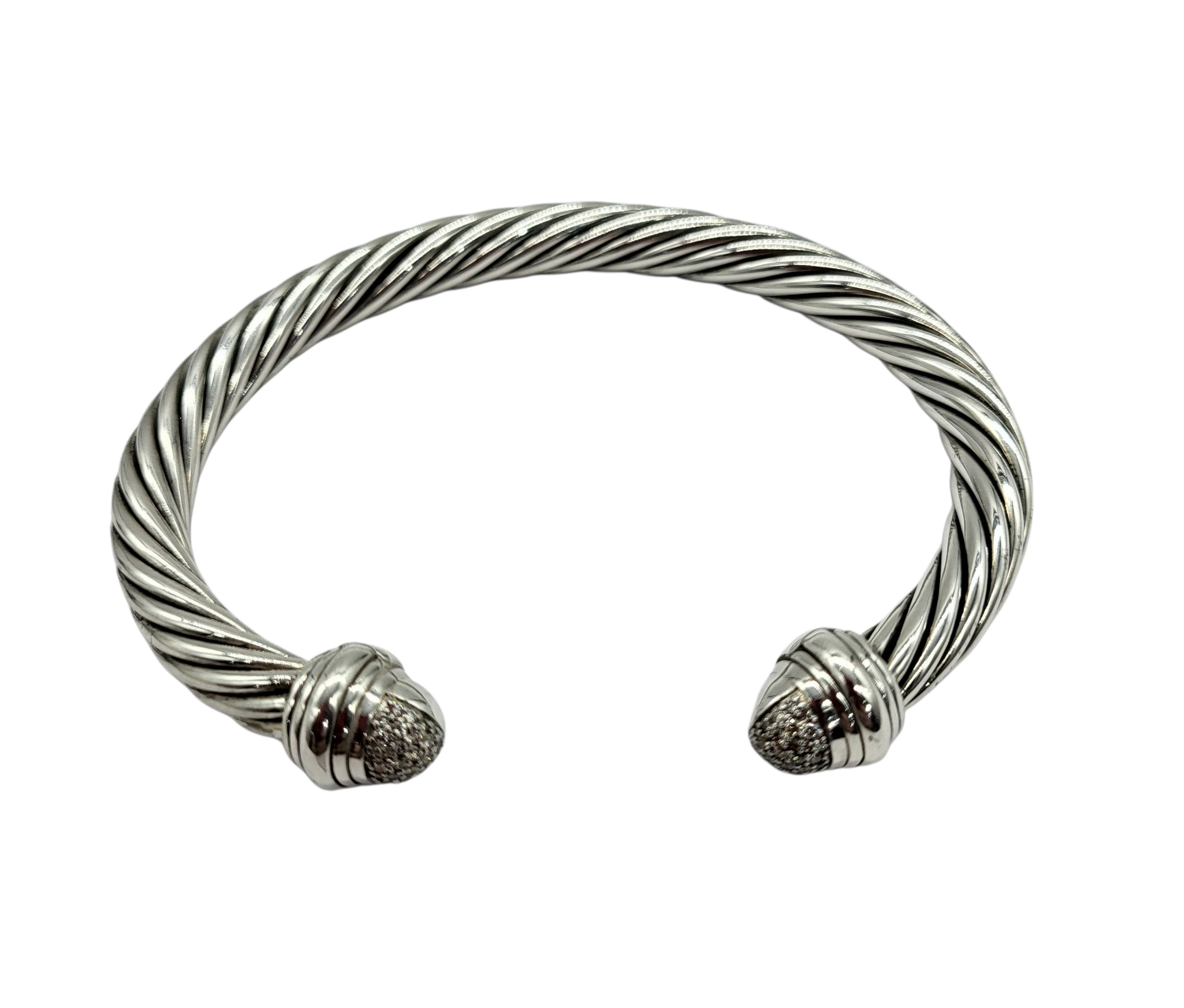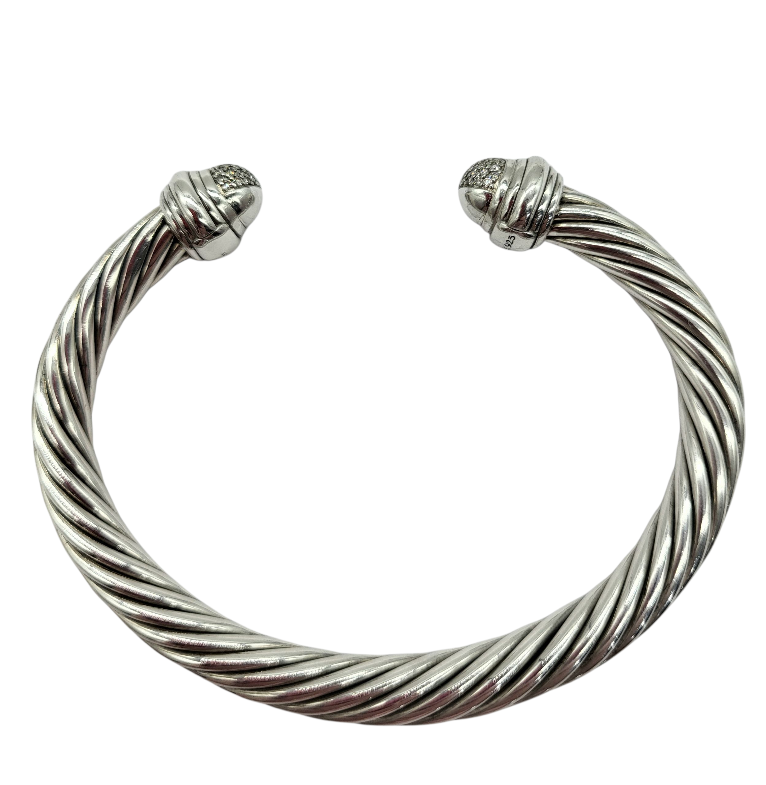 This David Yurman cuff bracelet is expertly crafted with sterling silver and features a unique twisted design. Accented with diamond chips, it adds a touch of luxury to any outfit. A must-have for the fashion-forward individual.