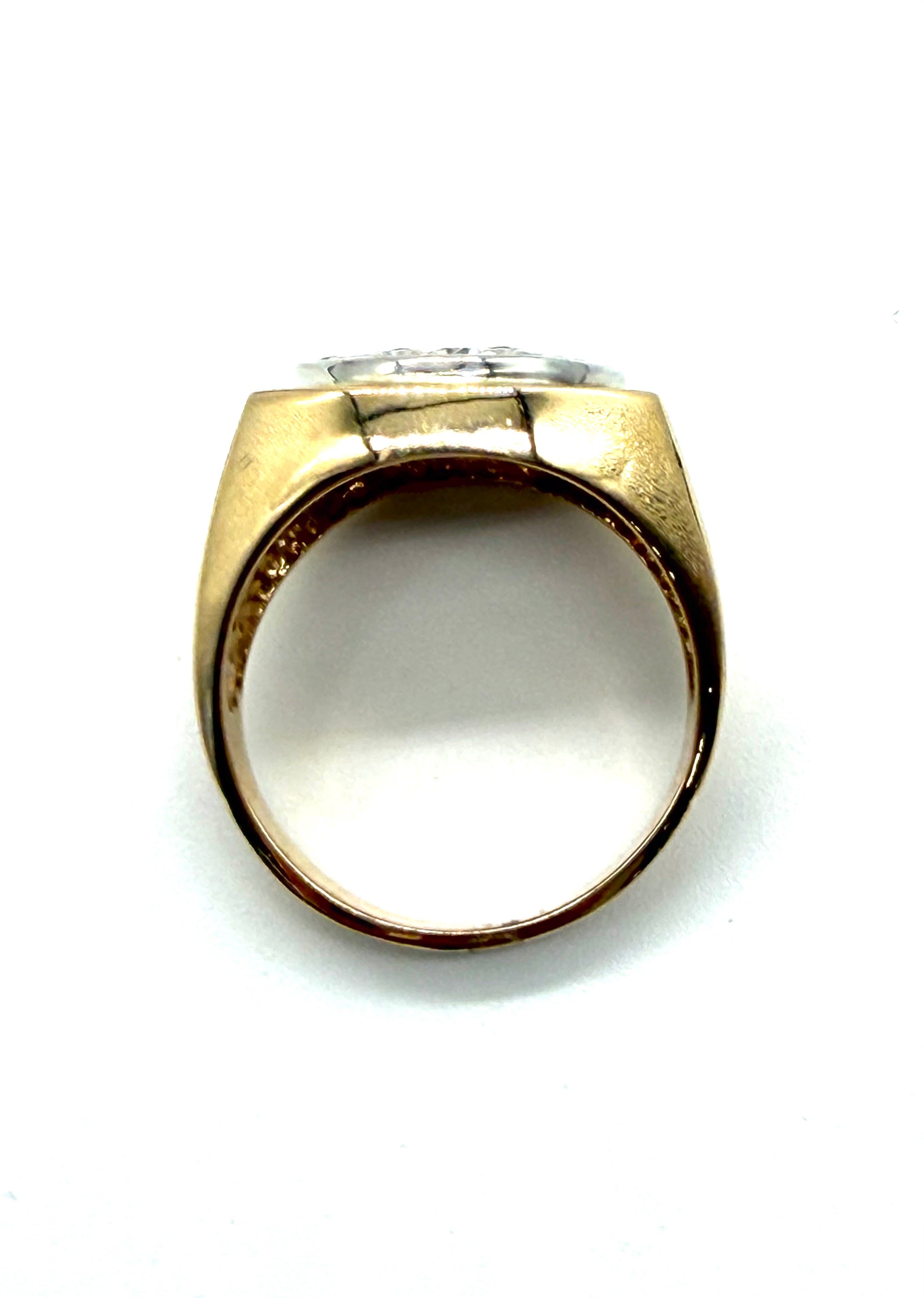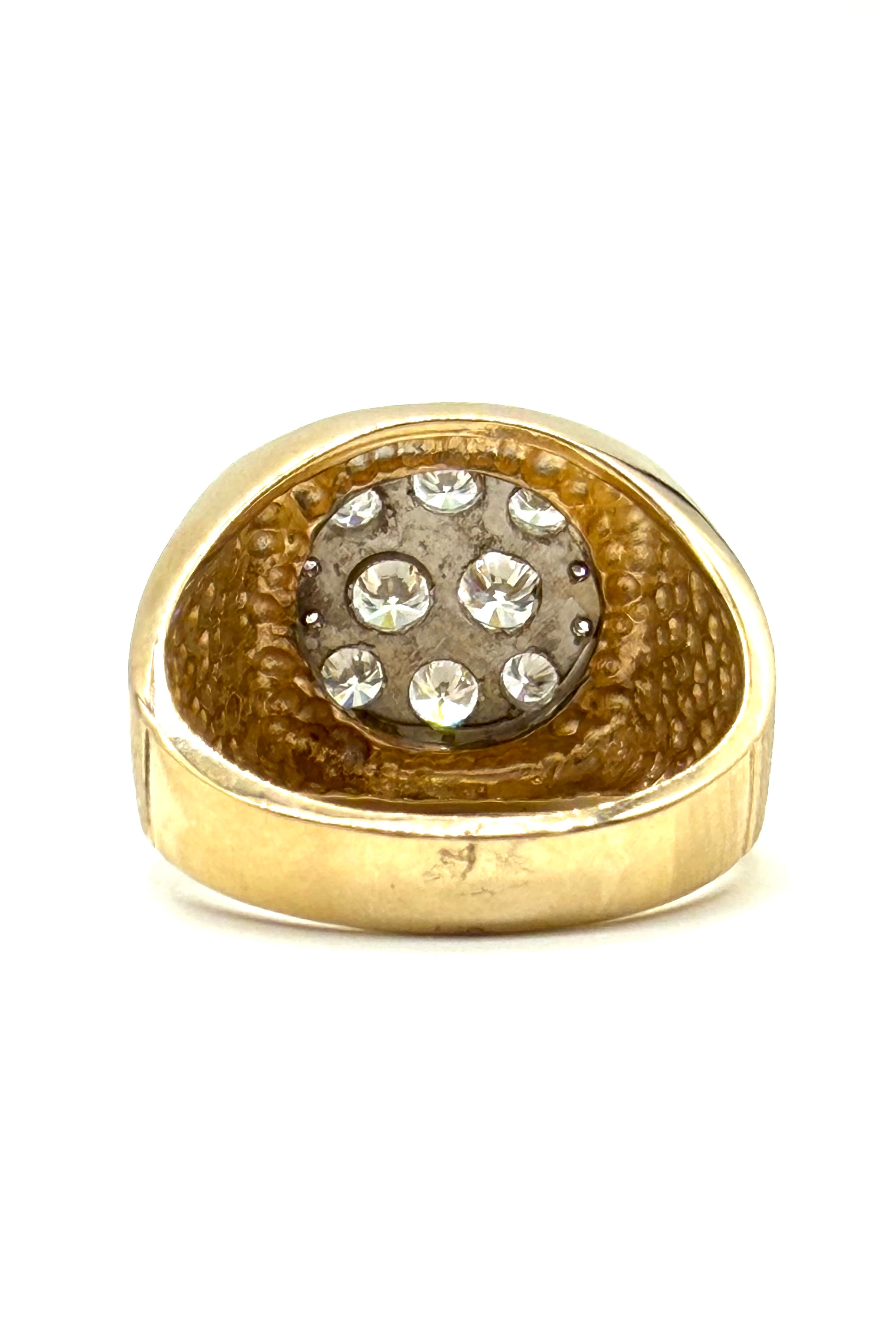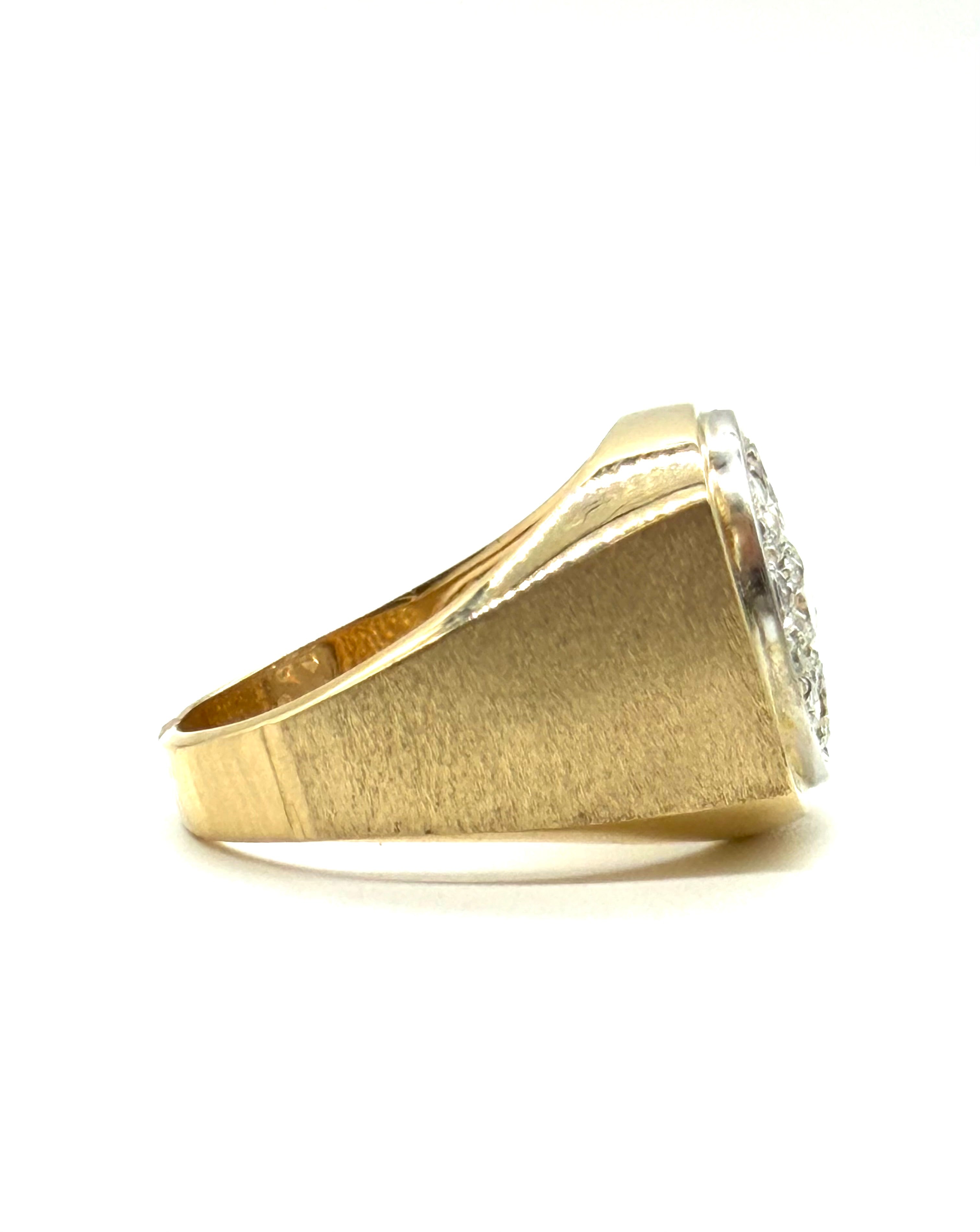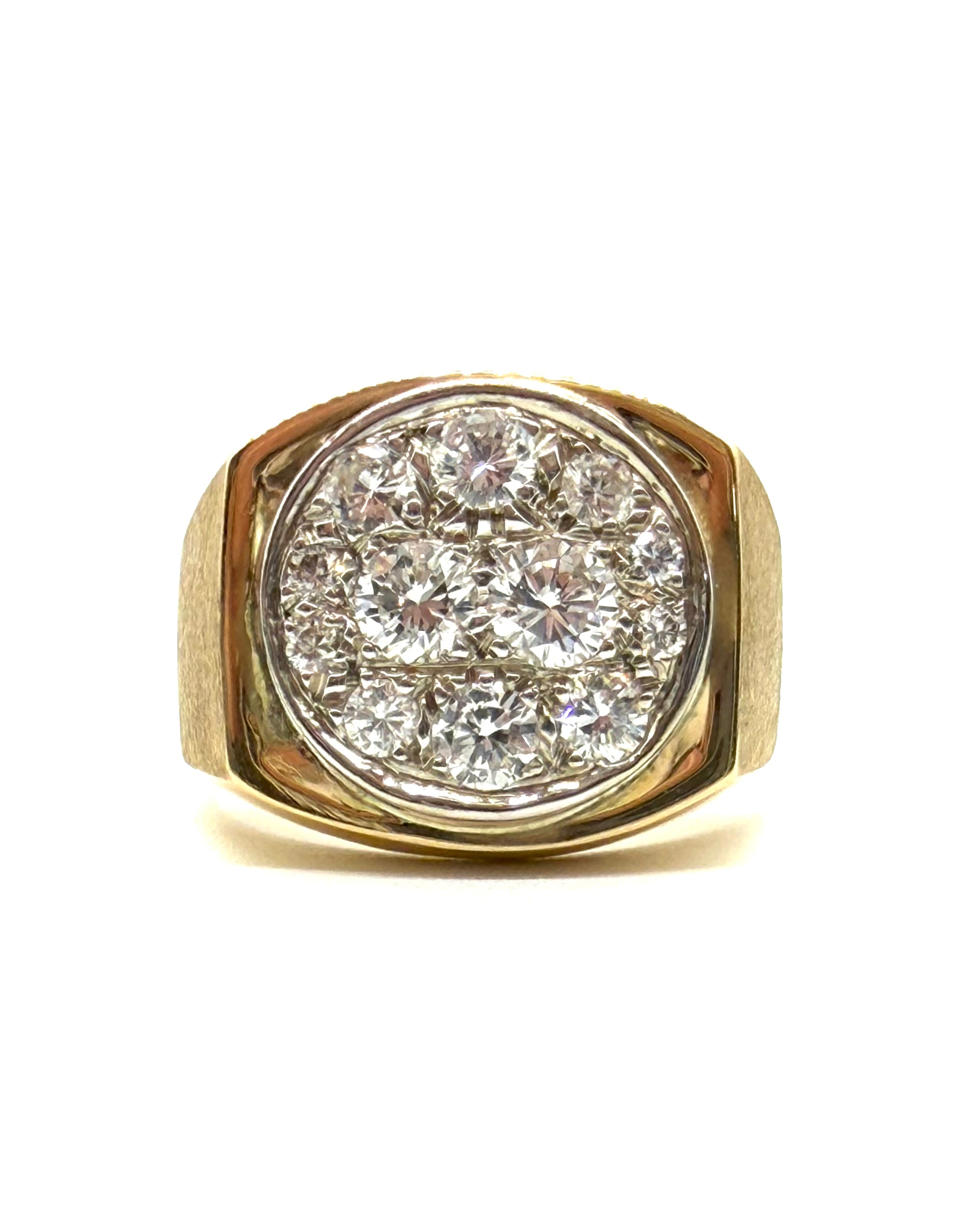 This dapper men’s diamond cluster ring is set with a total of 1.50 carats of diamonds in 14 karat yellow gold.