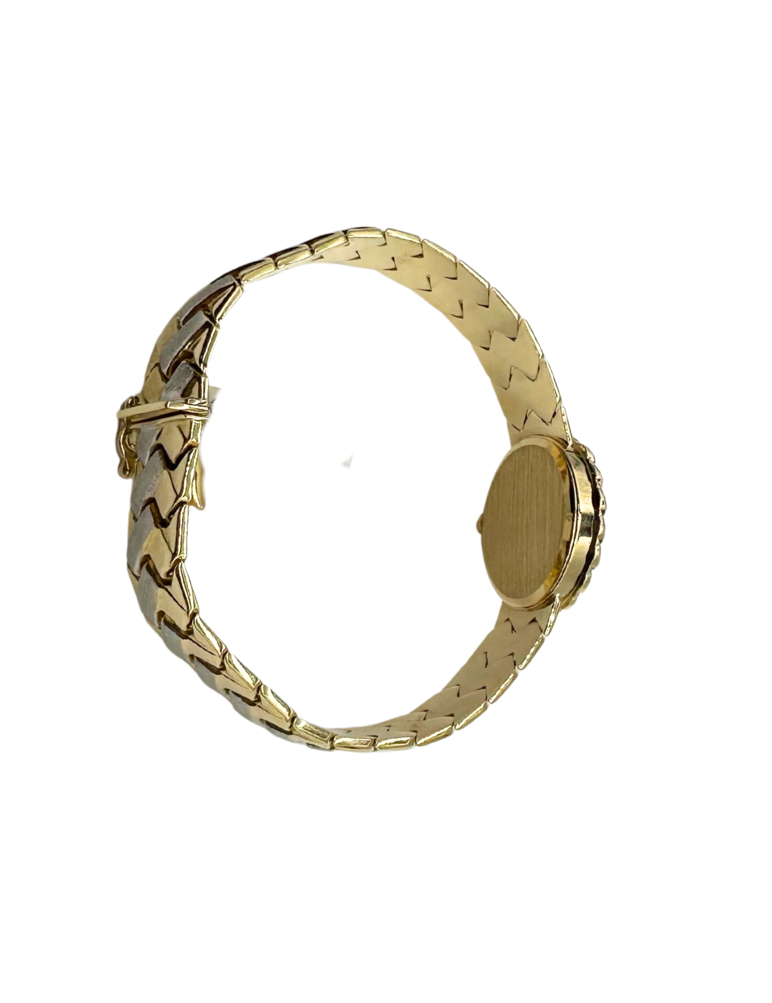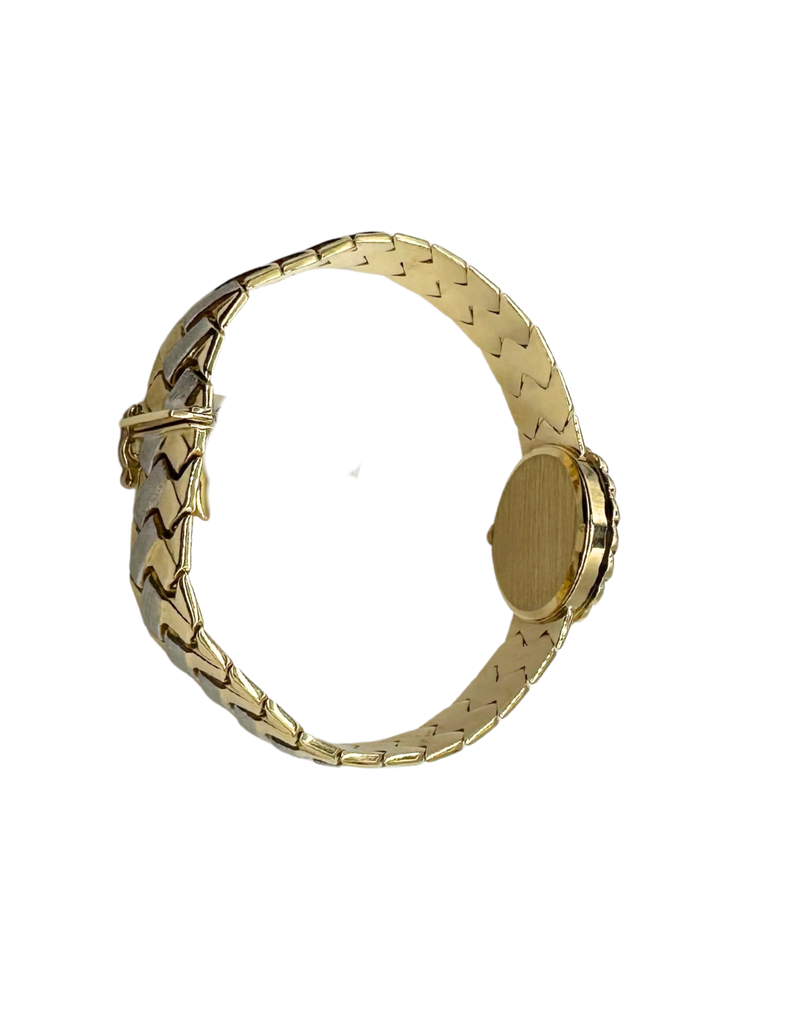 Add a touch of vintage glamour with this elegant Michael Anthony ladies' wristwatch. Crafted in solid 14K yellow and white gold, the bracelet features a textured and polished chevron pattern that complements the oval face.