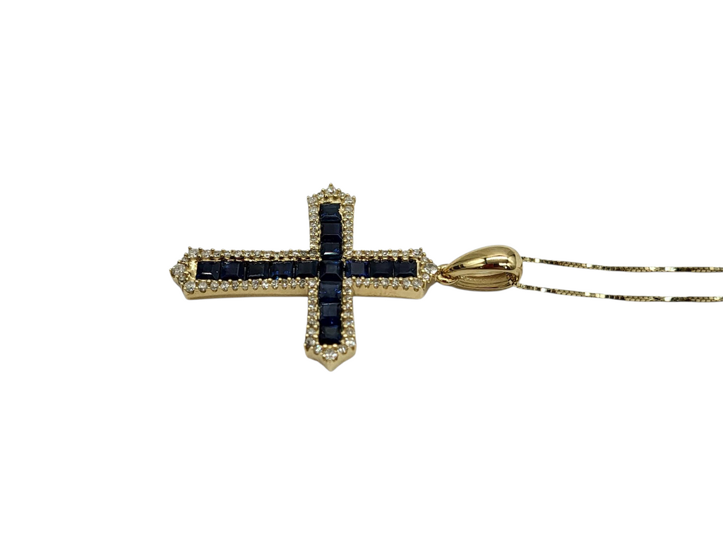 Shine with this new Sapphire and Diamond Cross Pendant, adorned with princess cut sapphires and a border of round diamonds. Paired with a 14k yellow gold chain, this piece is a heavenly addition to any outfit. Bless up.